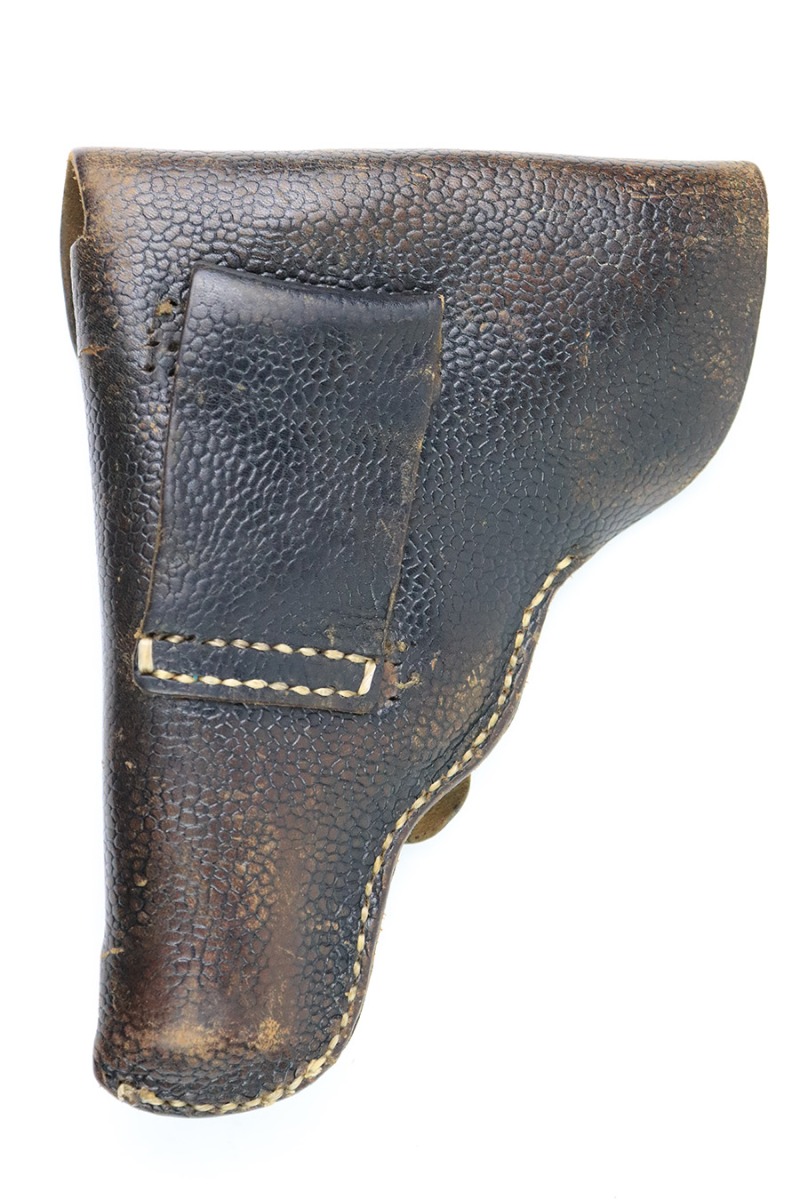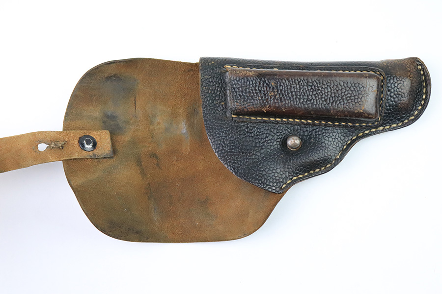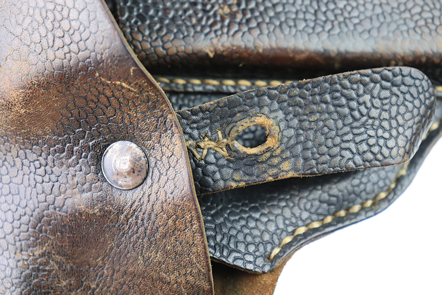 12/21/22 – This is an original WW2 production CZ model 27 holster. The holster has pebble grain style leather with no visible markings or stamps. There’s some mild finish loss and surface wear throughout the leather, as well as pliability from previous use and aging. The back belt loop has replacement stitching, but the rest of the stitching is original. The closure strap has added stitching for a small closure hole as shown.