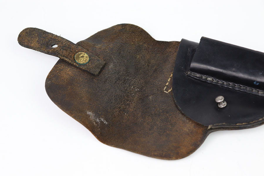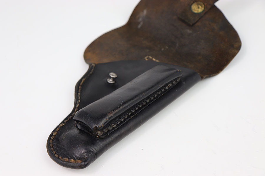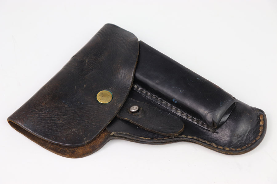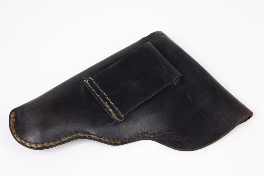2/23/24 – This is an original CZ 27 Holster. The leather of this holster is black in color and in near minty condition. This holster shows very little sign of wear indicating it has a very little use. This holster is unmarked. Overall a great piece.