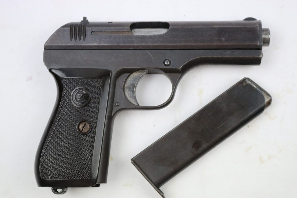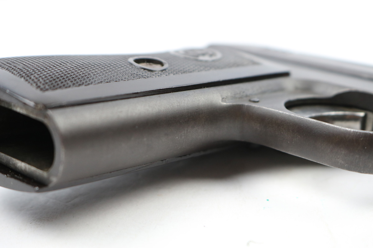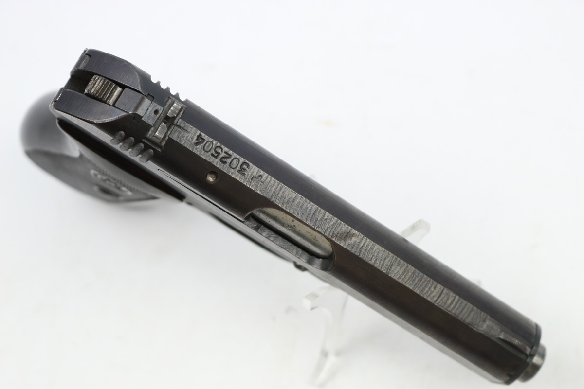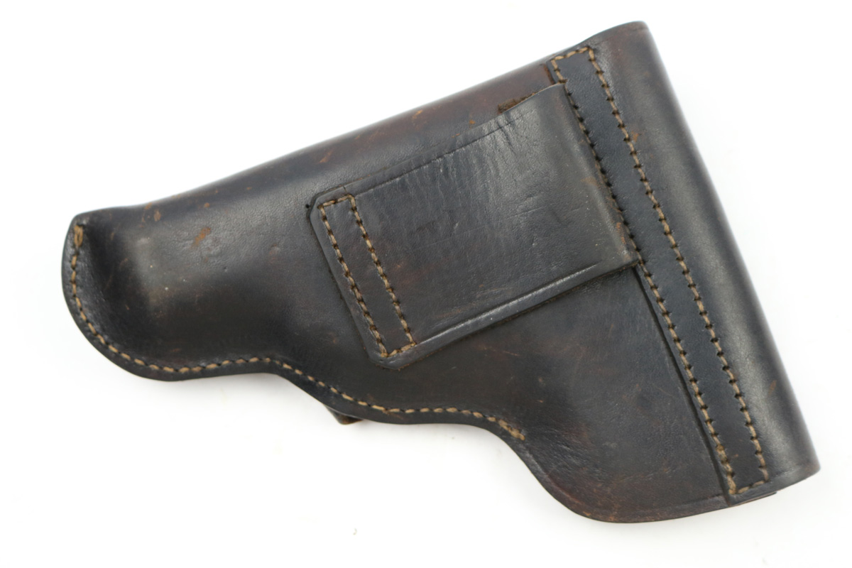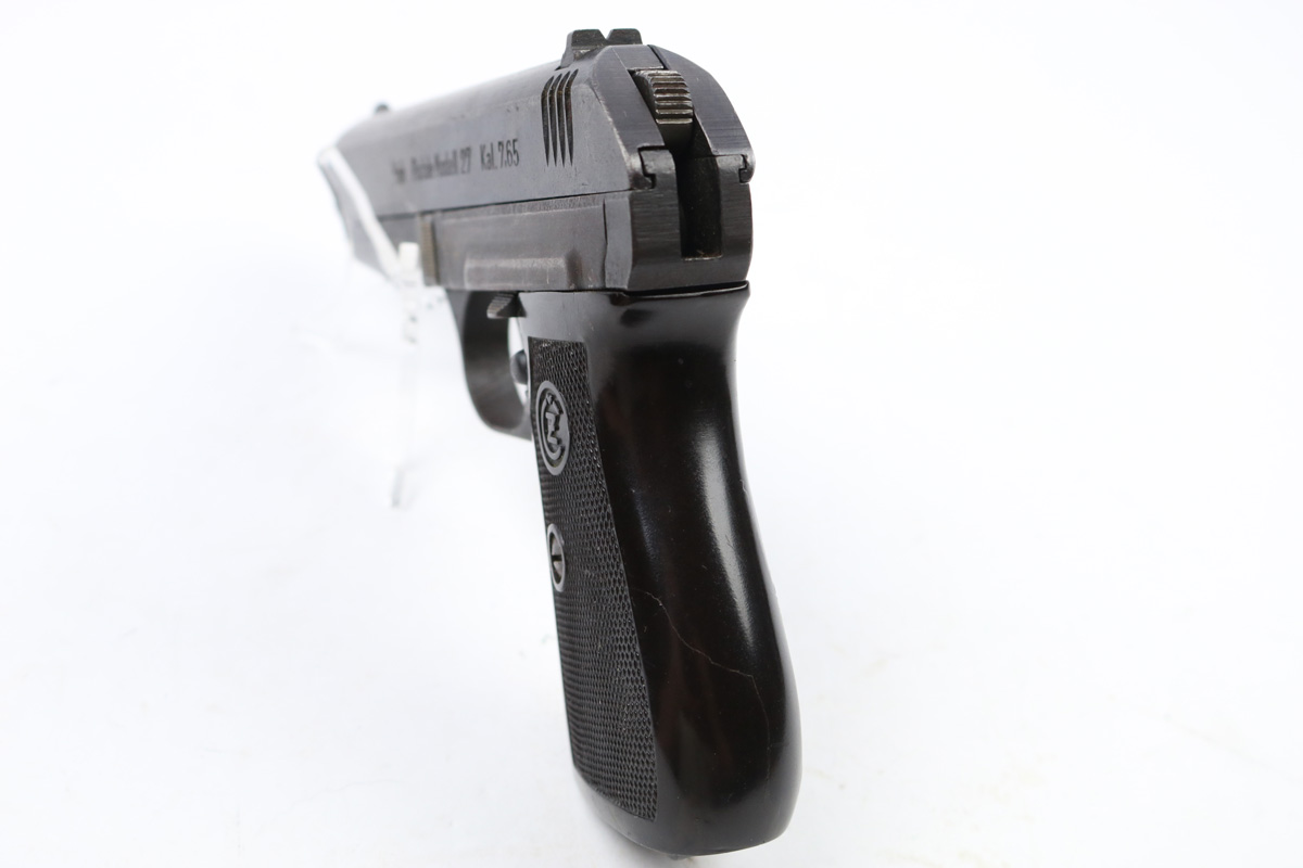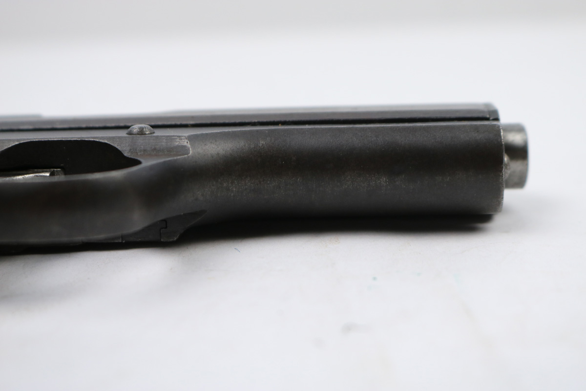 8/16/17 – This is an original CZ model 27 pistol with an original holster from WW2. The pistol has a rough factory original blued finish, which makes grading difficult. However, the finish seems complete and all original with no major flaws. There is some trigger wear and discoloration/darkening, but the frame and slide have nice finish with minimal use/aging flaws. The grip is in great shape with a very minor surface crack on the left side going towards the screw hole, and another hairline crack or scratch the back spine. Please see photos. The bore is excellent with sharp rifling. The holster is unmarked but period correct and original.
