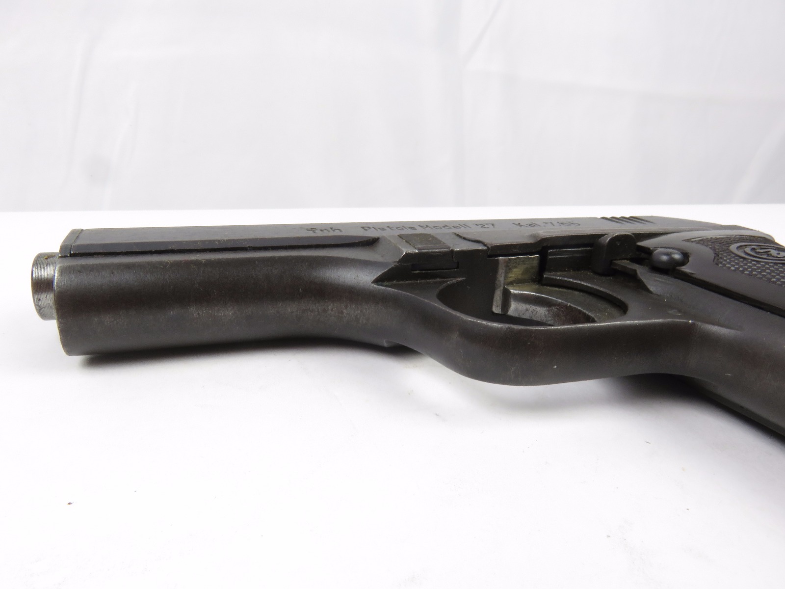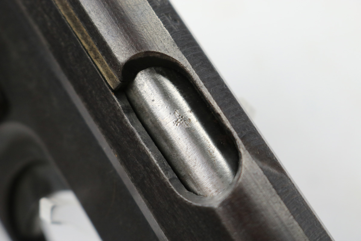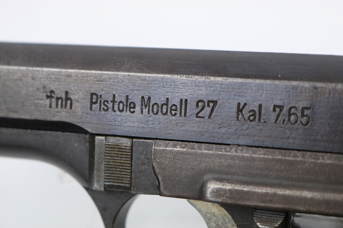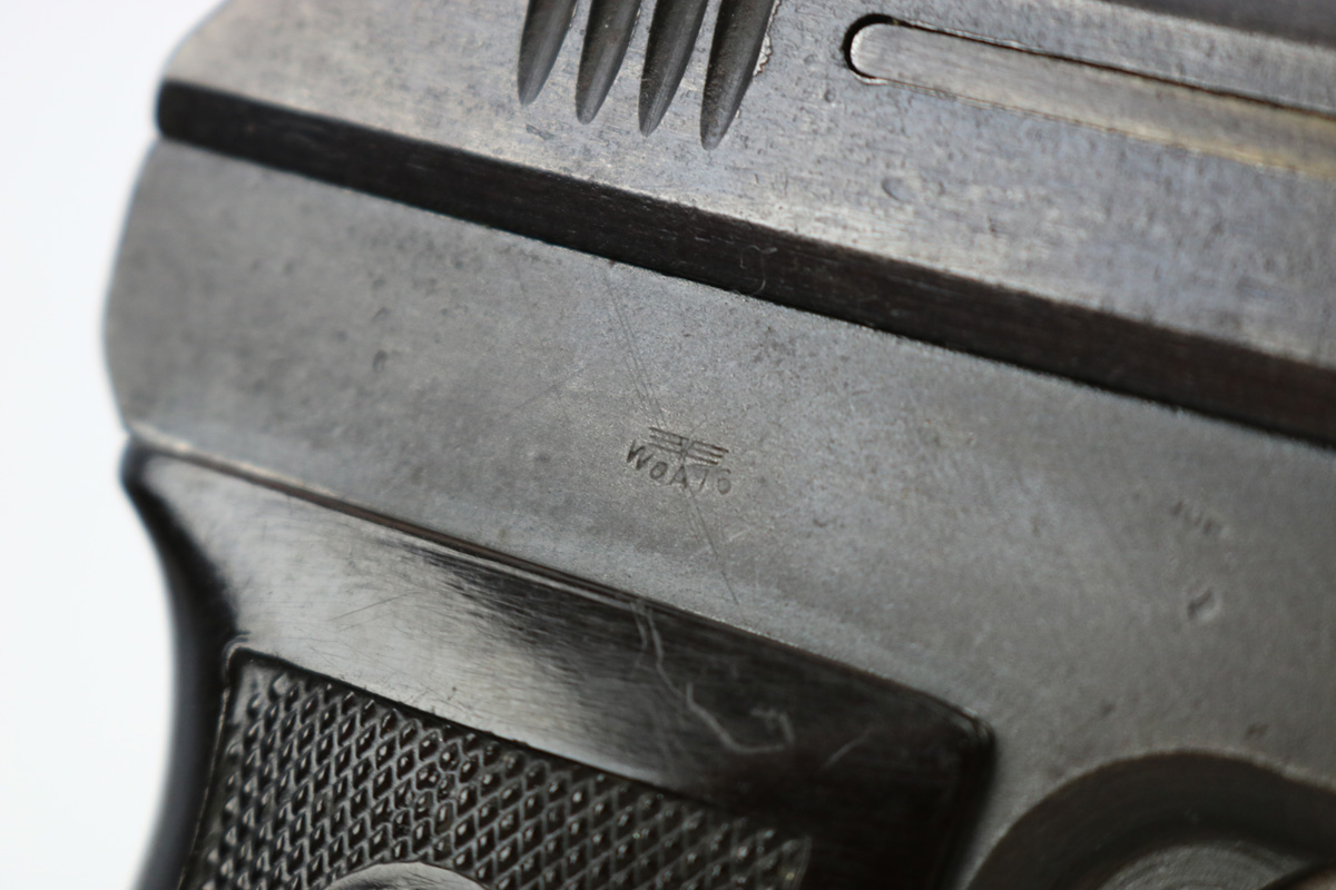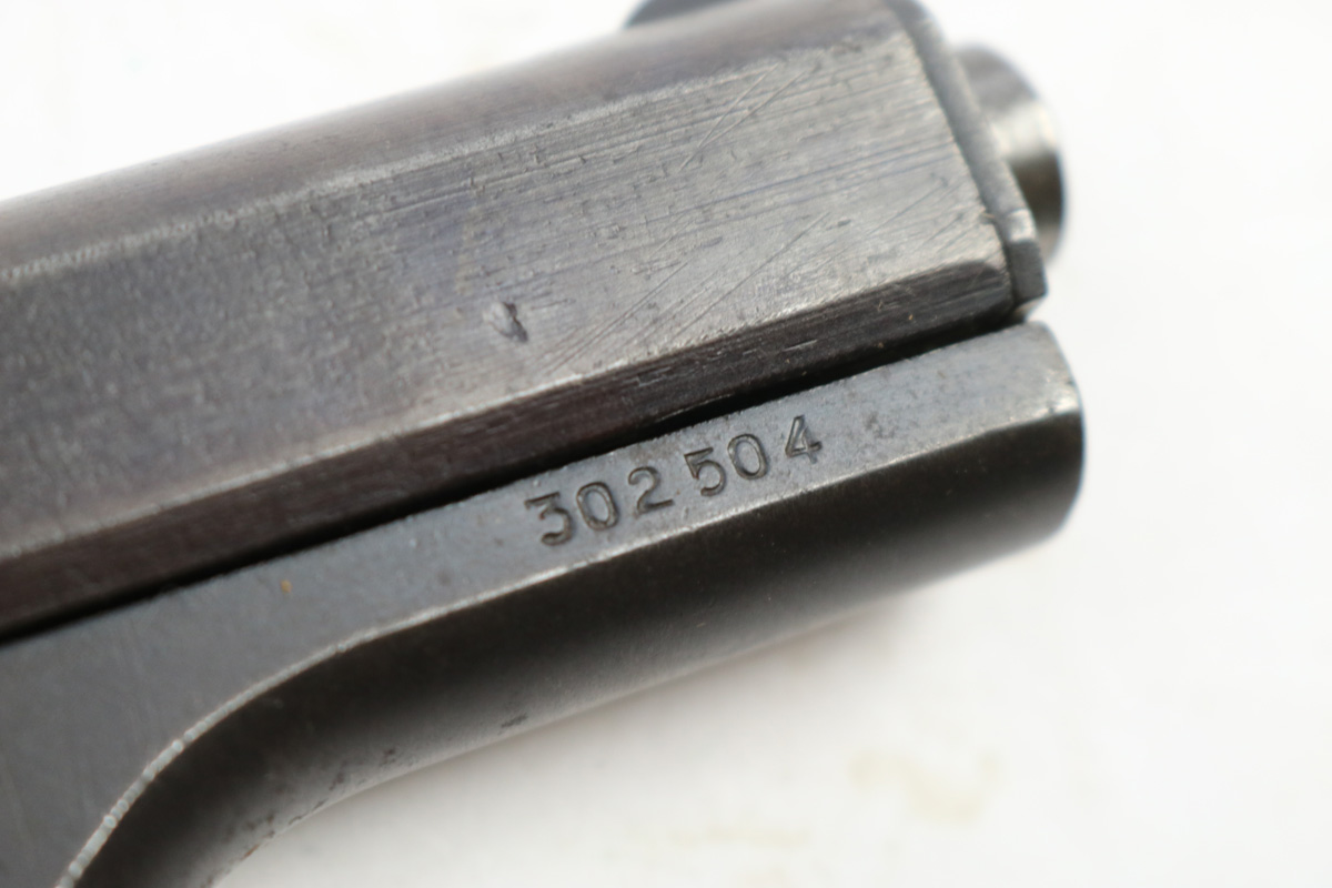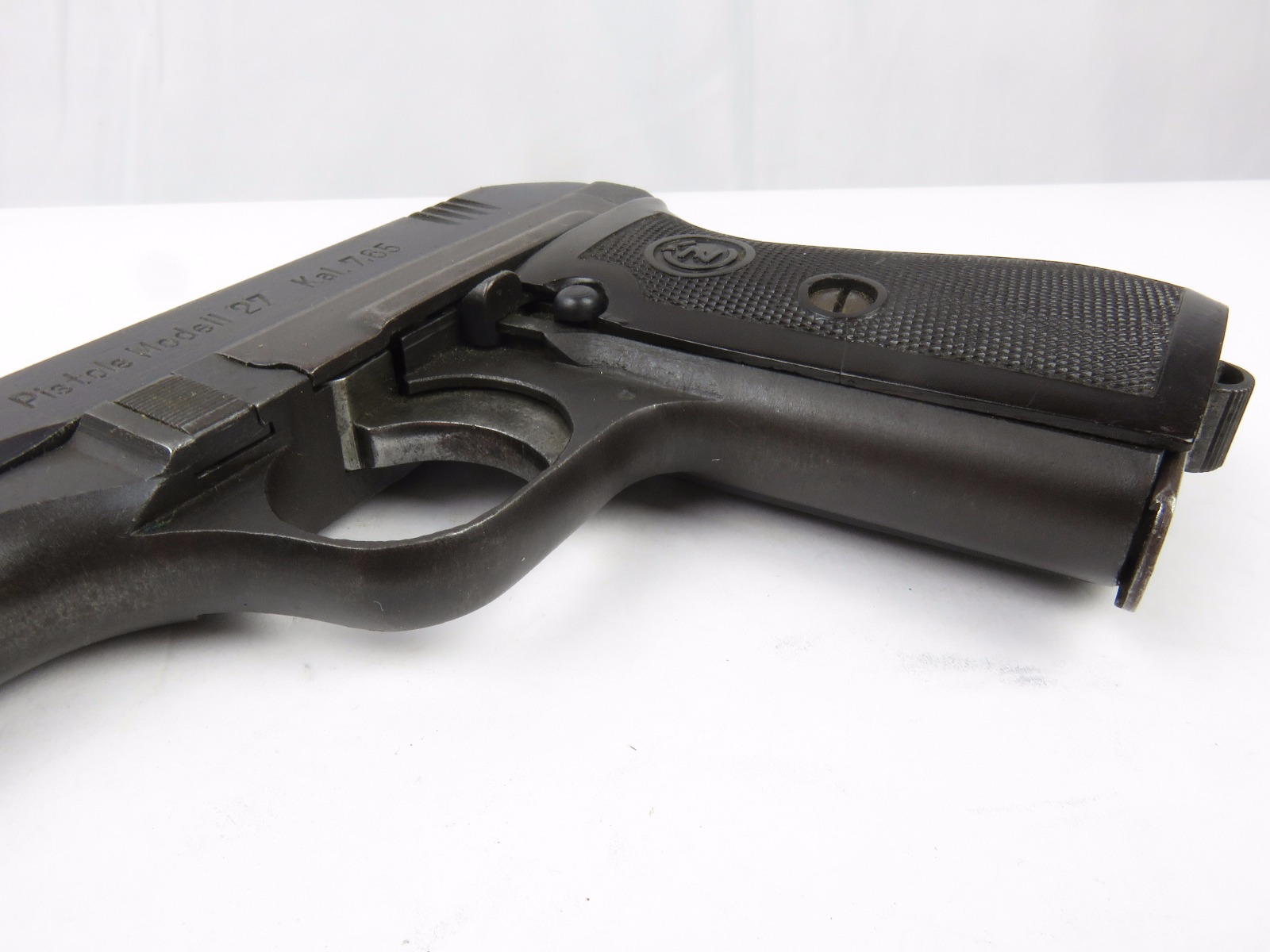 8/16/17 – This is an original CZ model 27 pistol with an original holster from WW2. The pistol has a rough factory original blued finish, which makes grading difficult. However, the finish seems complete and all original with no major flaws. There is some trigger wear and discoloration/darkening, but the frame and slide have nice finish with minimal use/aging flaws. The grip is in great shape with a very minor surface crack on the left side going towards the screw hole, and another hairline crack or scratch the back spine. Please see photos. The bore is excellent with sharp rifling. The holster is unmarked but period correct and original.