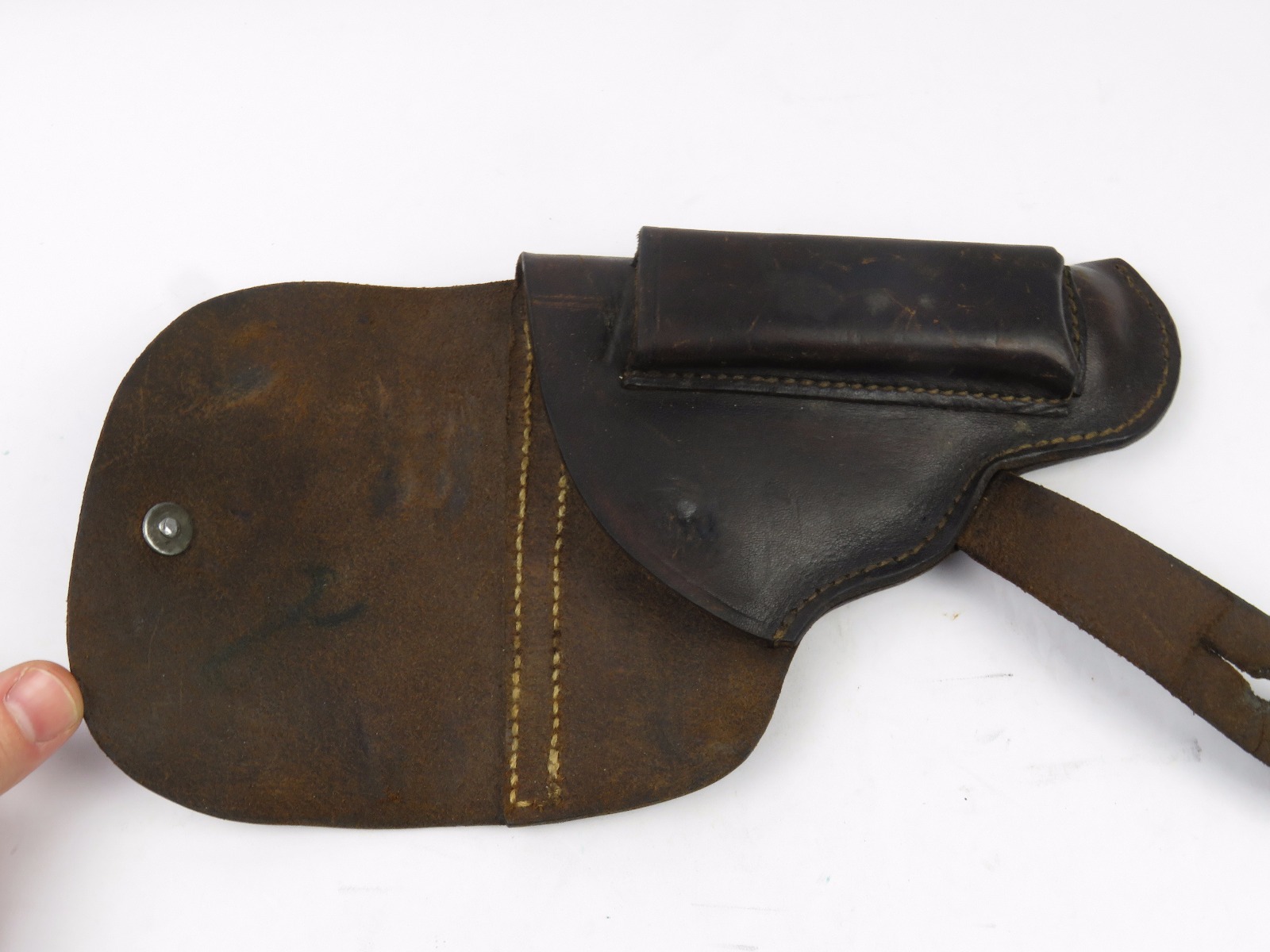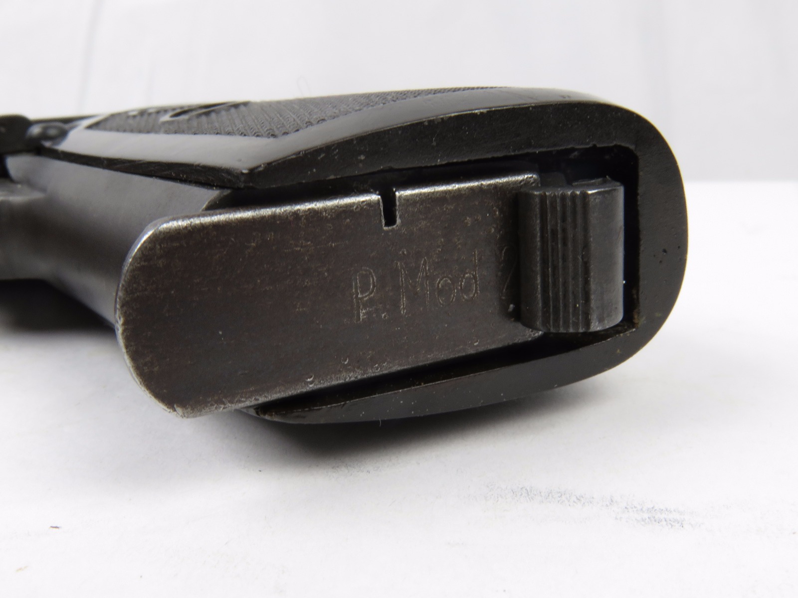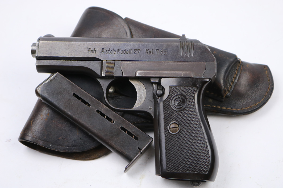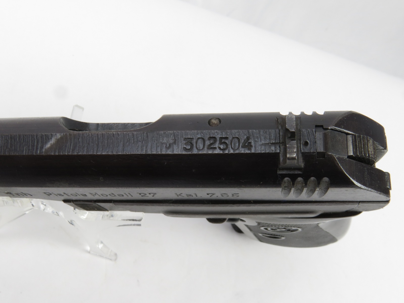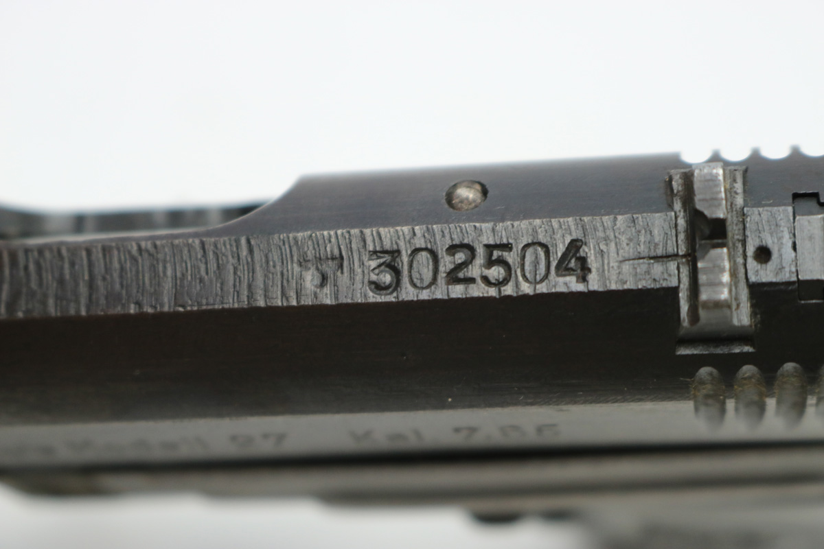 8/16/17 – This is an original CZ model 27 pistol with an original holster from WW2. The pistol has a rough factory original blued finish, which makes grading difficult. However, the finish seems complete and all original with no major flaws. There is some trigger wear and discoloration/darkening, but the frame and slide have nice finish with minimal use/aging flaws. The grip is in great shape with a very minor surface crack on the left side going towards the screw hole, and another hairline crack or scratch the back spine. Please see photos. The bore is excellent with sharp rifling. The holster is unmarked but period correct and original.