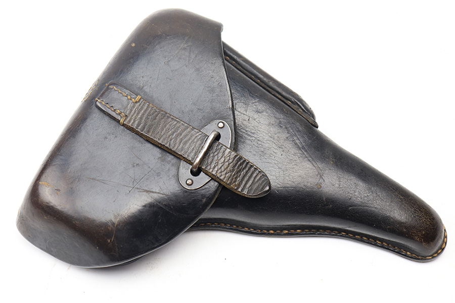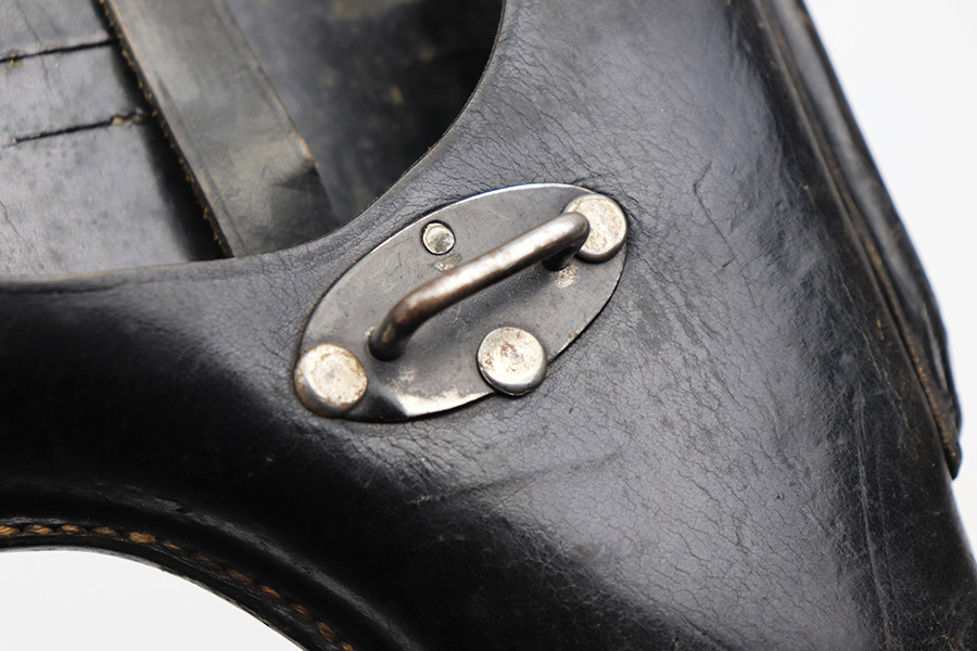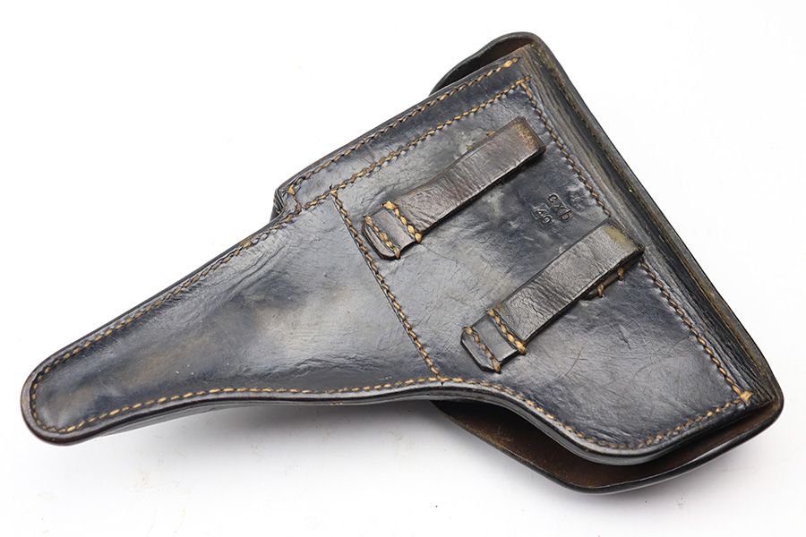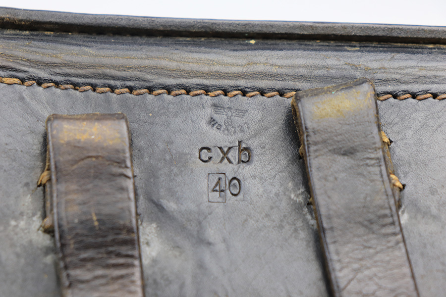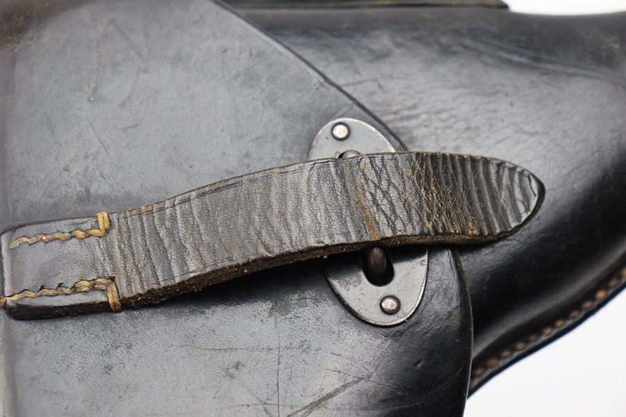 4/13/22 – This is an original 1940 dated holster for a CZ model 38 or CZ-39 pistol. These holsters are very similar to P.38 holsters, but lack the P.38 stamp on the back leather. They do still fit a p.38 nicely. The holster is in great condition with some mild black finish loss and surface wrinkling on the front leather and closure strap. No major issues and clean interior leather. Also, no stitching issues. Strongly struck maker stamp, date stamp, and waffen proof stamp on the back leather.