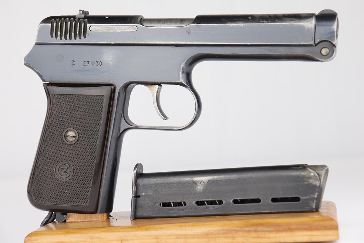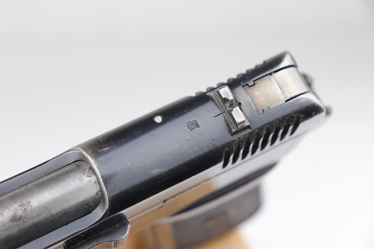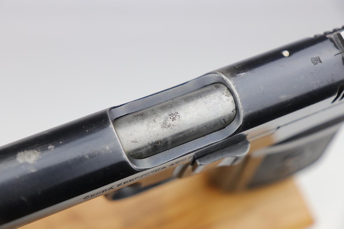 6/13/19 – This is a nice example of a CZ vz. 38 pistol that was manufactured in 1939. The original blue rates at about 90% with most of the finish loss along the top and left sides of the slide. Terrific bore and excellent grips. These pistols were produced at the request of the Czechoslovakian Air Force and Cavalry, but the German occupation occurred before the pistols were issued. They were then diverted to the German military and given the new designation of P.39(t). About 41,000 such pistols were produced with high-polish blue.