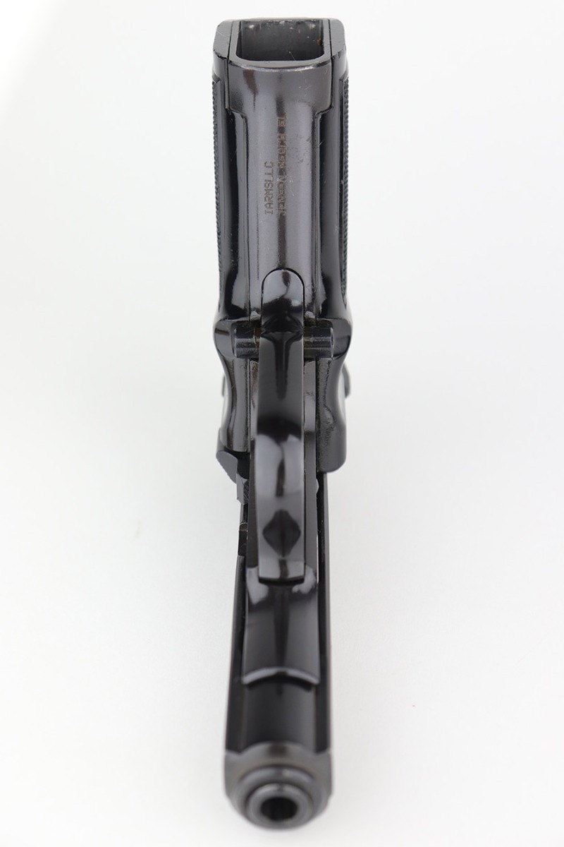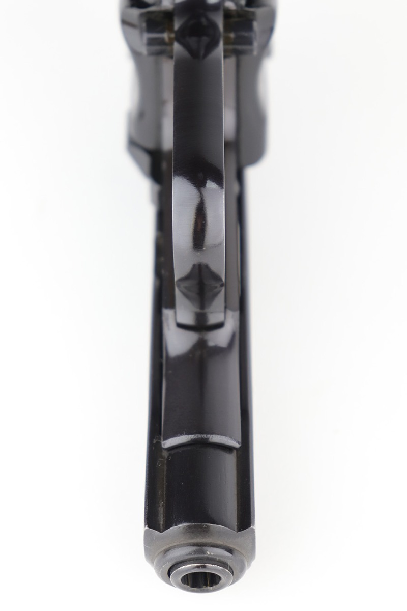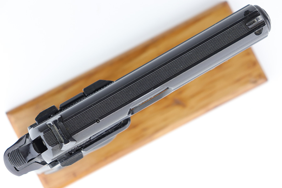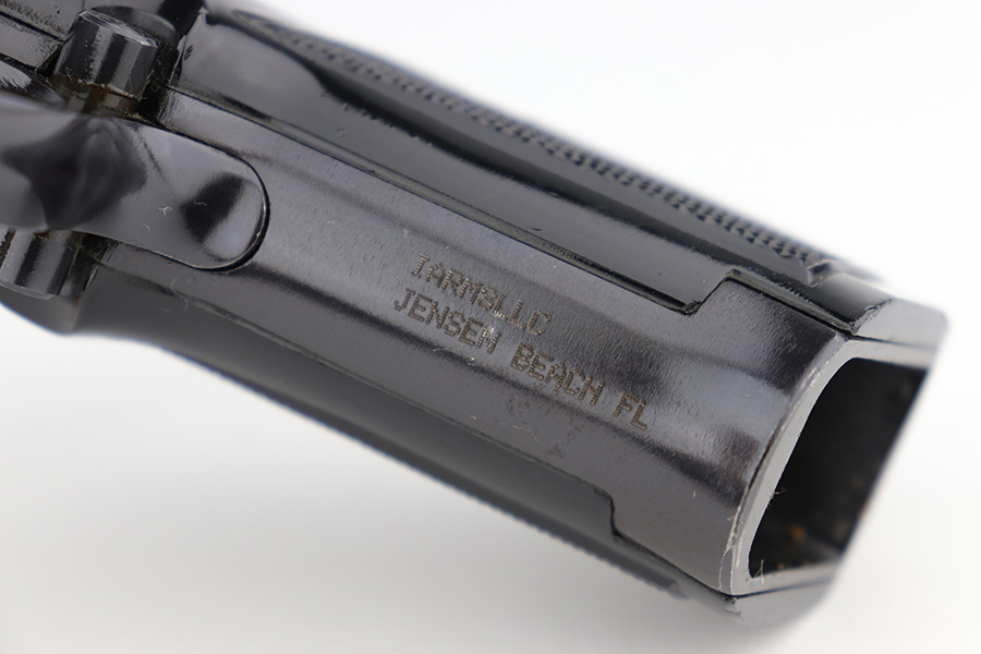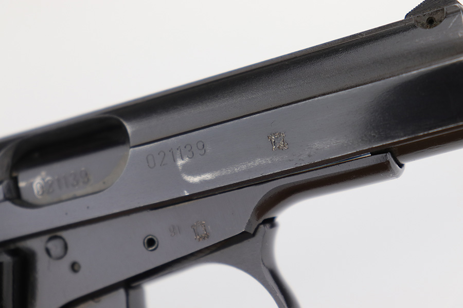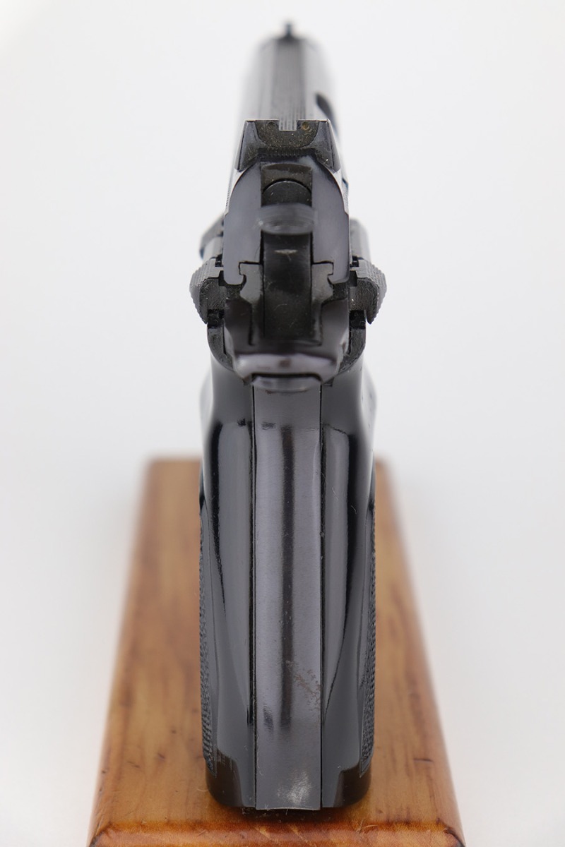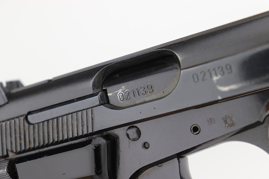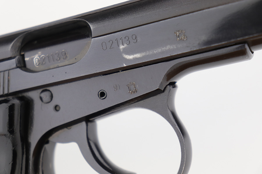1/16/23 – This is a minty example of a Czech CZ Model 83, manufactured in 1991 and chambered in 7.65mm – much rarer than the .380 ACP version. This one is all matching but has an import mark on the front strap. It has retained nearly all of its finish with just a hint of muzzle wear and one light streak of wear along the right side of the slide. One small spot of very light freckling on the back strap. Fitted with nice black plastic grips (some tiny handling marks on the right side) and comes with one proper magazine. Mint bore.