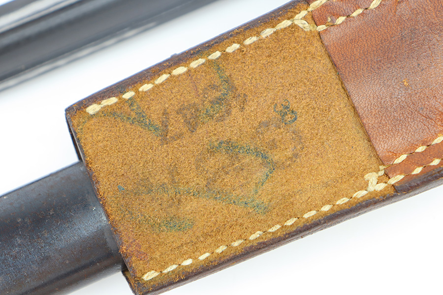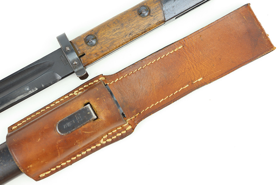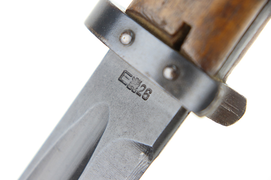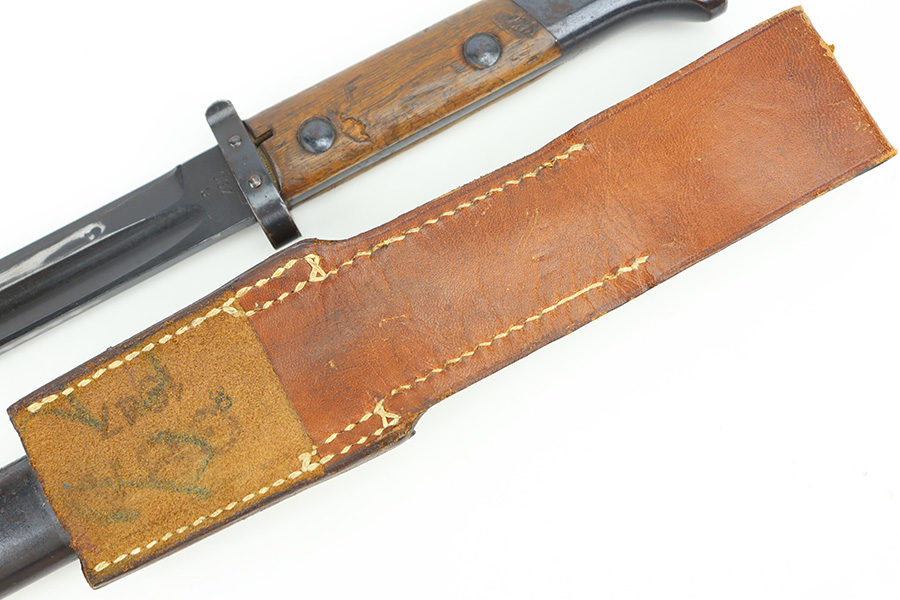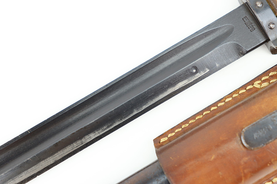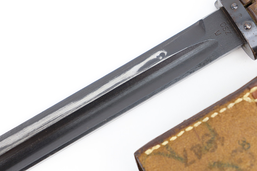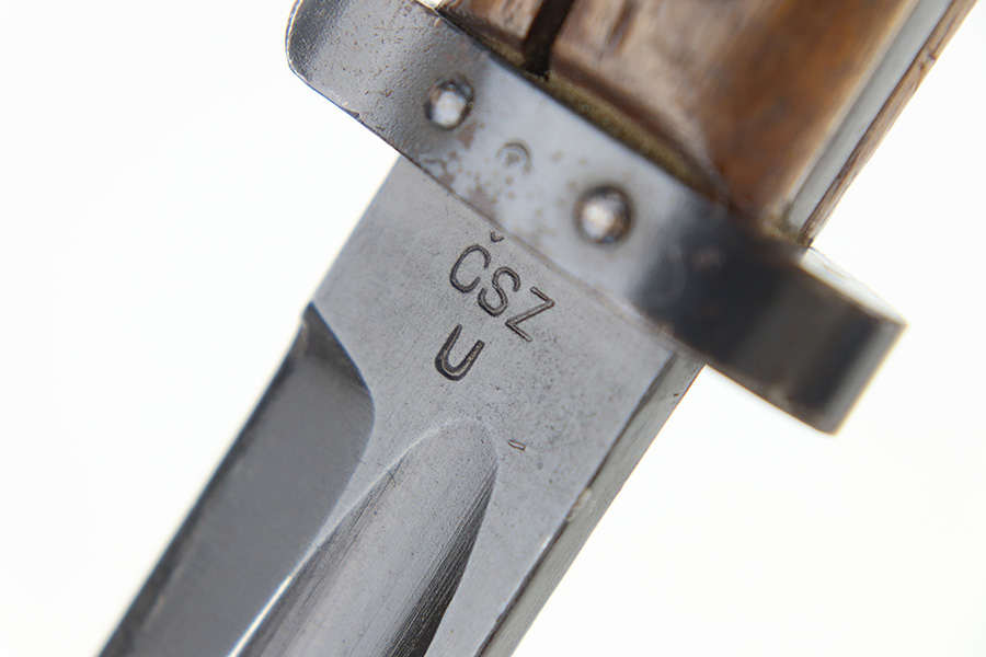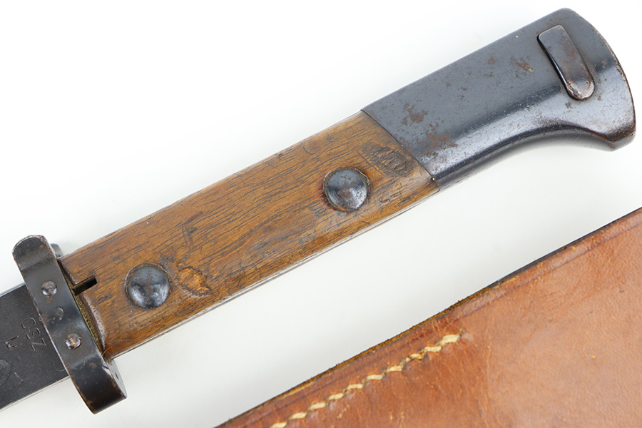12/27/23 – This is an original WW2 era Czech VZ-24 rifle bayonet. The bayonet comes with an original scabbard and leather frog, a shown. The bayonet is in great overall condition with light surface wear and mild finish loss throughout the blade. The edge shows mild nicks and dings from use. The blade is dated 1926, and the scabbard is dated 1937. The scabbard has light brown patina throughout the finish. No dents or major issues. Clean leather frog.