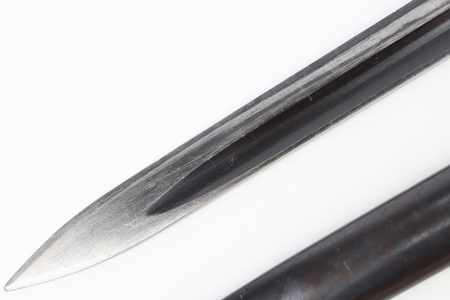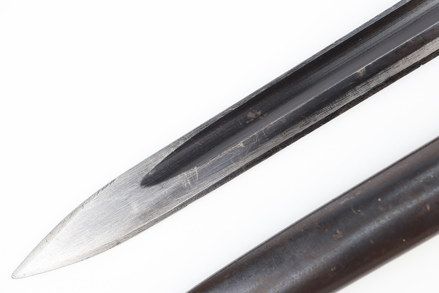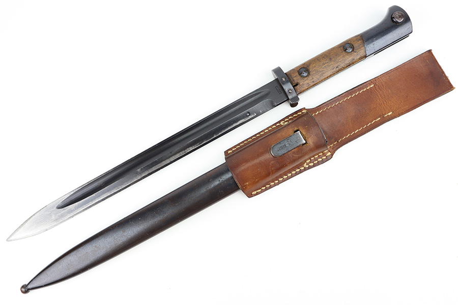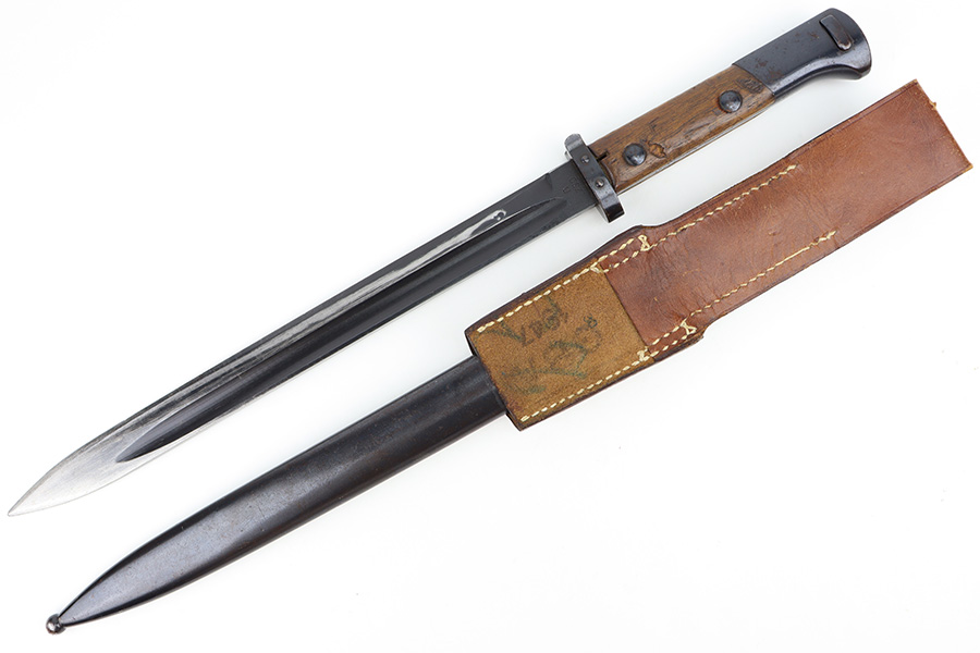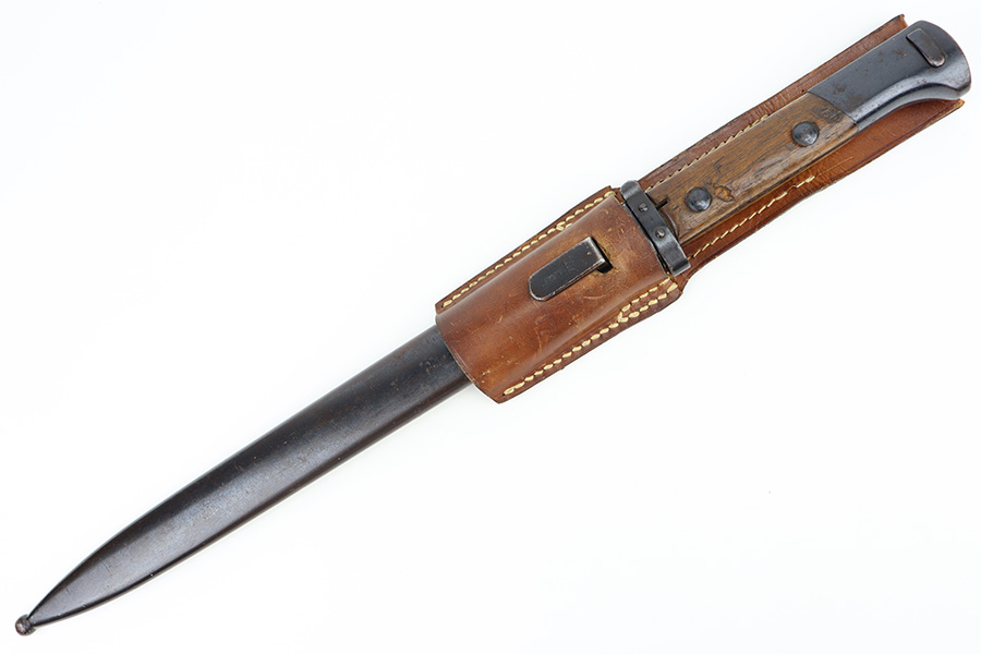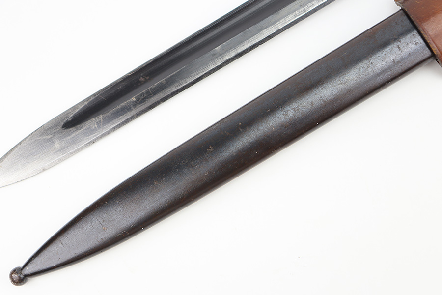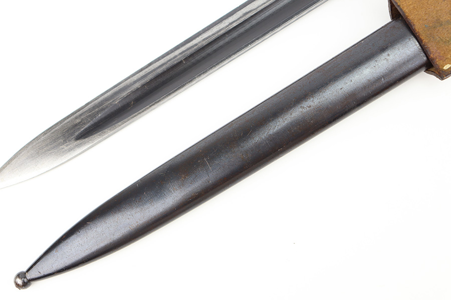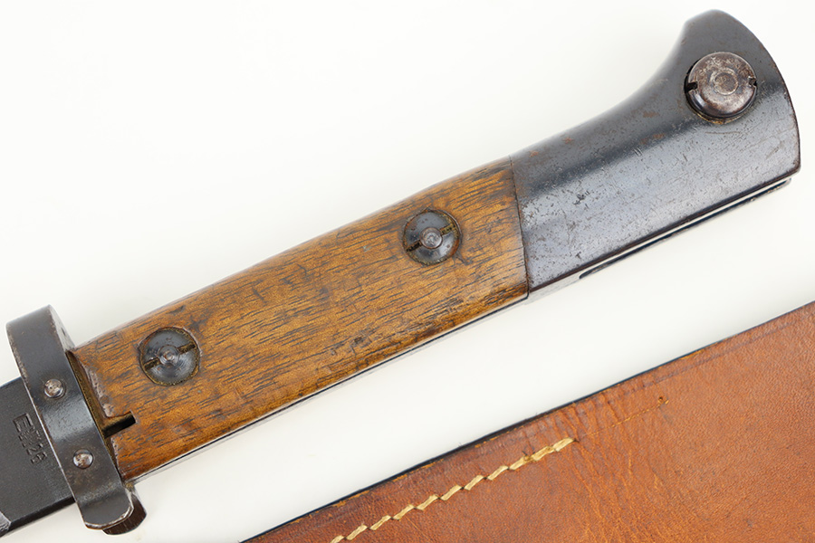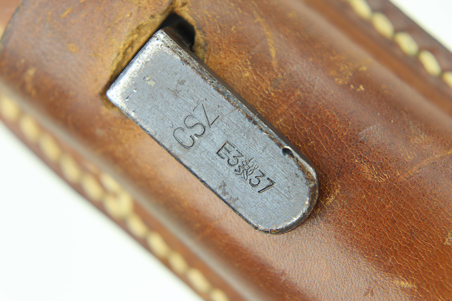 12/27/23 – This is an original WW2 era Czech VZ-24 rifle bayonet. The bayonet comes with an original scabbard and leather frog, a shown. The bayonet is in great overall condition with light surface wear and mild finish loss throughout the blade. The edge shows mild nicks and dings from use. The blade is dated 1926, and the scabbard is dated 1937. The scabbard has light brown patina throughout the finish. No dents or major issues. Clean leather frog.