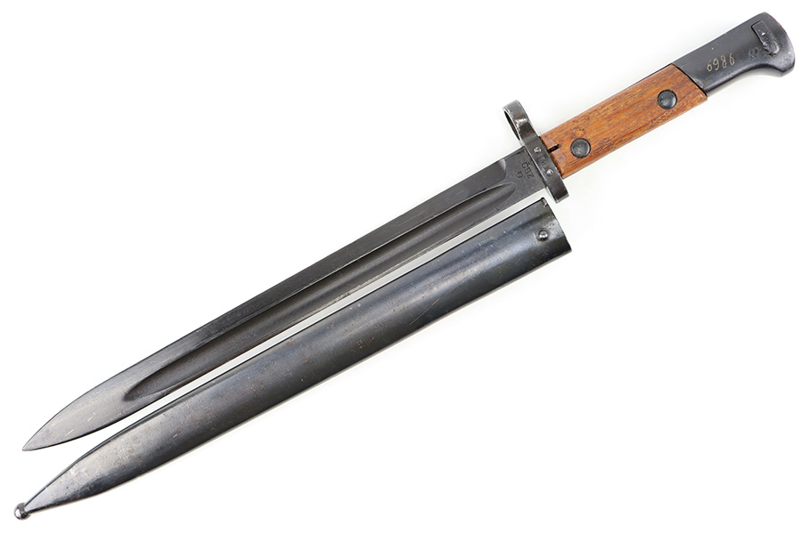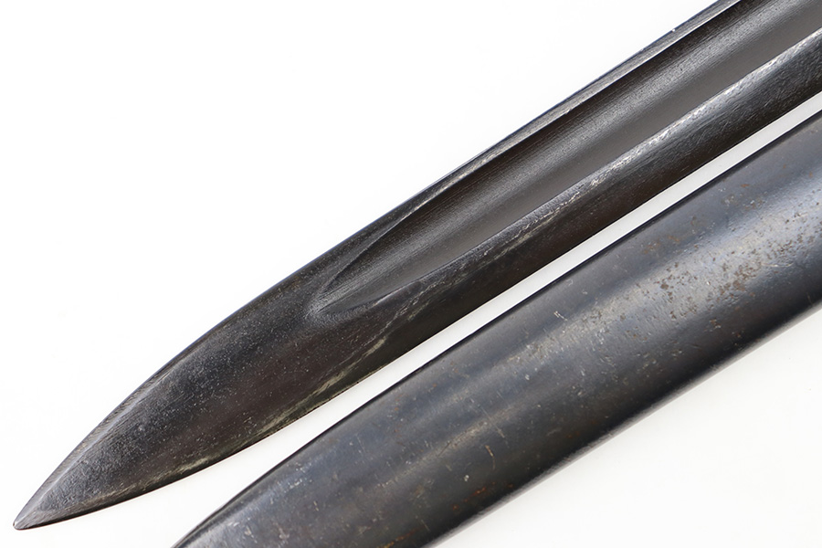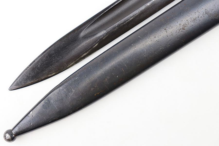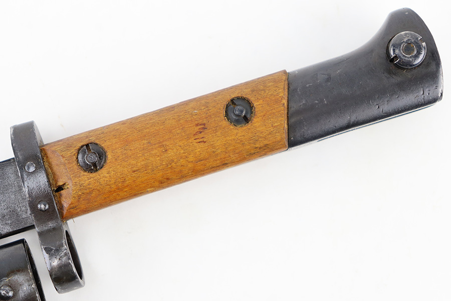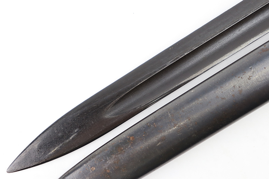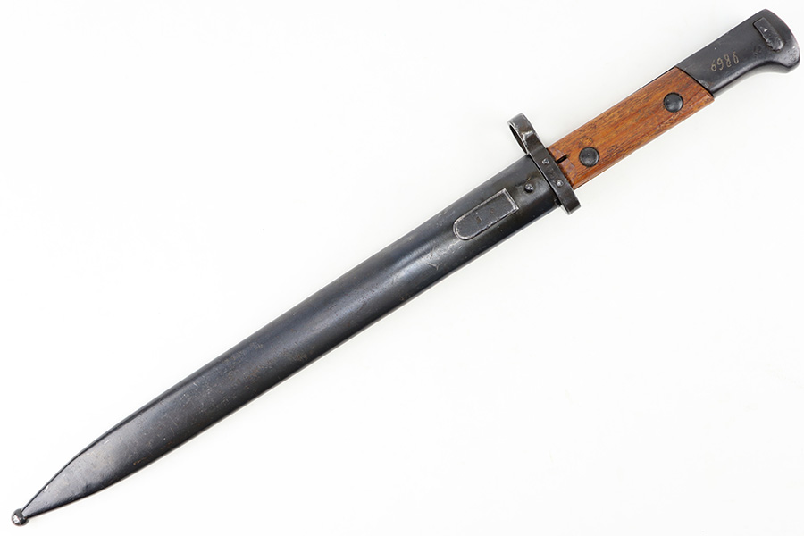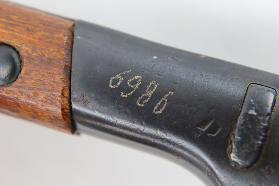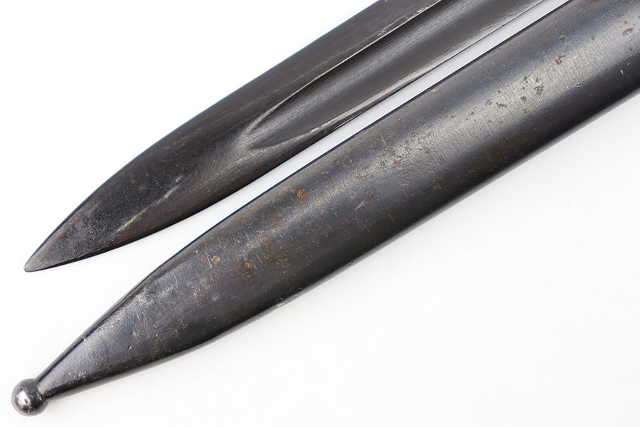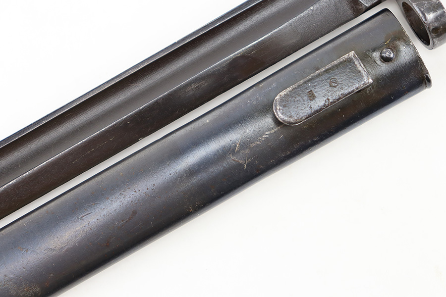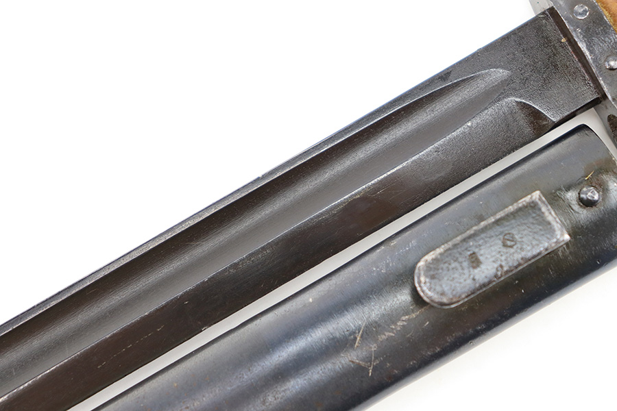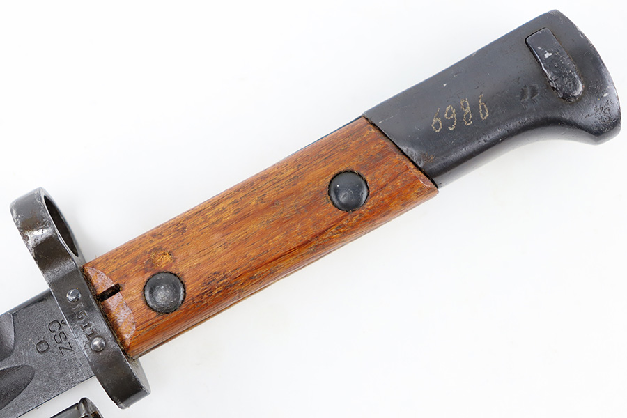 9/6/23 – This is a Czech VZ-24 rifle bayonet. WW2 era (or immediate post-war) production. The bayonet is in great condition with a clean blade that shows dark bluing throughout. Light scratches and some mild surface wear near the edge, which appears unsharpened. The base of the blade is marked “csz o”. Likely post-ww2 refinished and re-issued. The cross guard is numbered 8511, and the pommel has an electro-pencil number 9869. The pommel shows signs of refinish and has light pitting under the finish, which again suggests this was likely post-ww2 reworked. The scabbard is in excellent condition with a cz maker stamp.