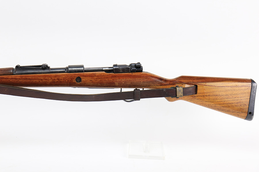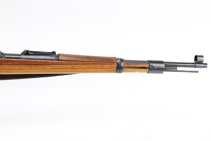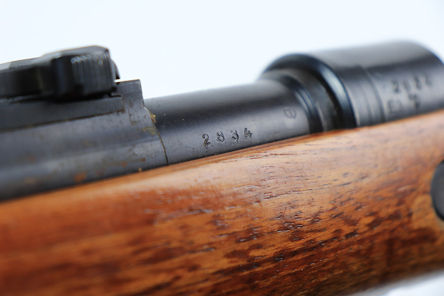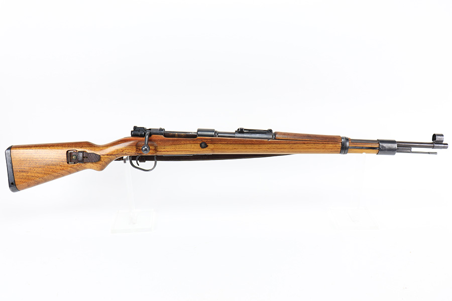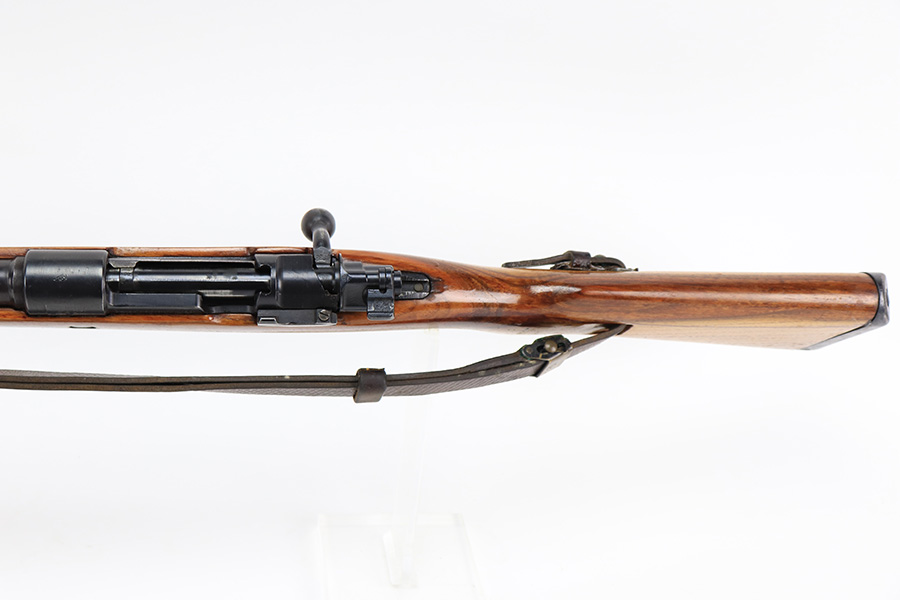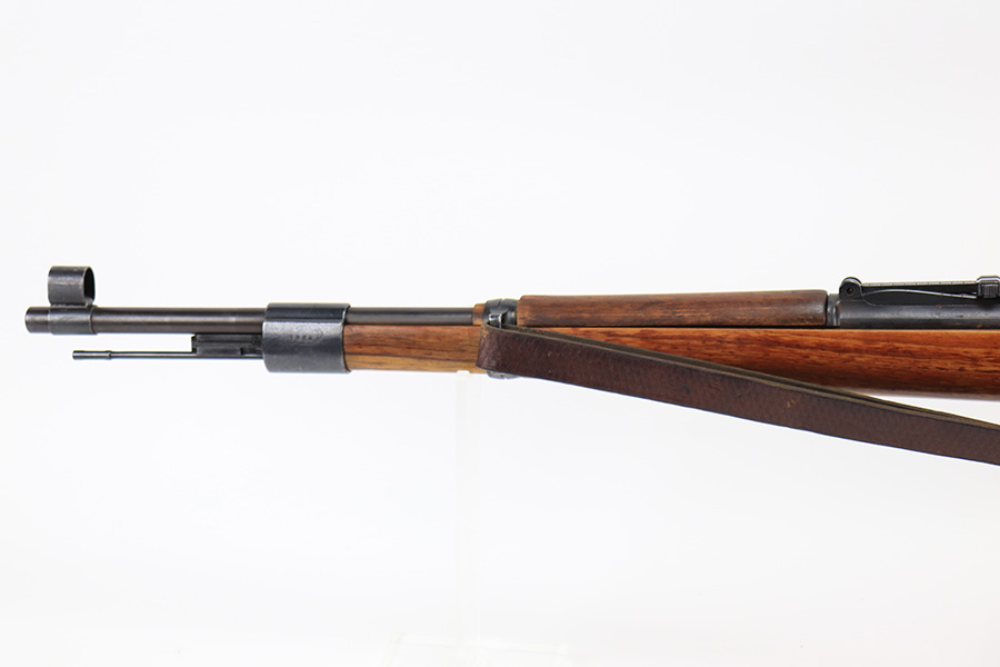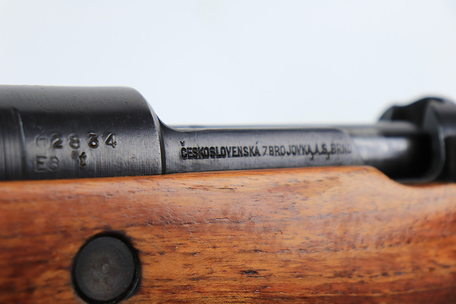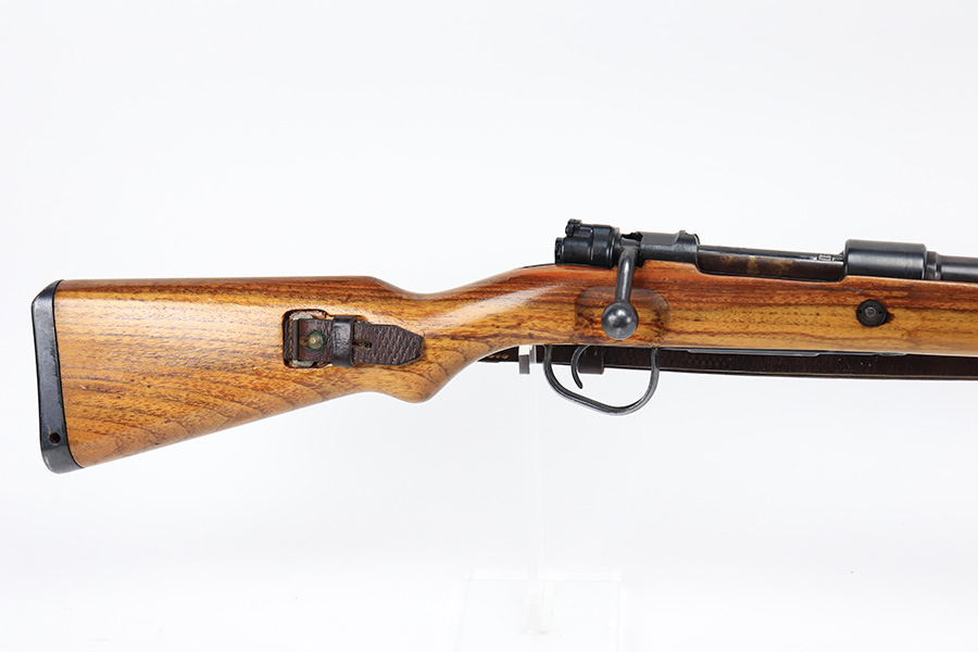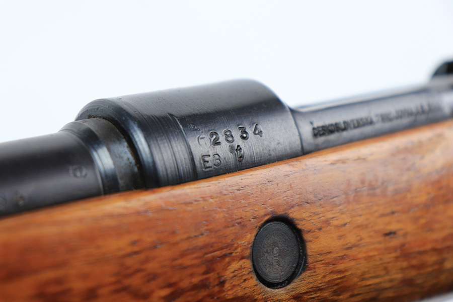3/30/22 – This is an excellent example of a Czech K98 rifle put together at the BRNO factory after WW2 using leftover Nazi parts. All numbered parts on the gun are matching except for one part on the bolt assembly. The wood stock looks like it has a matching serial number on the underside of the butt stock, but the numbering is extremely faint. Import mark on the underside of the barrel. The gun has retained virtually all of its bluing, but there are some very light scratches on the front barrel band and floor plate. A few small dots of light surface rust around the rear sight. The stock was sanded and has a a thin layer of lacquer. Comes with a cleaning rod and leather. Very nice bore with good rifling and very minor pin-pricking.