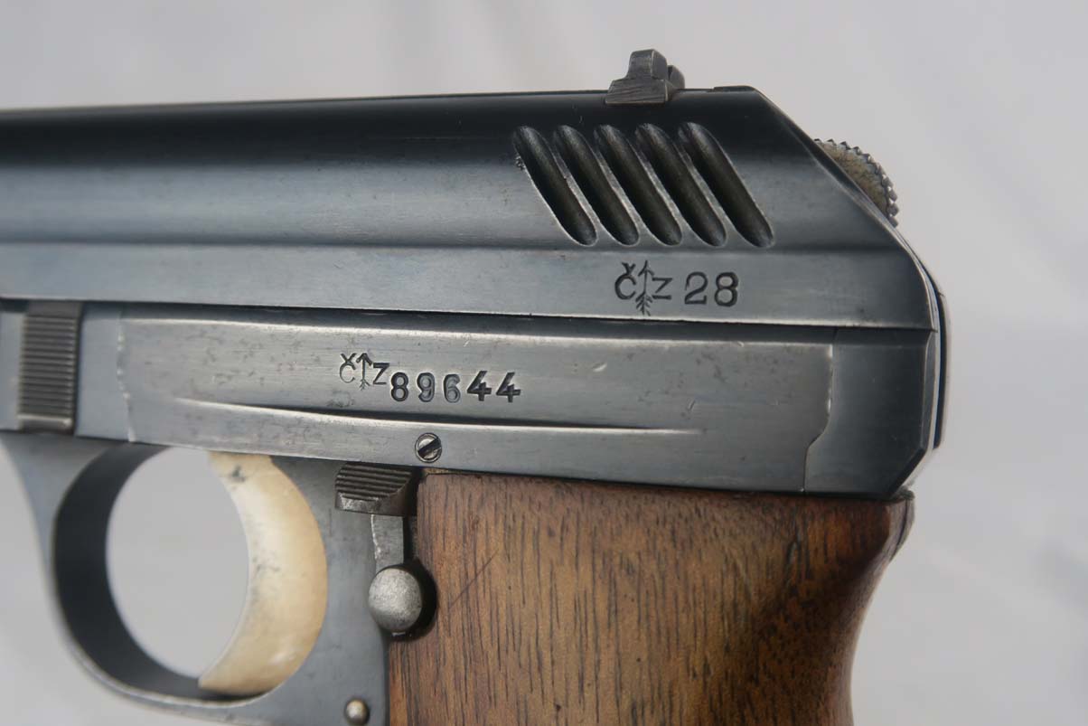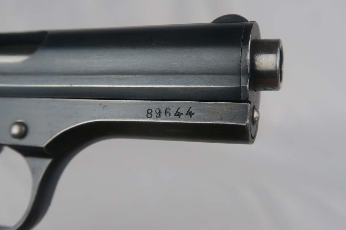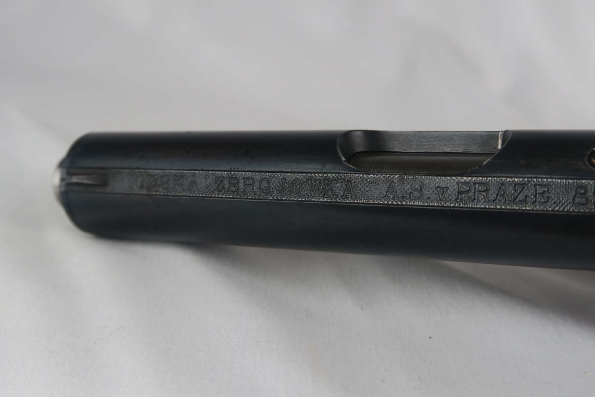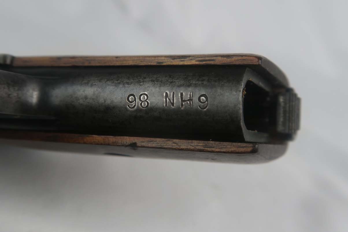 9/12/17 – This is CZ vz 24 in all original condition with military unit marking on the front strap.  The original finish rates at about 92-93%, with a beautiful slide but some notable finish loss on the front strap.  The front strap marking reads “98 NH9”.  98 would indicate 98th regiment and 9 would indicate it was the 9th gun issued in the batch.  Slide is dated to 1928.  Grip has no major cracks or chips.  ‘P. Mod 24’ marked magazine in good condtiion.  Mint bore.