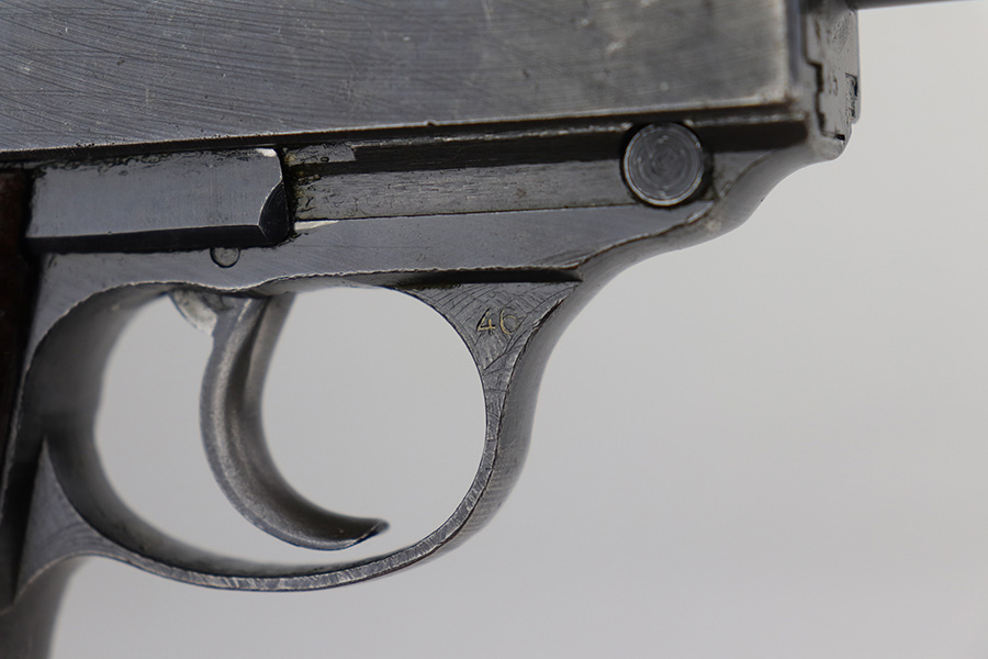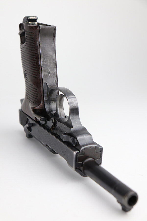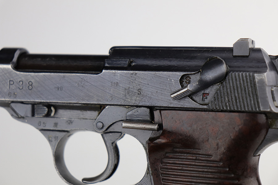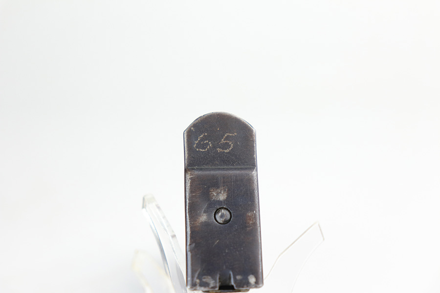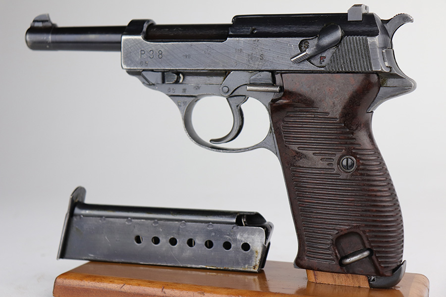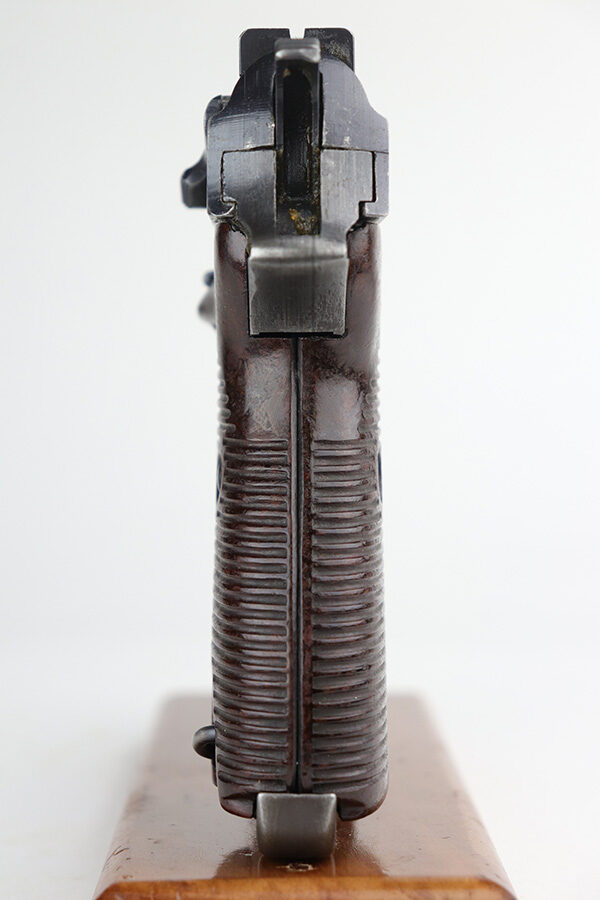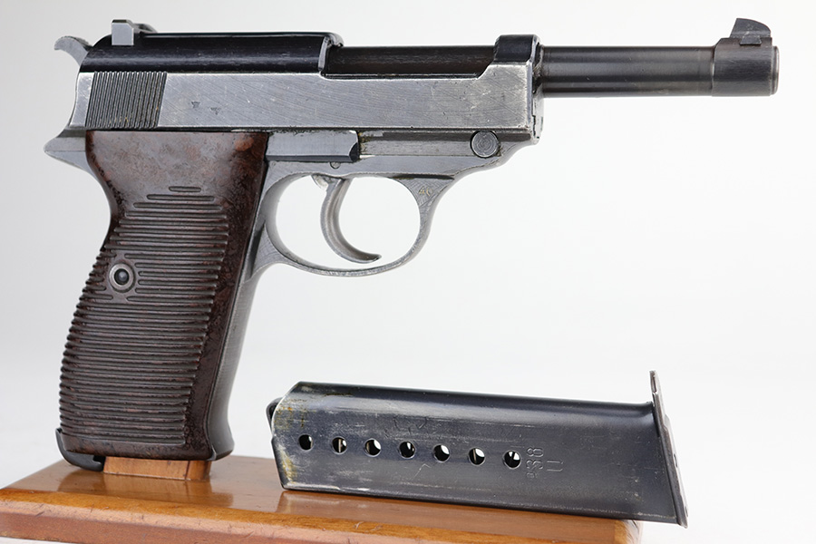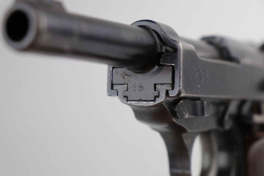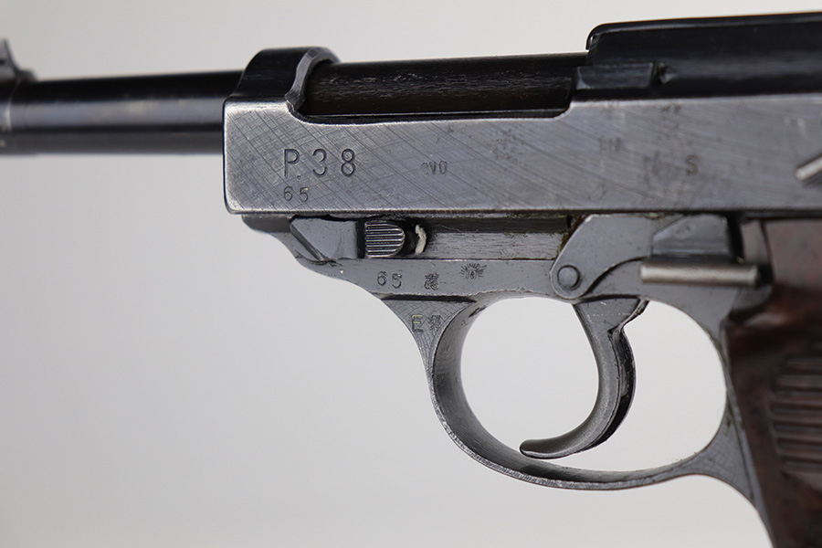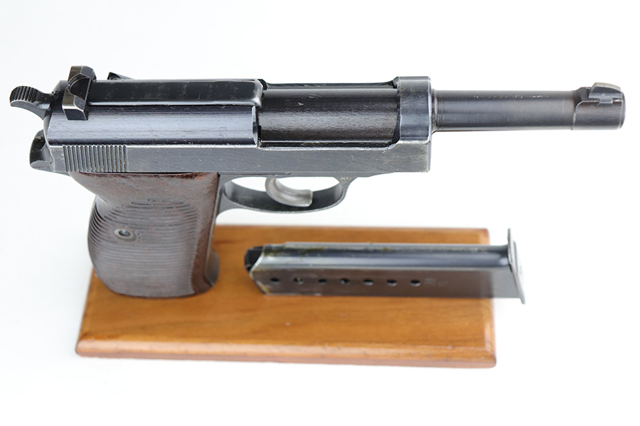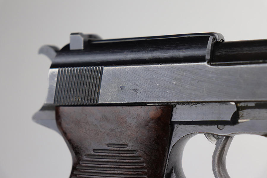 10/1/21 – For you “odd ball” collectors, this is one you want to take a look at. This is a Spreewerke made P.38 but left in the factory at the end of the war, then reworked by the Czech’s. The right side of slide has a single Eagle 88. Left trigger guard has an E, a Czech lion, and a sunburst proof (likely East German). Right side trigger guard is 46 marked – the year it was reworked. It is all matching except for the locking block. It has retained about 93% of its finish. There is minor thinning on the front strap and minor scratchy wear concentrated around the high edges of the slide. Some very minor pin-pricking on the left side of the slide. There is also some very minor spotty wear on the underside of the barrel. Comes with excellent grips and a period-correct jvd magazine. The magazine is hand-numbered to match. Given that fact and the East German proof, it likely went to the East German police. The bore is near-mint. De-cocker is functional.