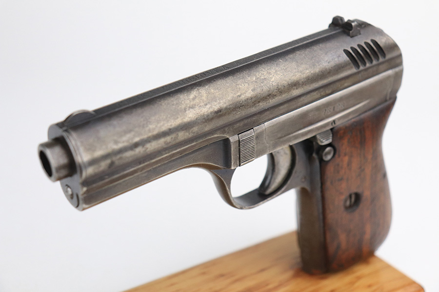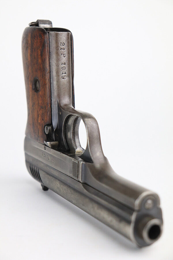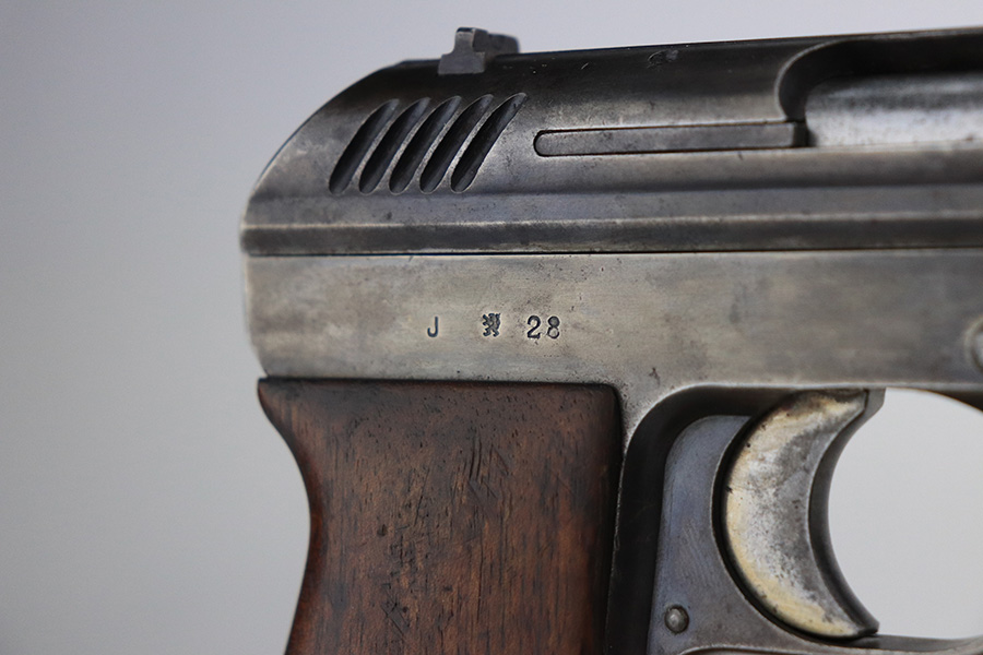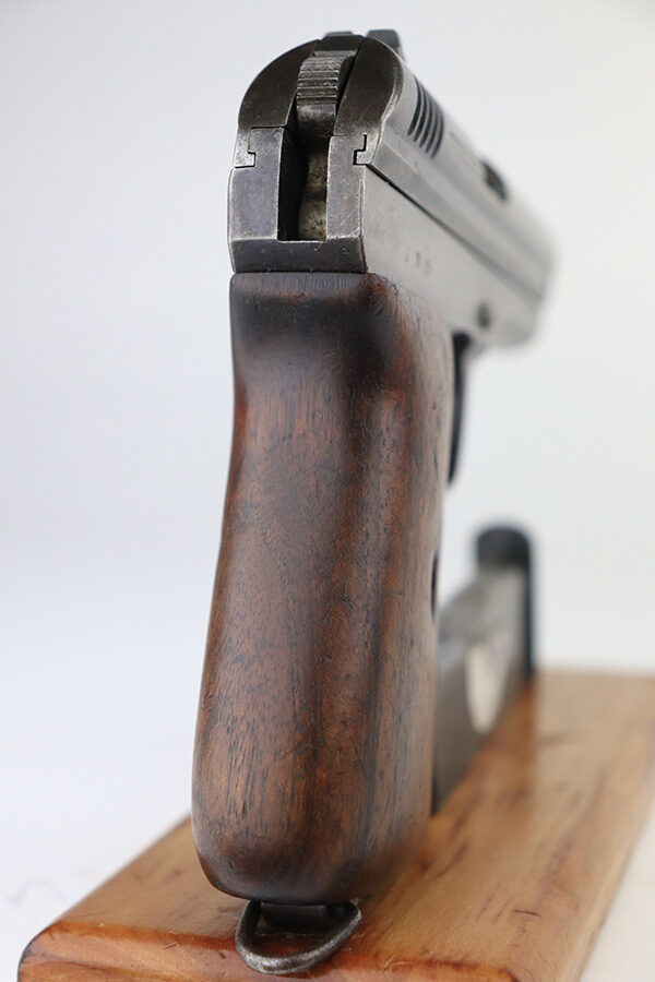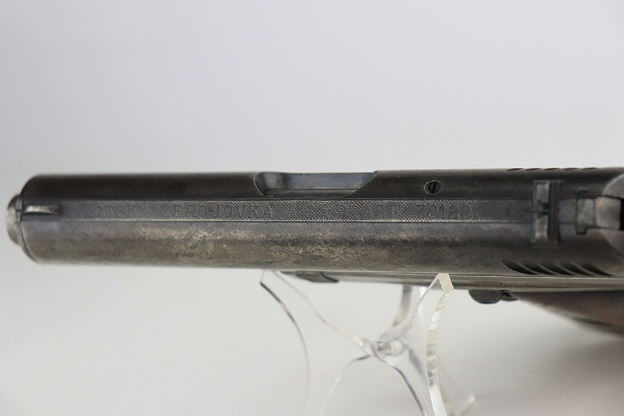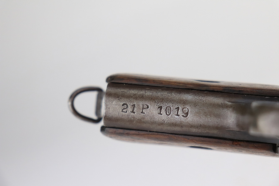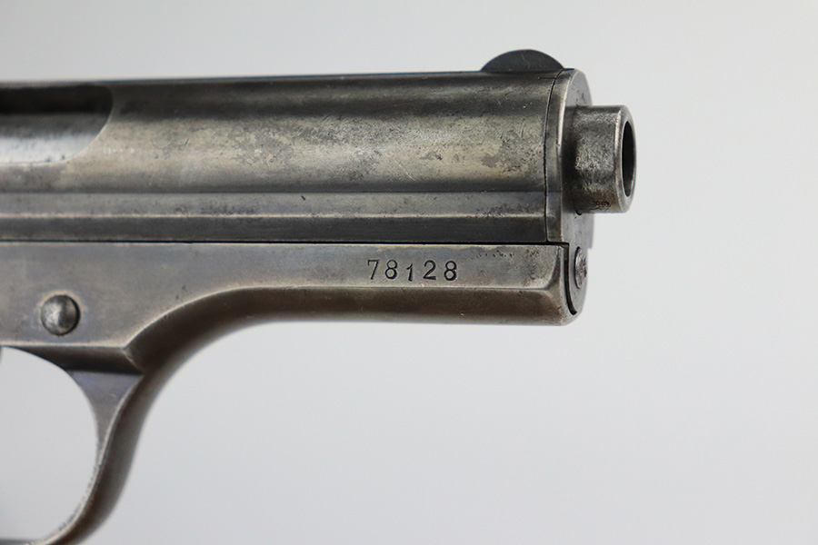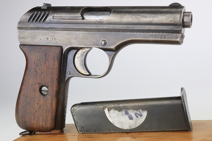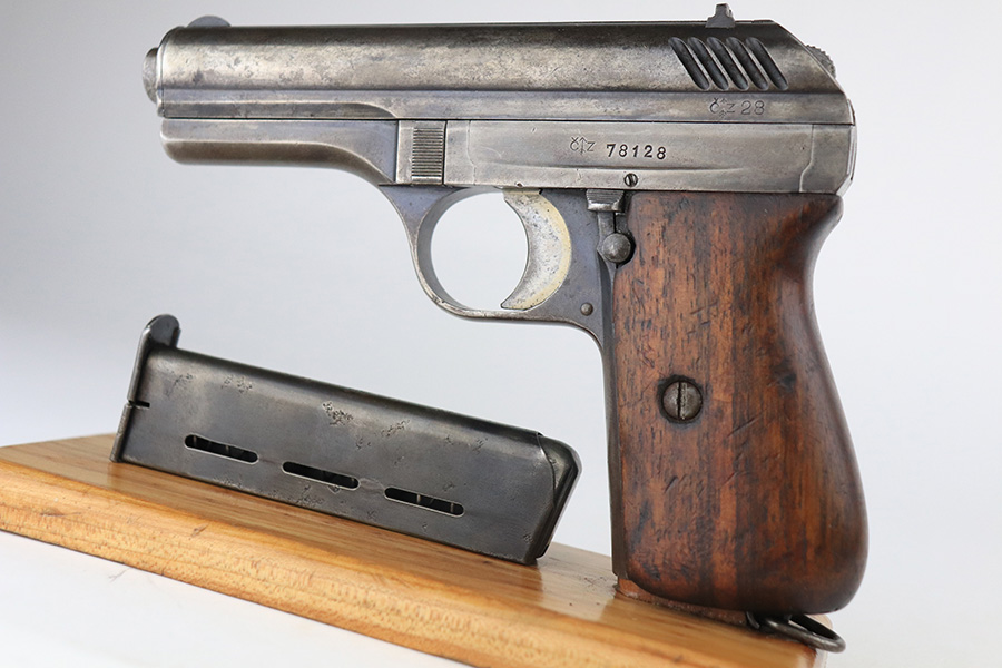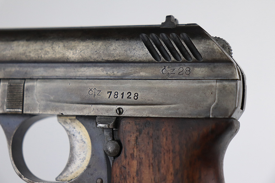 1/25/22 – This is a nice example of a CZ Model 24 issued to the Czech military in 1928. The gun is all matching and has the proper Czech lion proofs. There is also a military unit marking on the front strap – from research, this seems to be a infantry regimental marking. Overall, the gun is in nice condition, but it has only retained about 10% of its finish. There is even wear throughout, spotty oxidation along the top of the slide, and spotty brown patina throughout. Comes with a CZ 27 magazine that works in the gun and a worn wood grip – there are dings and bruises throughout, and the bottom corners are worn-down. The rifling in the bore is worn with minor pitting throughout.