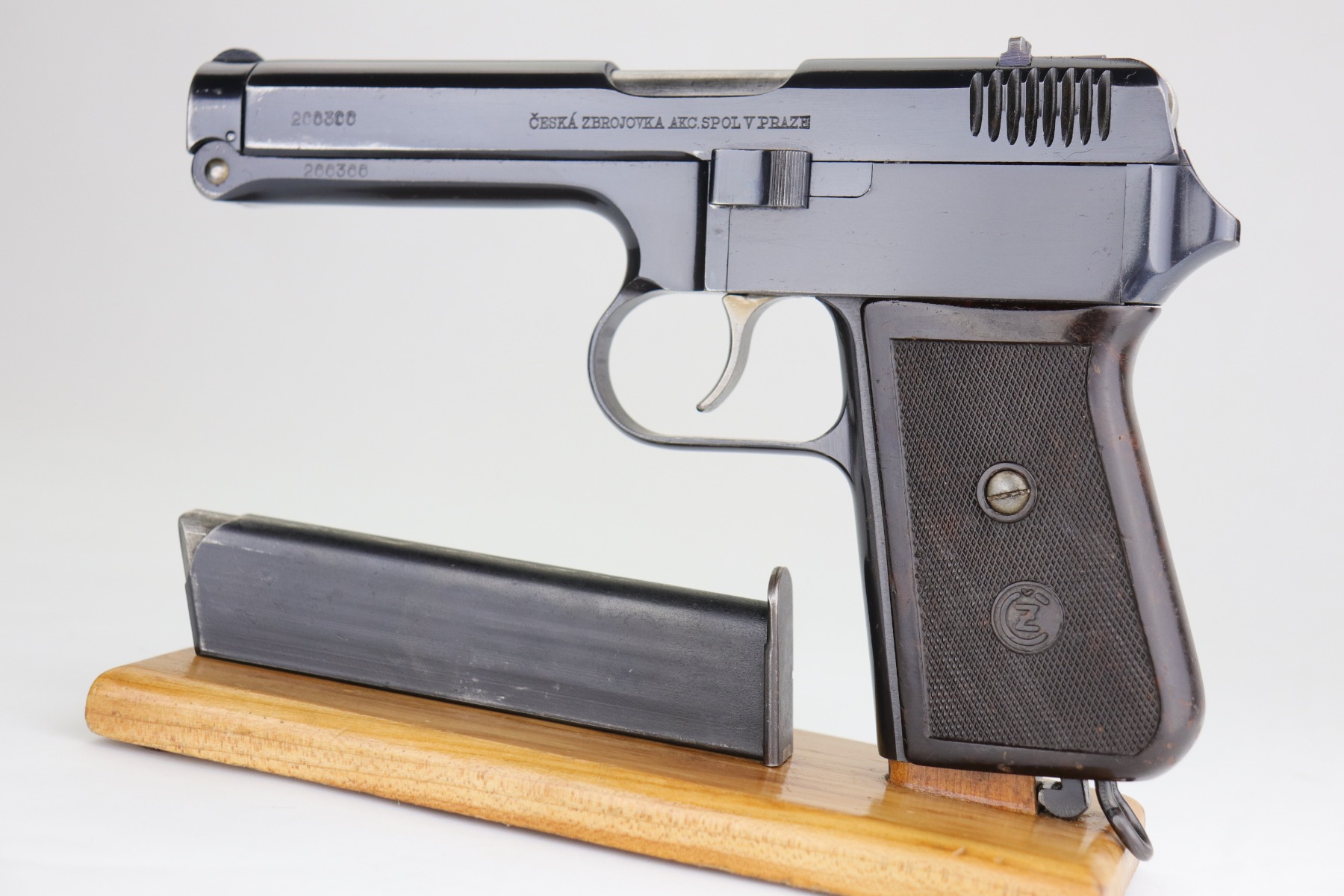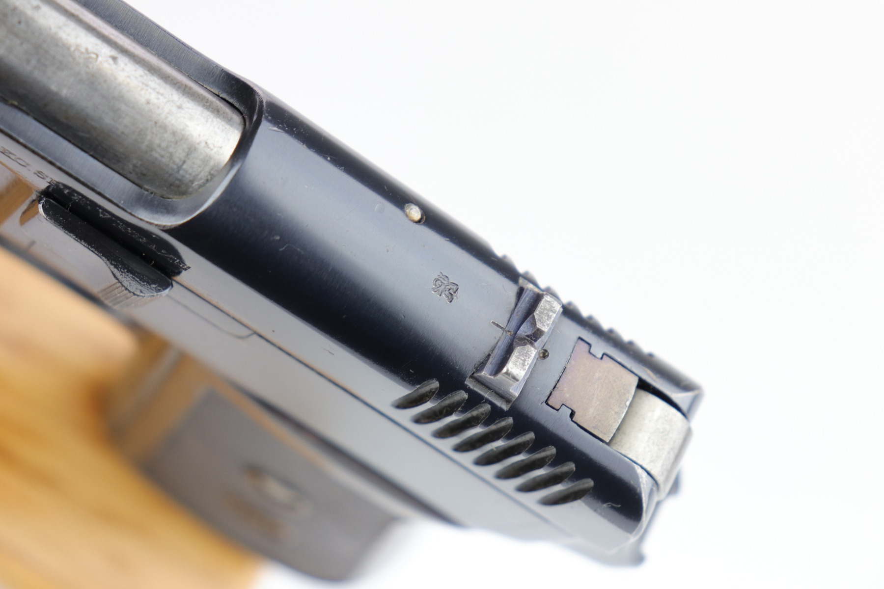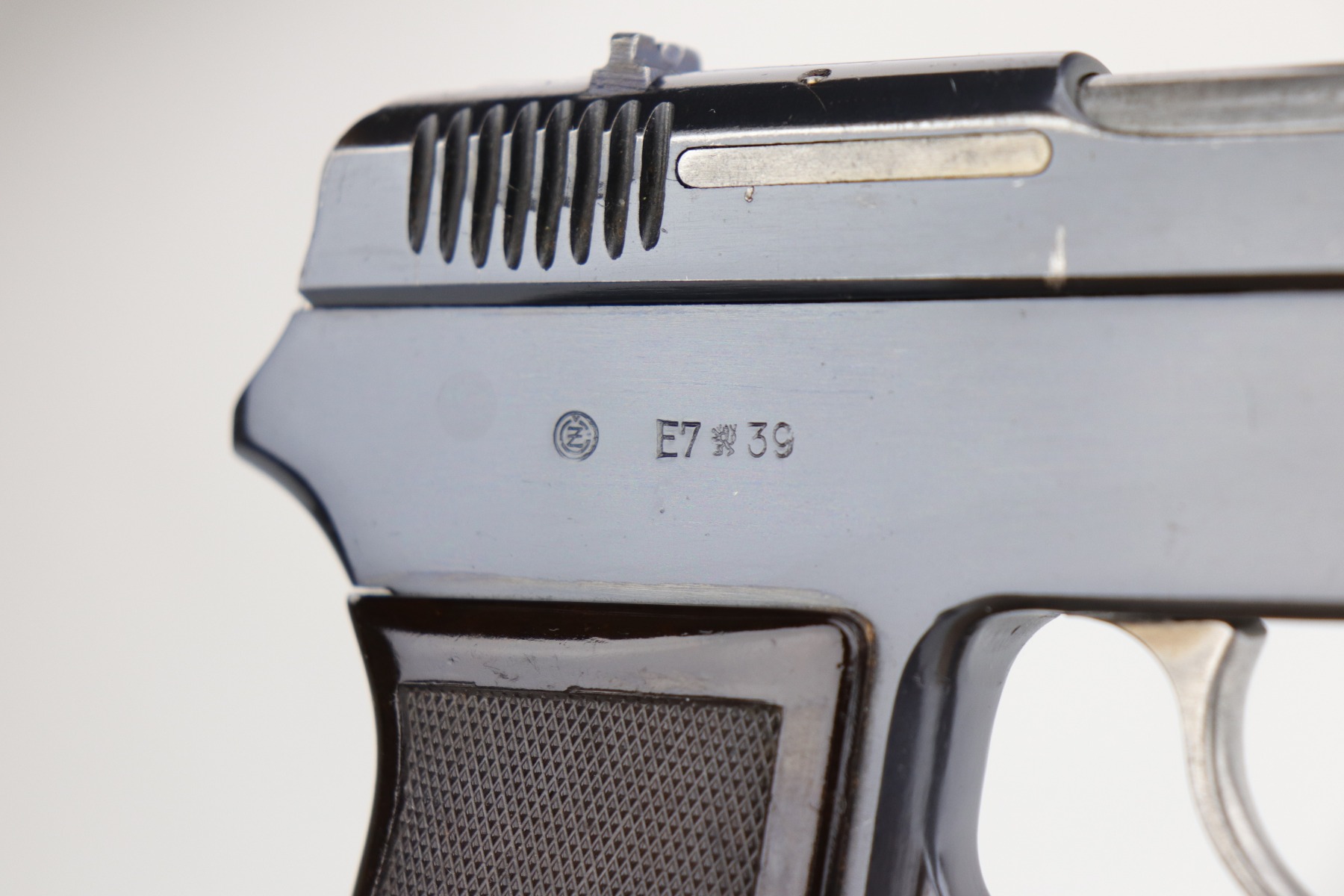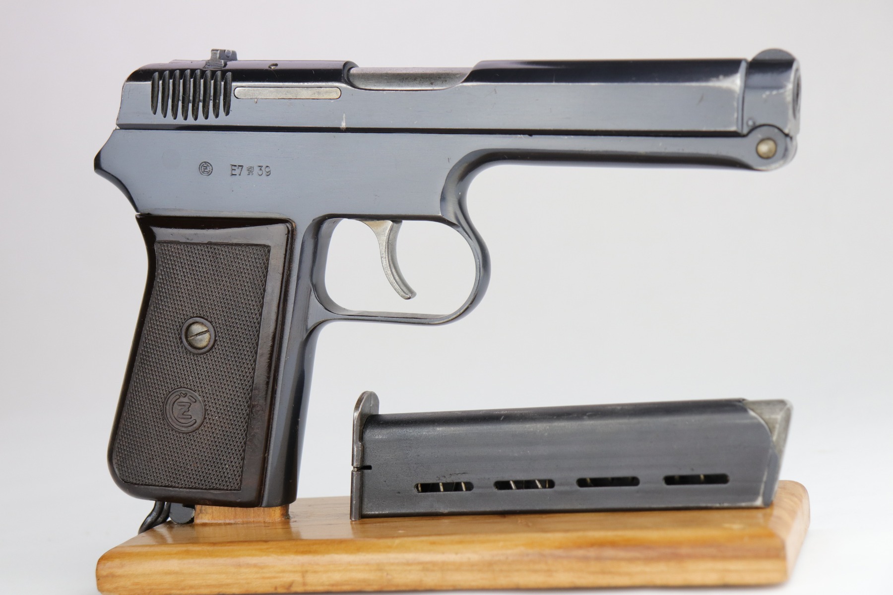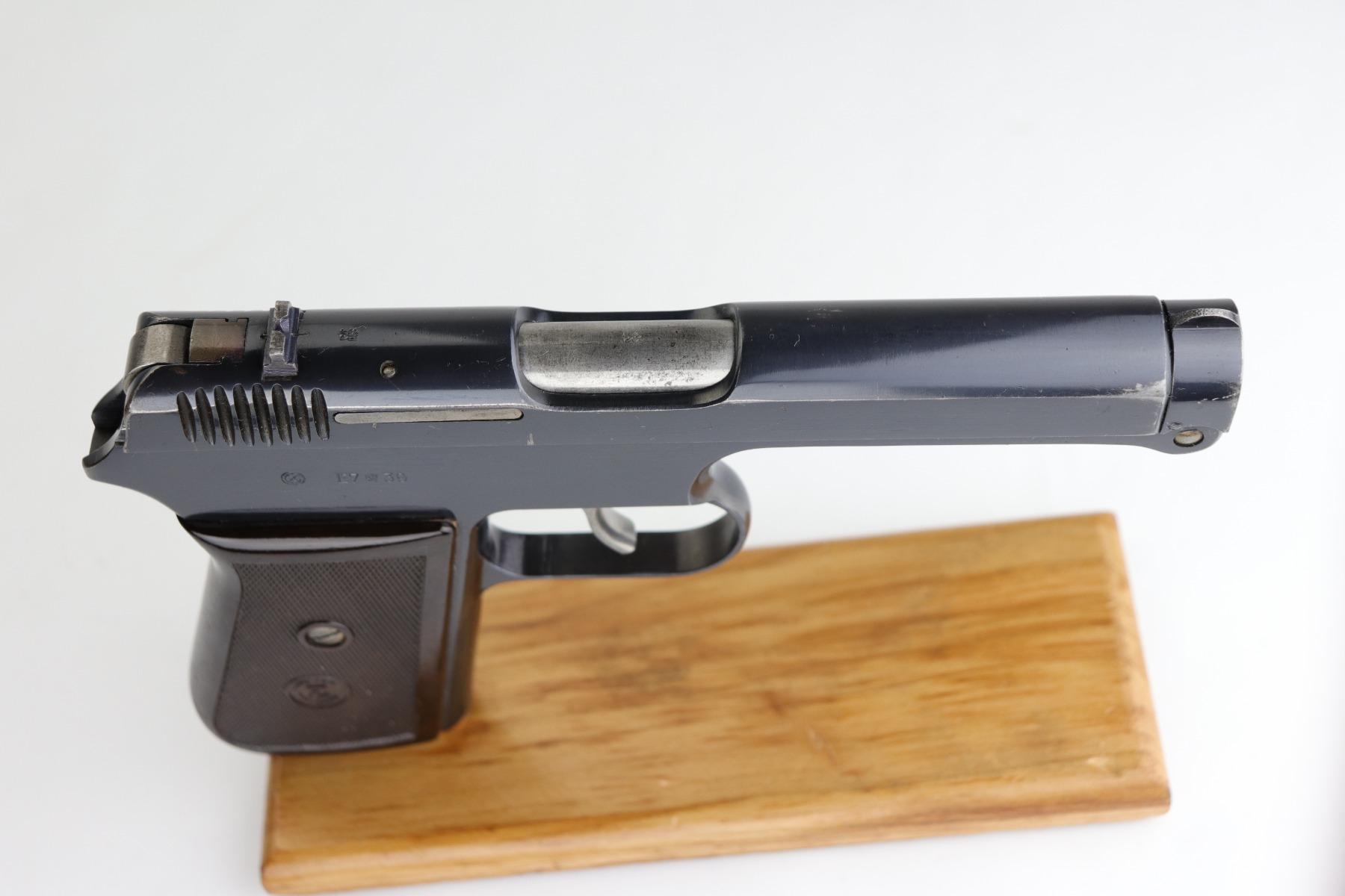 4/6/20 – This is a WW2 Czech CZ Model 38. This is a rare gun, made in 1939 before the Nazi’s took over. It has its original finish – the bluing is excellent, ~98% or better. There are just a few very light surface marks here and there and some high-edge wear around the muzzle. The pistol is marked with two Czech lion proofs on the top of the slide and the ejection port. The gun has its original grip. There are no major chips, just a few very light handling marks. It also comes with one original magazine. This is the first we’ve offered in a long time.