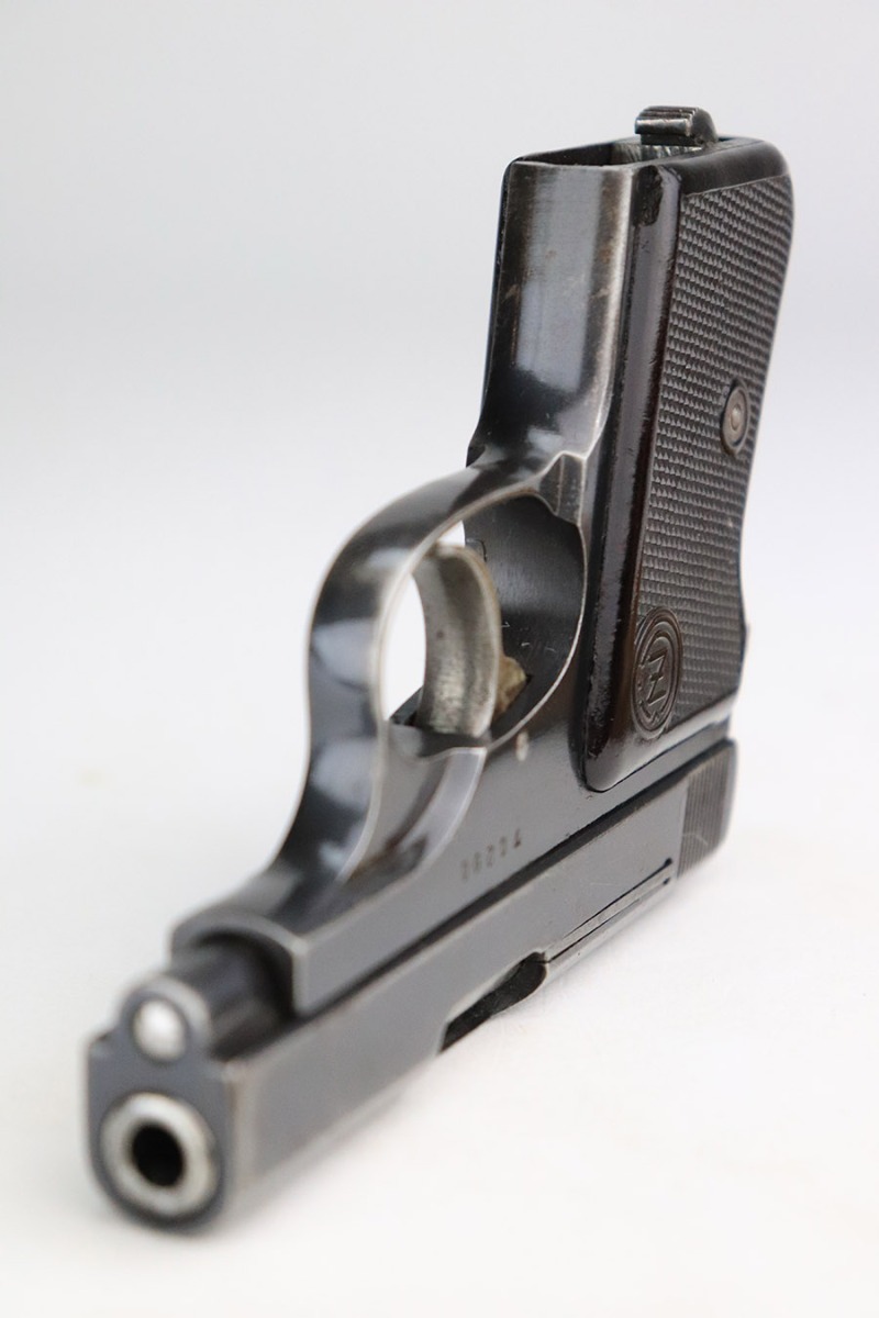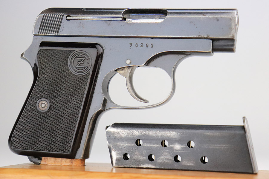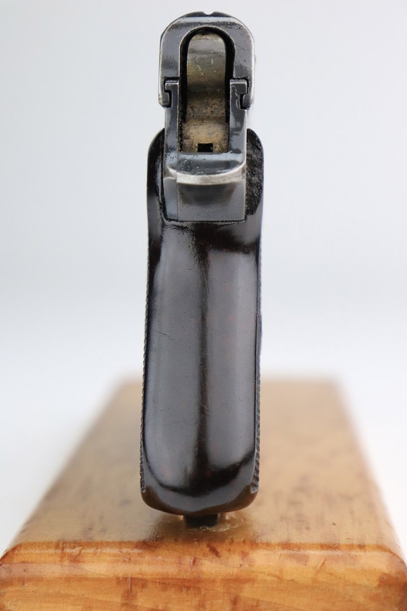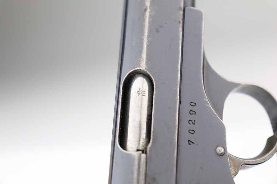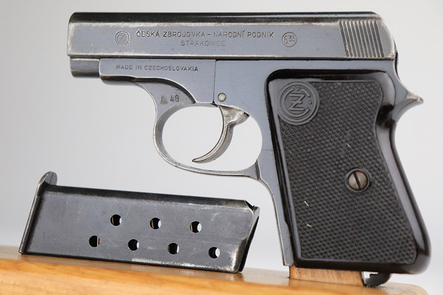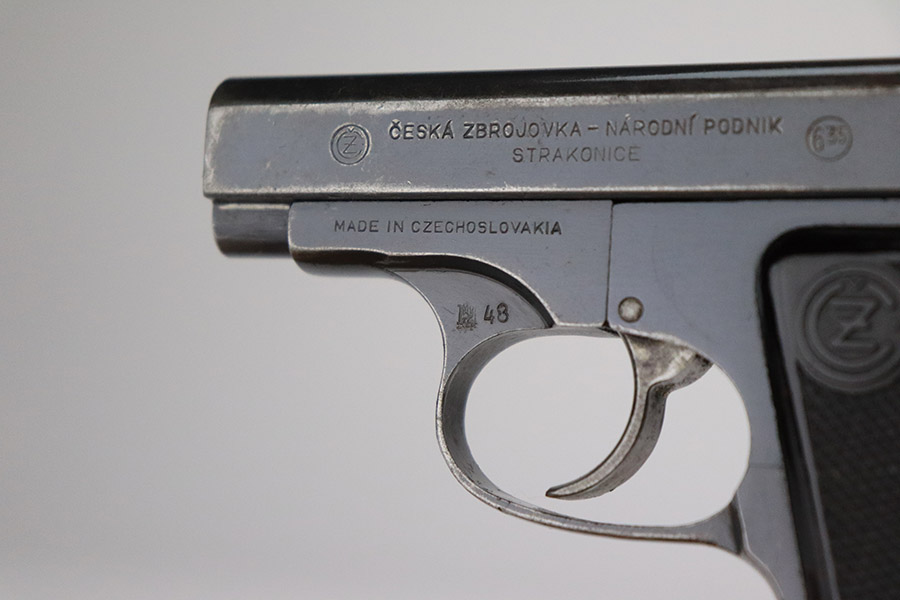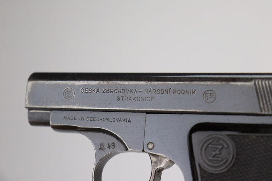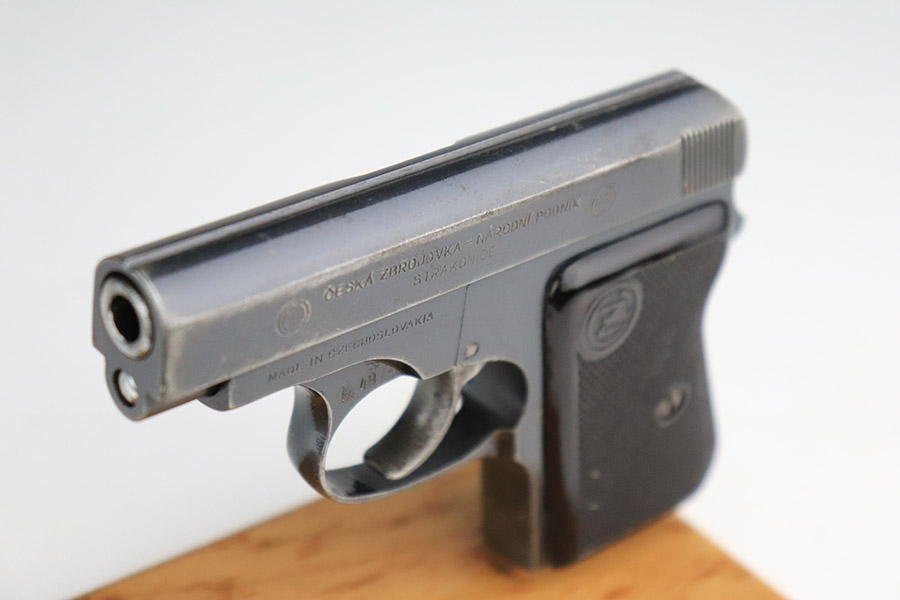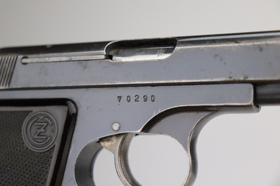 11/9/22 – This is a nice example of the somewhat scarce CZ Vz. 45 pistol, made in 1948. These were an updated design on the CZ-36 in an attempt to make it easier and cheaper to manufacture. The safety lever was removed and a sideplate was added for easier disassembly. This one is all matching and has the proper Czech Lion proofs throughout. It has retained roughly 80-85% of its original finish. The majority of the wear is concentrated around the muzzle and high edges of the slide. There is also some minor wear on the front strap. Comes with a very nice brownish bakelite grip – tiny chips in each of the bottom corners. Also comes with one proper magazine. Excellent bore with strong rifling.