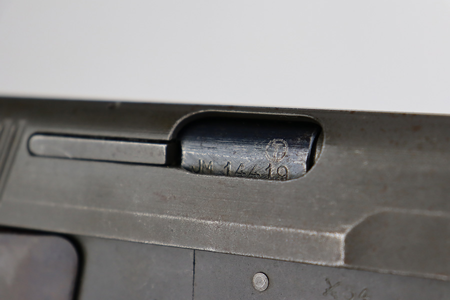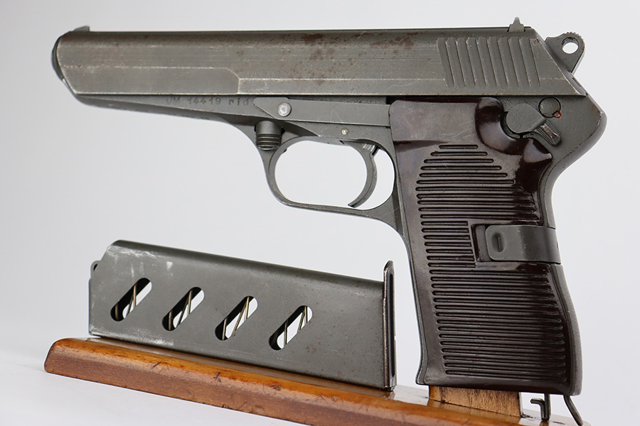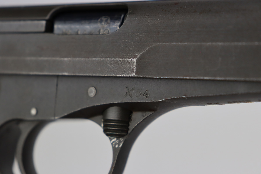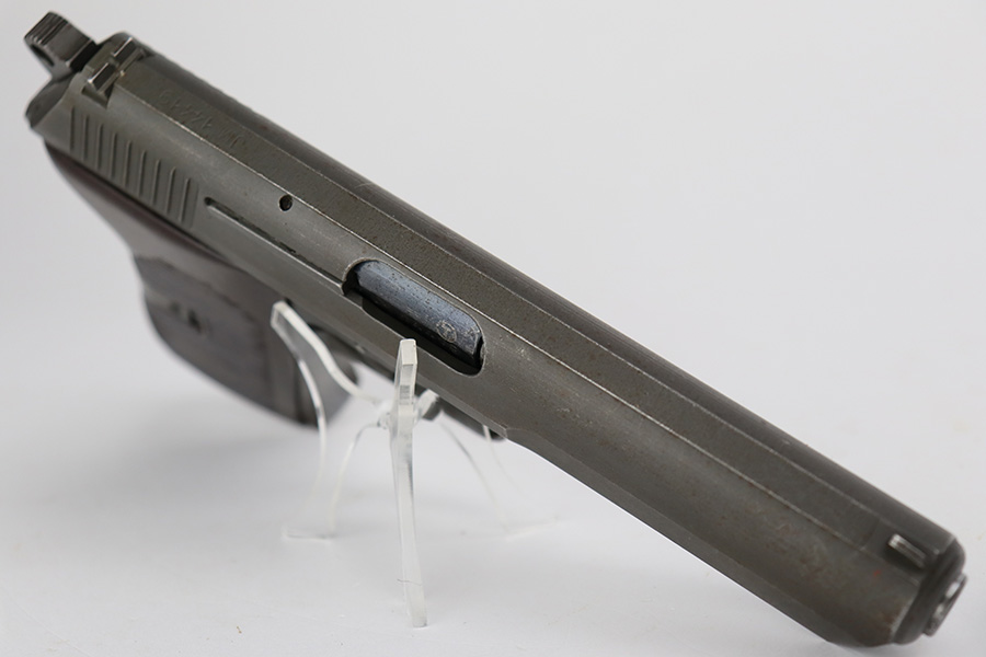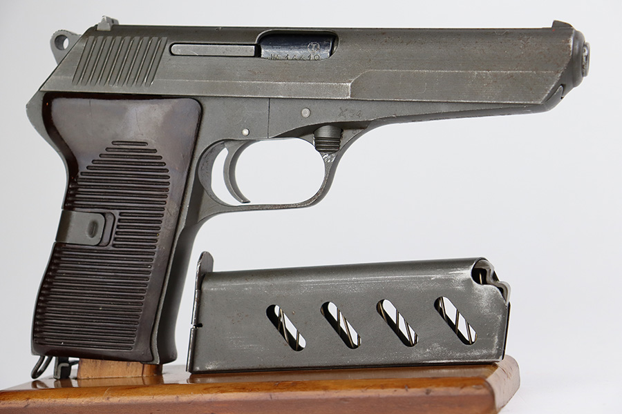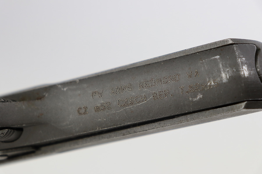 8/7/23 – This is a very nice example of a Czech CZ Model 52 pistol manufactured in 1954. It is all matching and bares an import mark on the underside of the frame. This one has a military parkerized finish. There is very little actual finish loss, but there is obvious spotty discoloration along both sides of the slide. Minor general high edge wear. Fitted with excellent brown bakelite grips. Comes with one proper magazine. Excellent, shiny bore with strong rifling.