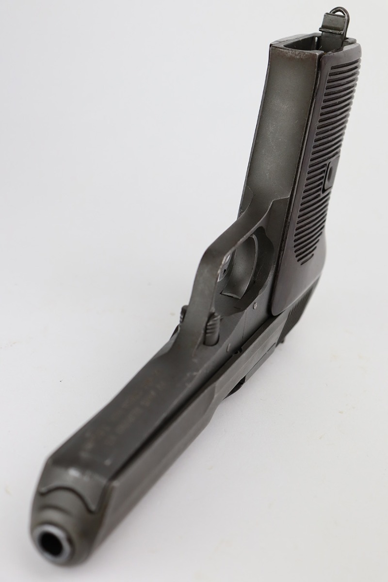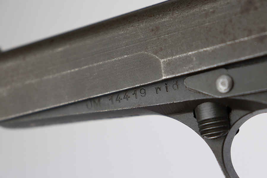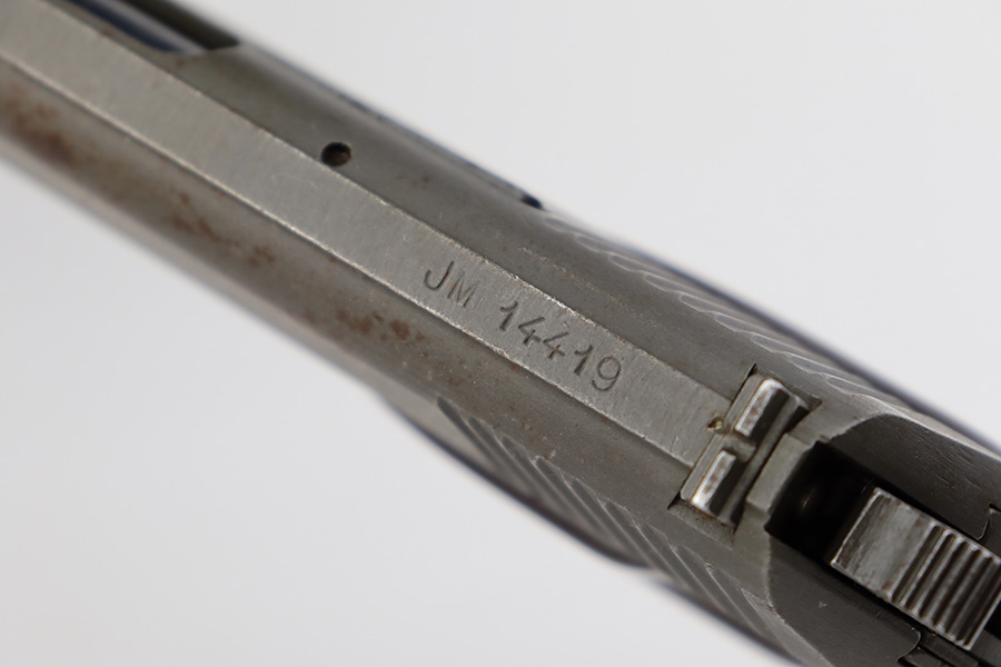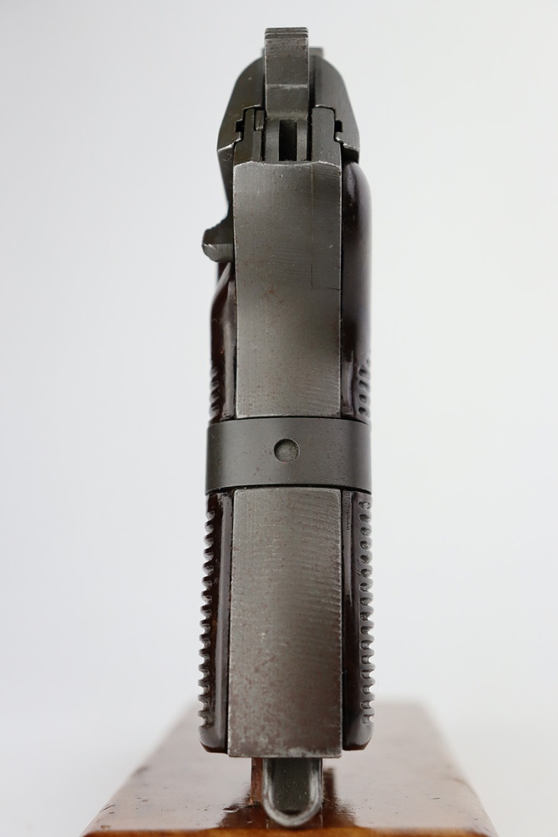 8/7/23 – This is a very nice example of a Czech CZ Model 52 pistol manufactured in 1954. It is all matching and bares an import mark on the underside of the frame. This one has a military parkerized finish. There is very little actual finish loss, but there is obvious spotty discoloration along both sides of the slide. Minor general high edge wear. Fitted with excellent brown bakelite grips. Comes with one proper magazine. Excellent, shiny bore with strong rifling.