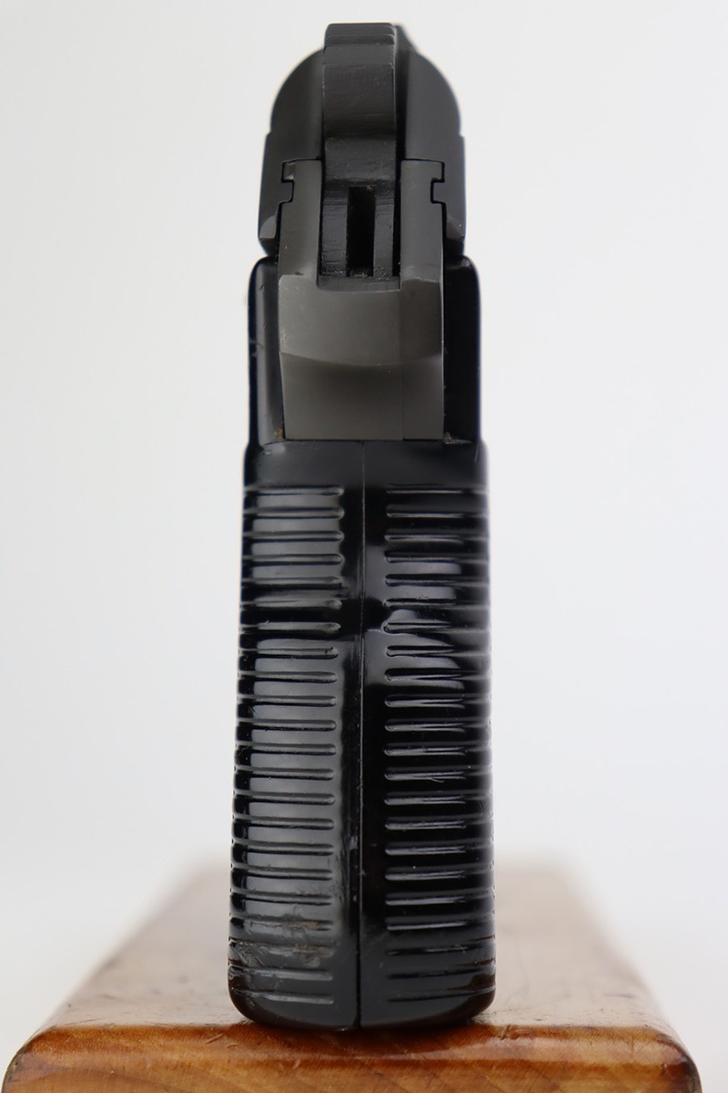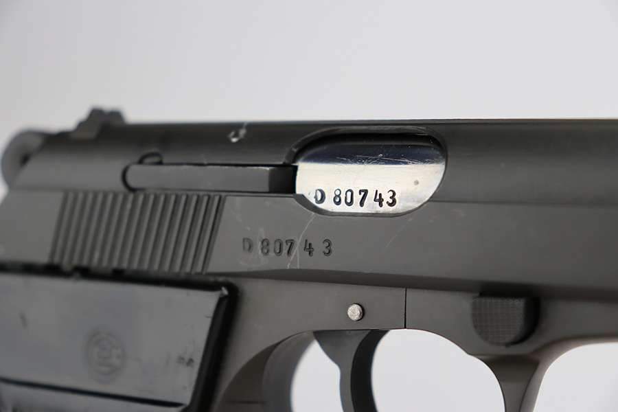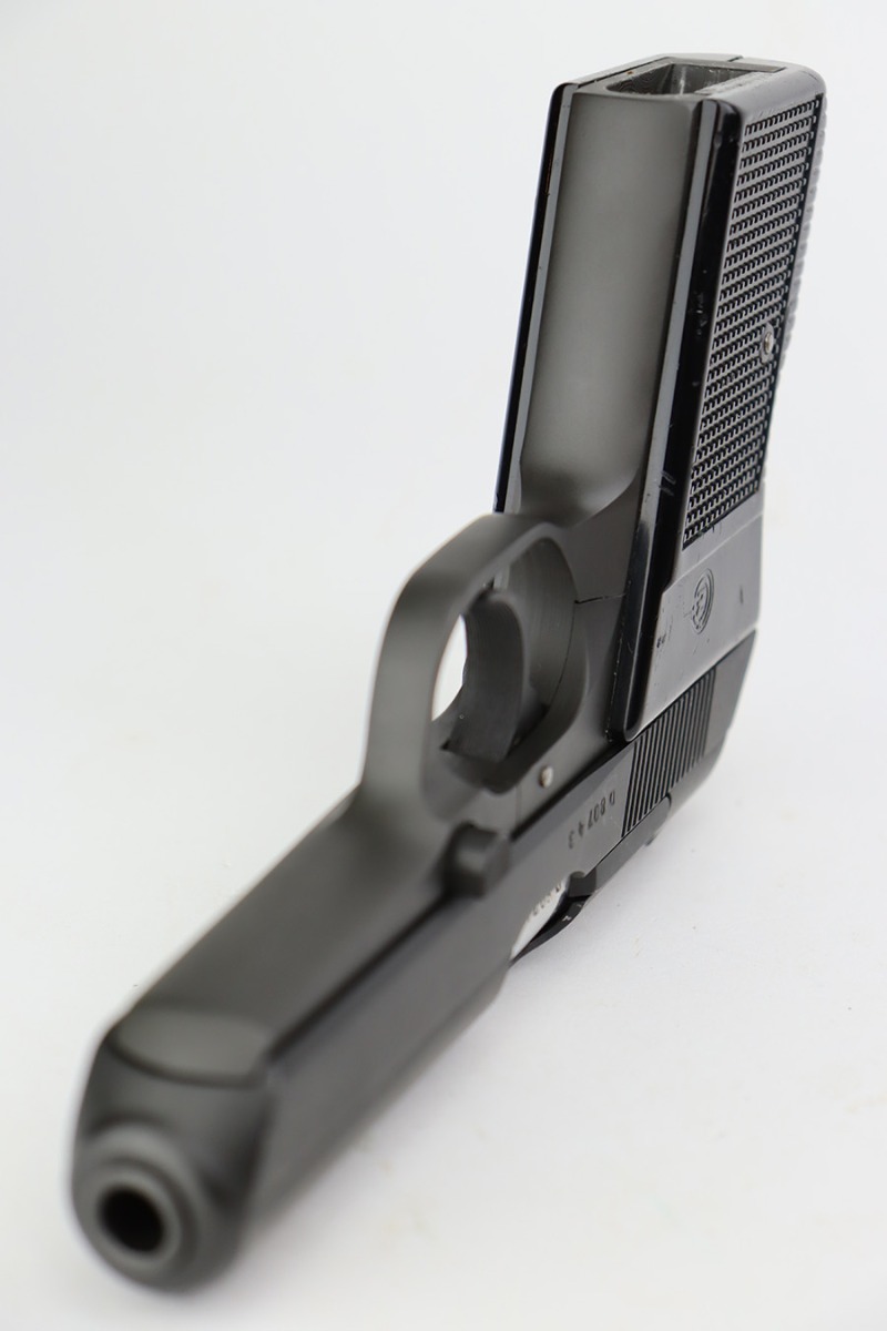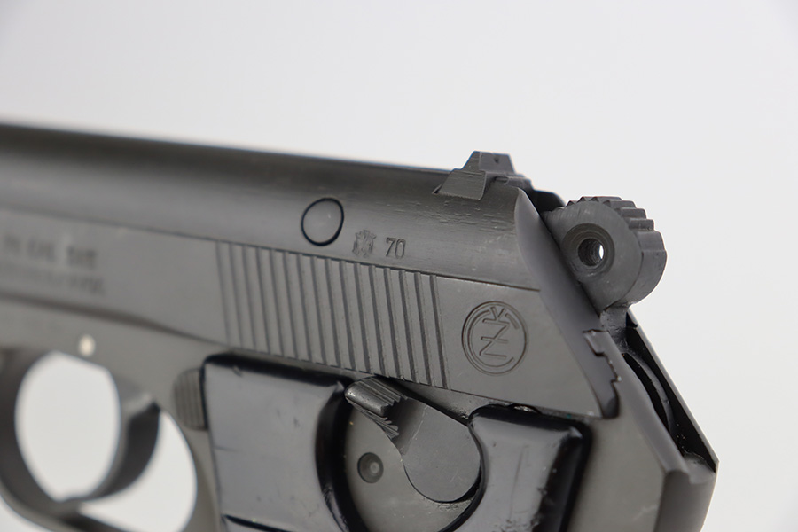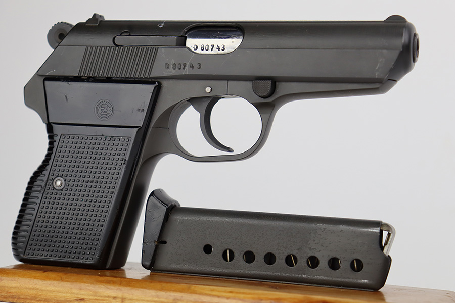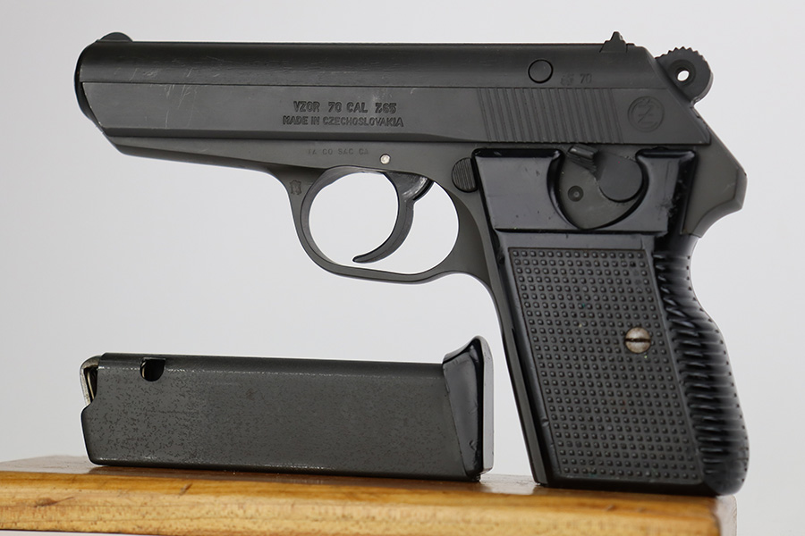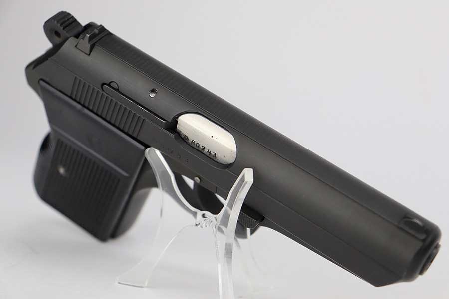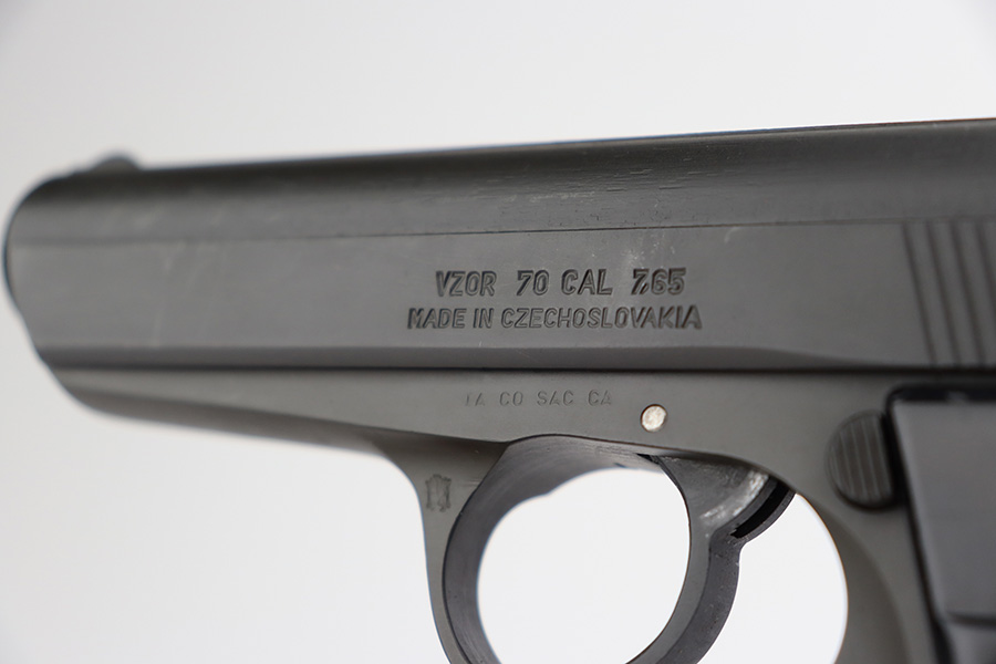 7/28/23 – This is a mint example of a Czech CZ VZOR Model 70, manufactured in 1970 and chambered in 7.65mm. All matching with the proper Czech lion proofs throughout. Small import mark on the left side of the frame. The gun has retained essentially all of its finish with just a few very light surface scuffs here and there. Fitted with black plastic grips – light scratches and handling marks on both sides. Comes with a finger extension magazine. The bore has good rifling, but there is pin-pricking throughout.