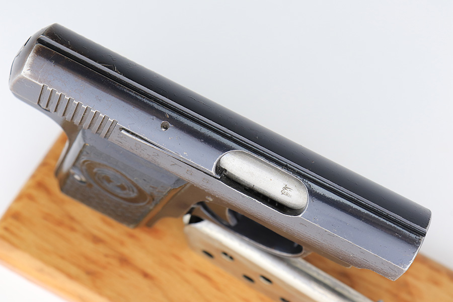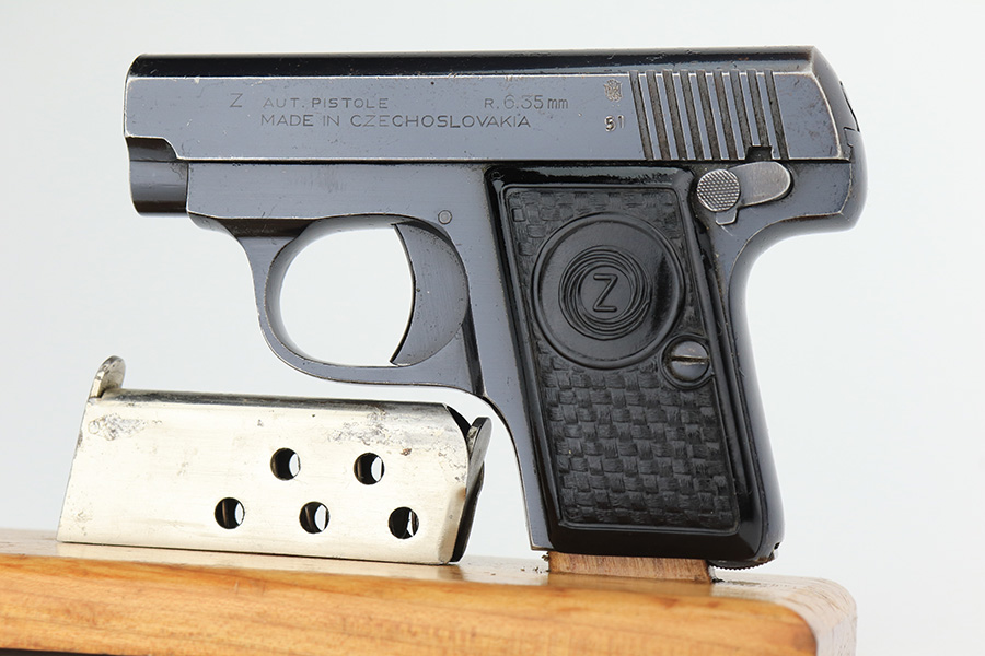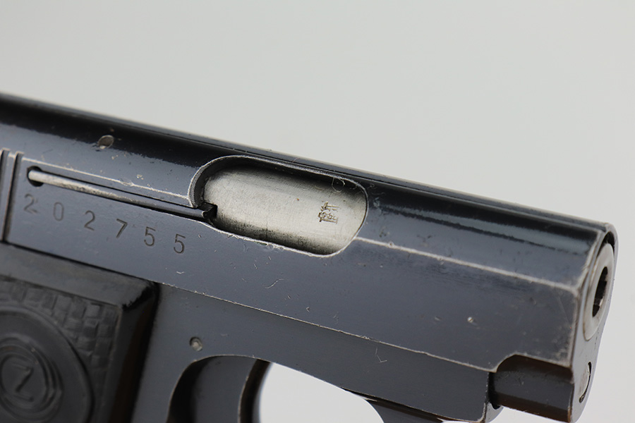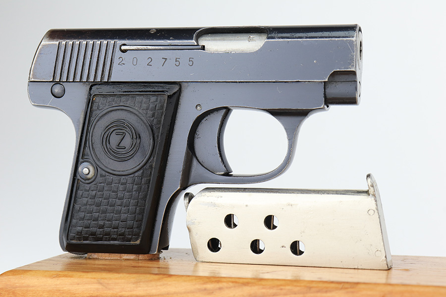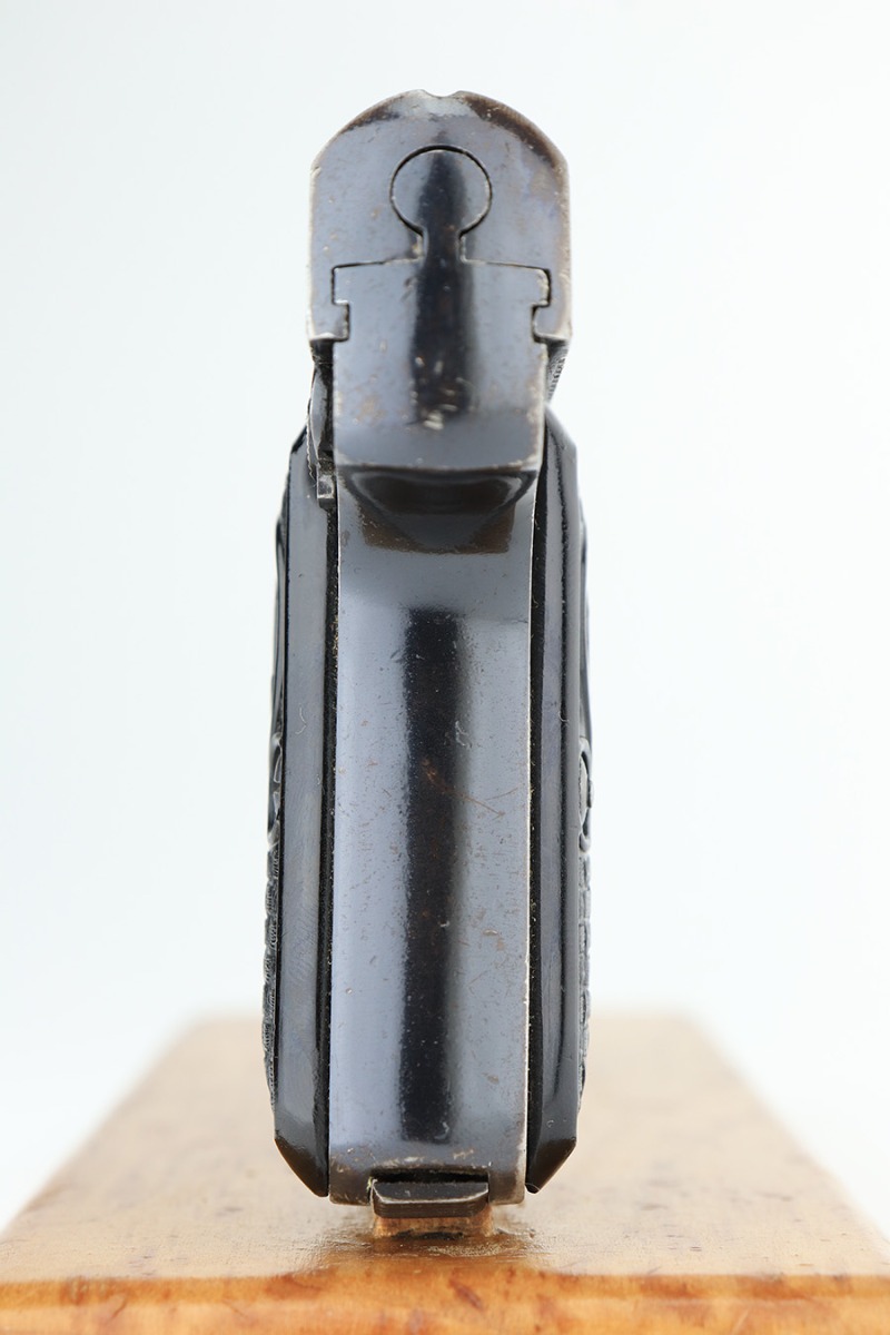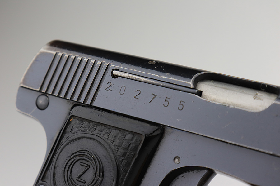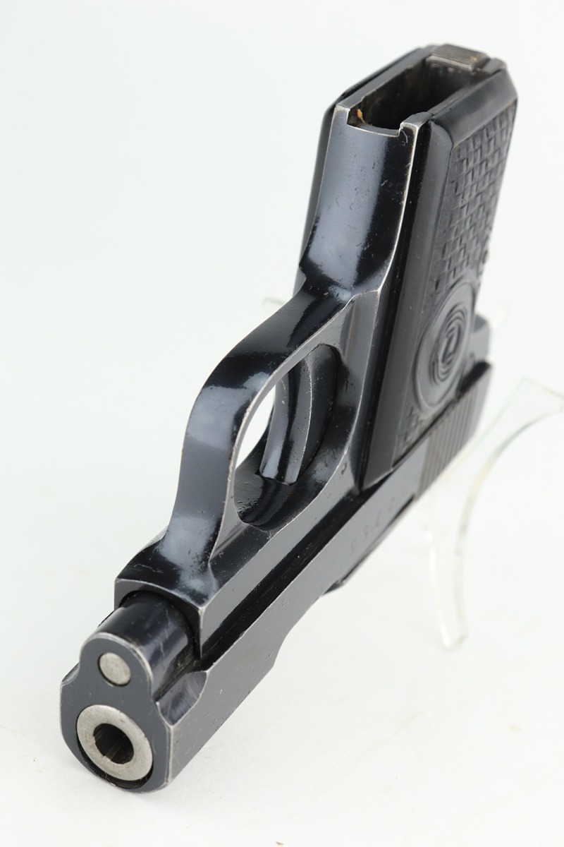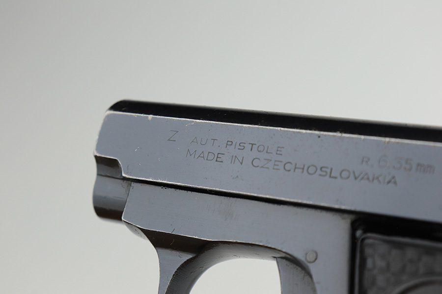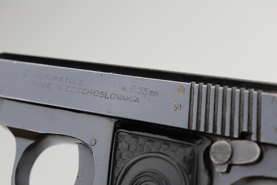 2/14/23 – This is an original and fairly scarce F.Dusek Model Z pistol that was made in 1951 in Czechoslovakia. The Automat Pistole “Z” is a version of the Czech CZ DUO pistol, which was a copy of the Czechoslovakian made MARS 6.35mm pistol, which itself was based on the FN “Baby” Browning pistol design, except excluding the grip safety. From 1938 a Czech firearms manufacturer was producing these pistols using the name DUO, which had ‘Automat Pistole “DUO”’ marked on the slides (and also DUO on the grips). When the manufacturer refused to cooperate with the Nazis during World War II occupation, they took over the factory and proceeded to produce over 110,000 DUO pistols. After the war, under the Soviets, production of the DUO continued until 1948 when the factory was nationalized. After nationalization, production was moved to Ceska Zbrojovka (CZ) in Uhersky Brod, and from that point the pistol was marked ‘Automat Pistole “Z”’ and carried the old trademark of Praga Zbrojovka (a previously acquired weapons manufacturing factory in the area) on the grips, which was was a “Z” in a rifled bore. This one has about 92% of the original blue remaining, with most of the finish loss on the back of the slide but some additional high edge wear and some surface scuffs on the back strap. Excellent bore and grips. An Astra magazine is in this pistol.