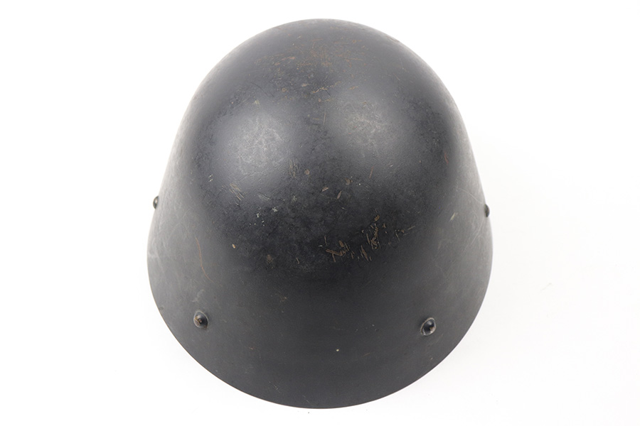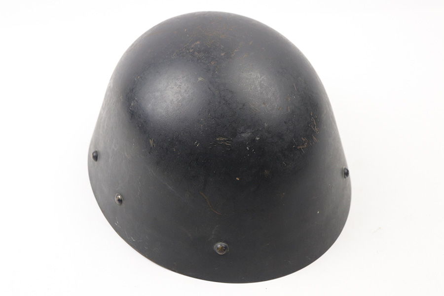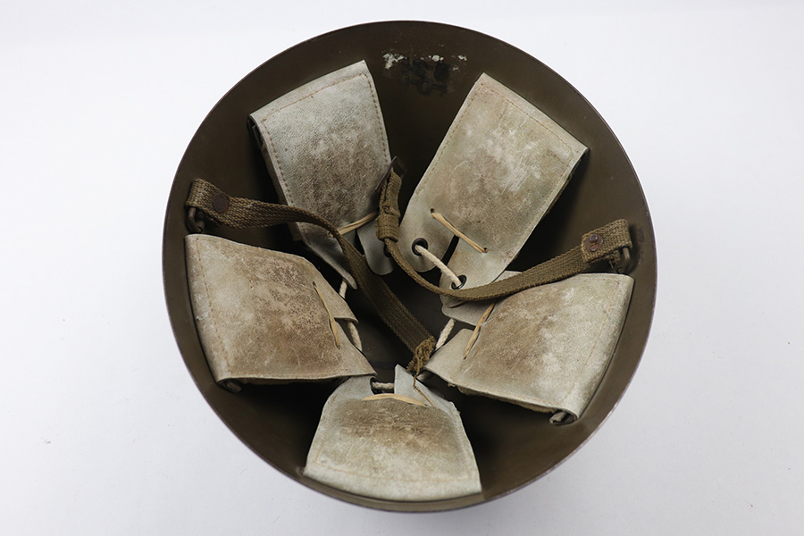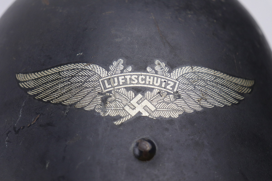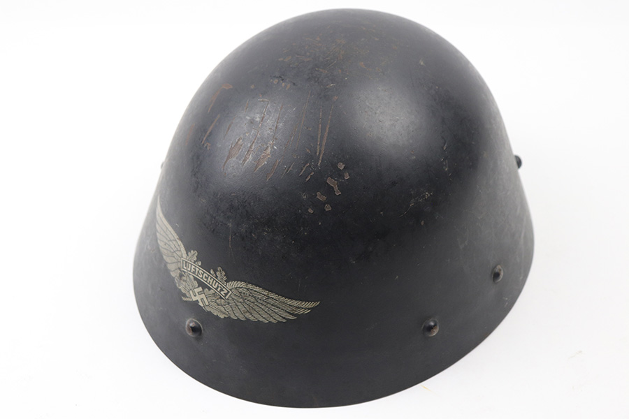 11/2/21 – This is an original WW2 Czech Luftschutz M32 Helmet. The helmet features a dark blue painted exterior shell with a Nazi Luftschutz logo on the front. The logo is about 90% in tact. There’s mild wear on the exterior but no dents or major issues. The interior liner is still in tact, as shown. Tight stitching throughout. The interior shell has a sizing ink stamp, and no other markings.