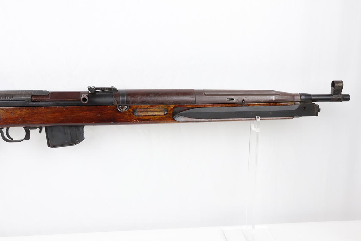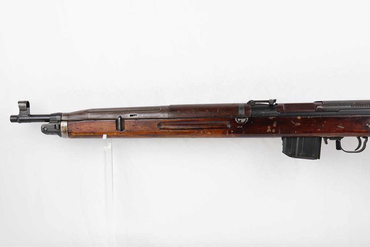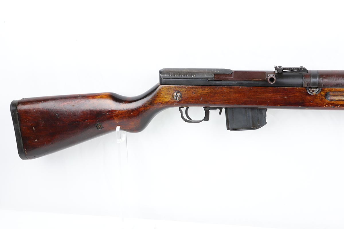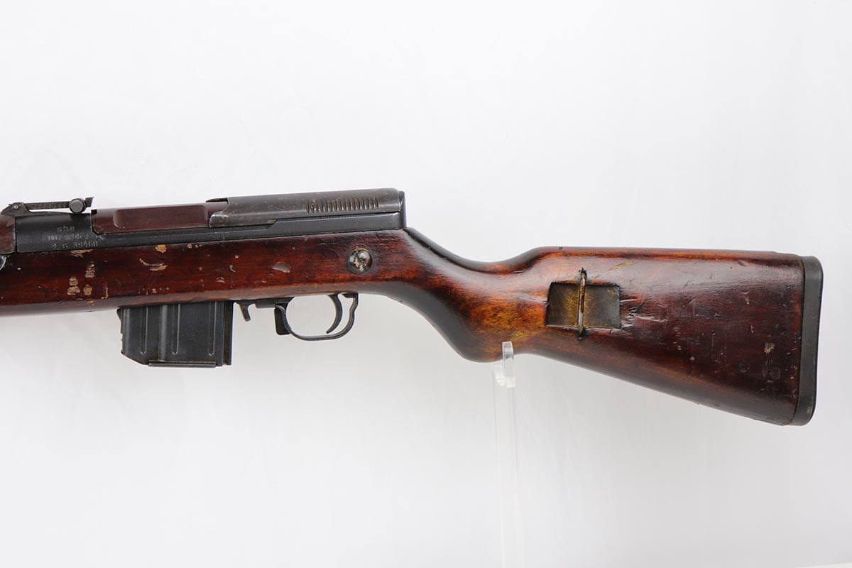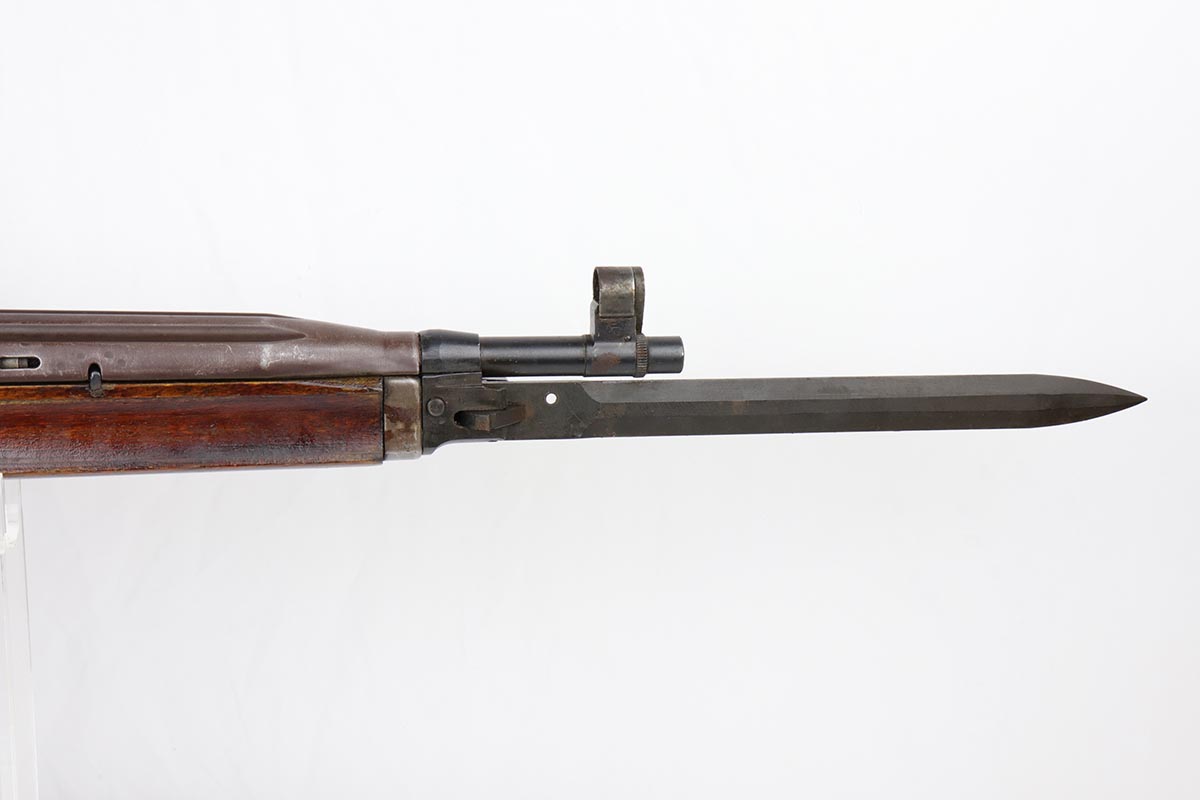 7/18/19 – This is an excellent example of a Czech vz. 52 rifle, manufactured in 1955 at the Povaska Bystrica (SHE) factory. The vz. 52 rifle is a self-loading rifle developed shortly after the Second World War in Czechoslovakia. Its full name is ‘7.62mm samonabíjecí puška vzor 52’. Vz. 52 is an abbreviation for vzor 52, meaning “model 52”. It fires the unique 7.62×45mm cartridge. It is considered both reliable and accurate. The first 5,000 vz. 52 rifles were made by Považské strojárne in Považská Bystrica, but due to production difficulties, its manufacture was taken over by Česká zbrojovka Uherský Brod. The vz. 52 feeds from a detachable box magazine with a 10-round cartridge capacity but could also be rapidly recharged from stripper clips with the bolt retracted. For this purpose, a stripper clip guide is milled into the front face of the bolt carrier, aligning with the magazine when the bolt is locked in the open position. This is the primary method of reloading the rifle as infantrymen were only issued 2 magazines per rifle. It ejects cartridge cases vigorously forward and to the left. This particular rifle has excellent bluing on the finished metal parts, with minimal wear and matching numbers on receiver and bayonet band. The bayonet is also in excellent condition, though the metal handguard shows some patination throughout. Smooth mechanics and bore has strong rifling but some frost and freckling throughout. Stock has various dings and small chips but no cracks or structural issues. This example has NO import mark on it. Receiver is dated to 1955.