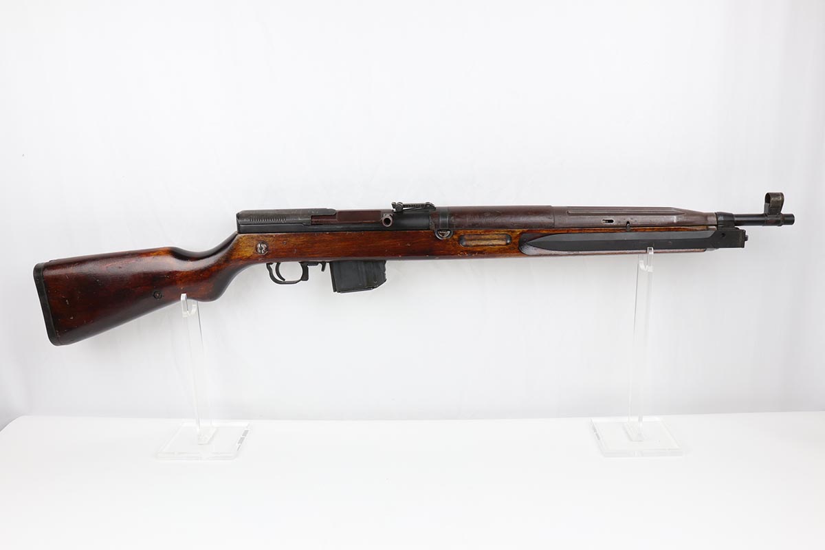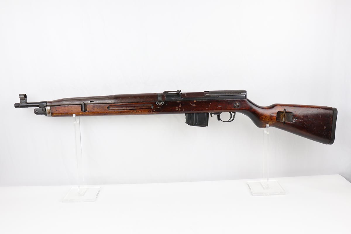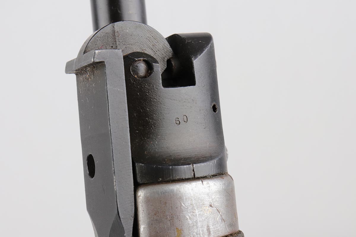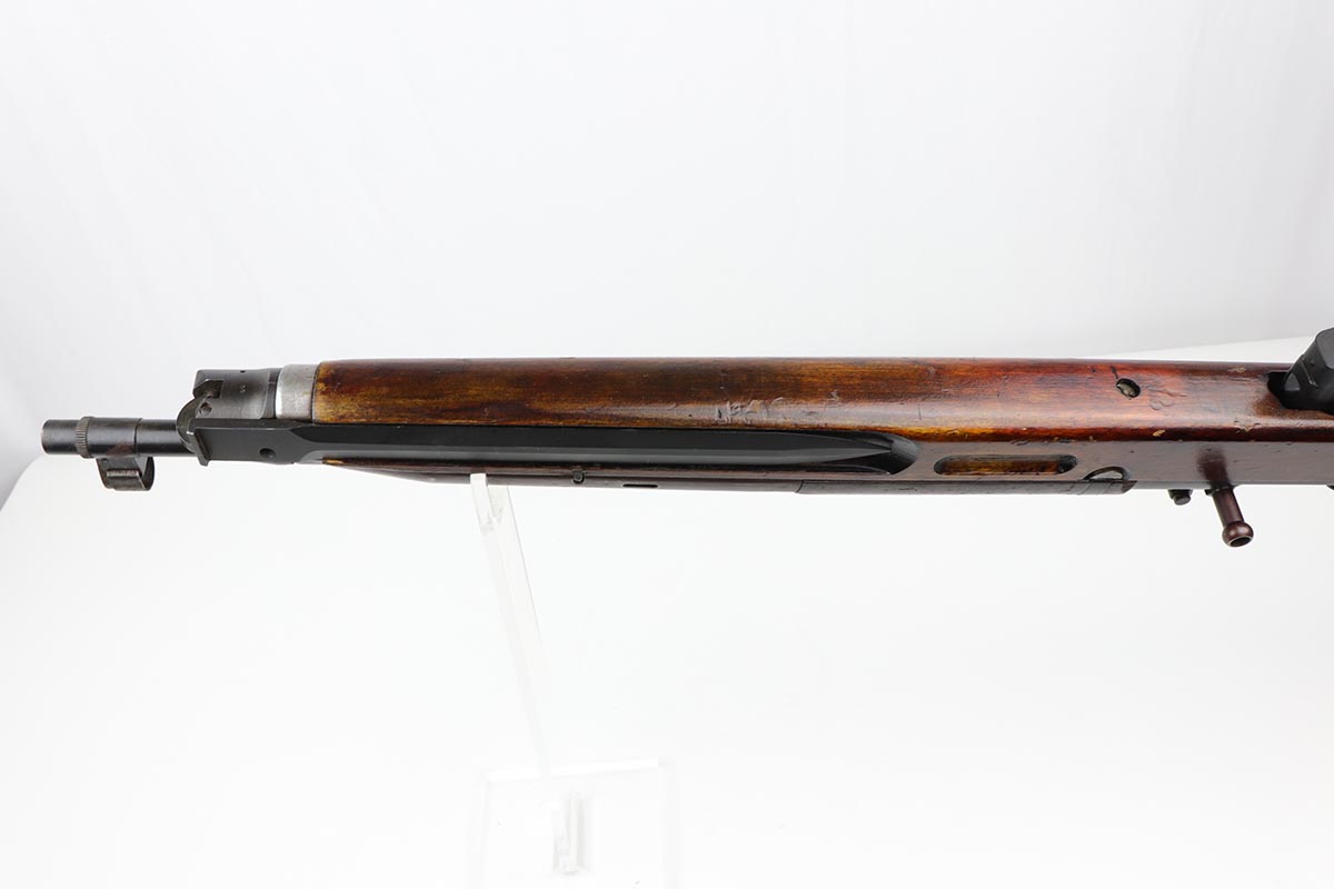7/18/19 – This is an excellent example of a Czech vz. 52 rifle, manufactured in 1955 at the Povaska Bystrica (SHE) factory. The vz. 52 rifle is a self-loading rifle developed shortly after the Second World War in Czechoslovakia. Its full name is ‘7.62mm samonabíjecí puška vzor 52’. Vz. 52 is an abbreviation for vzor 52, meaning “model 52”. It fires the unique 7.62×45mm cartridge. It is considered both reliable and accurate. The first 5,000 vz. 52 rifles were made by Považské strojárne in Považská Bystrica, but due to production difficulties, its manufacture was taken over by Česká zbrojovka Uherský Brod. The vz. 52 feeds from a detachable box magazine with a 10-round cartridge capacity but could also be rapidly recharged from stripper clips with the bolt retracted. For this purpose, a stripper clip guide is milled into the front face of the bolt carrier, aligning with the magazine when the bolt is locked in the open position. This is the primary method of reloading the rifle as infantrymen were only issued 2 magazines per rifle. It ejects cartridge cases vigorously forward and to the left. This particular rifle has excellent bluing on the finished metal parts, with minimal wear and matching numbers on receiver and bayonet band. The bayonet is also in excellent condition, though the metal handguard shows some patination throughout. Smooth mechanics and bore has strong rifling but some frost and freckling throughout. Stock has various dings and small chips but no cracks or structural issues. This example has NO import mark on it. Receiver is dated to 1955.
