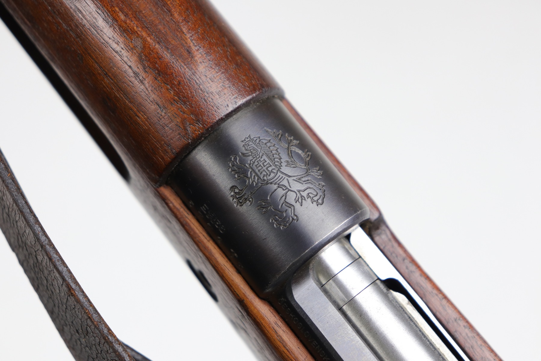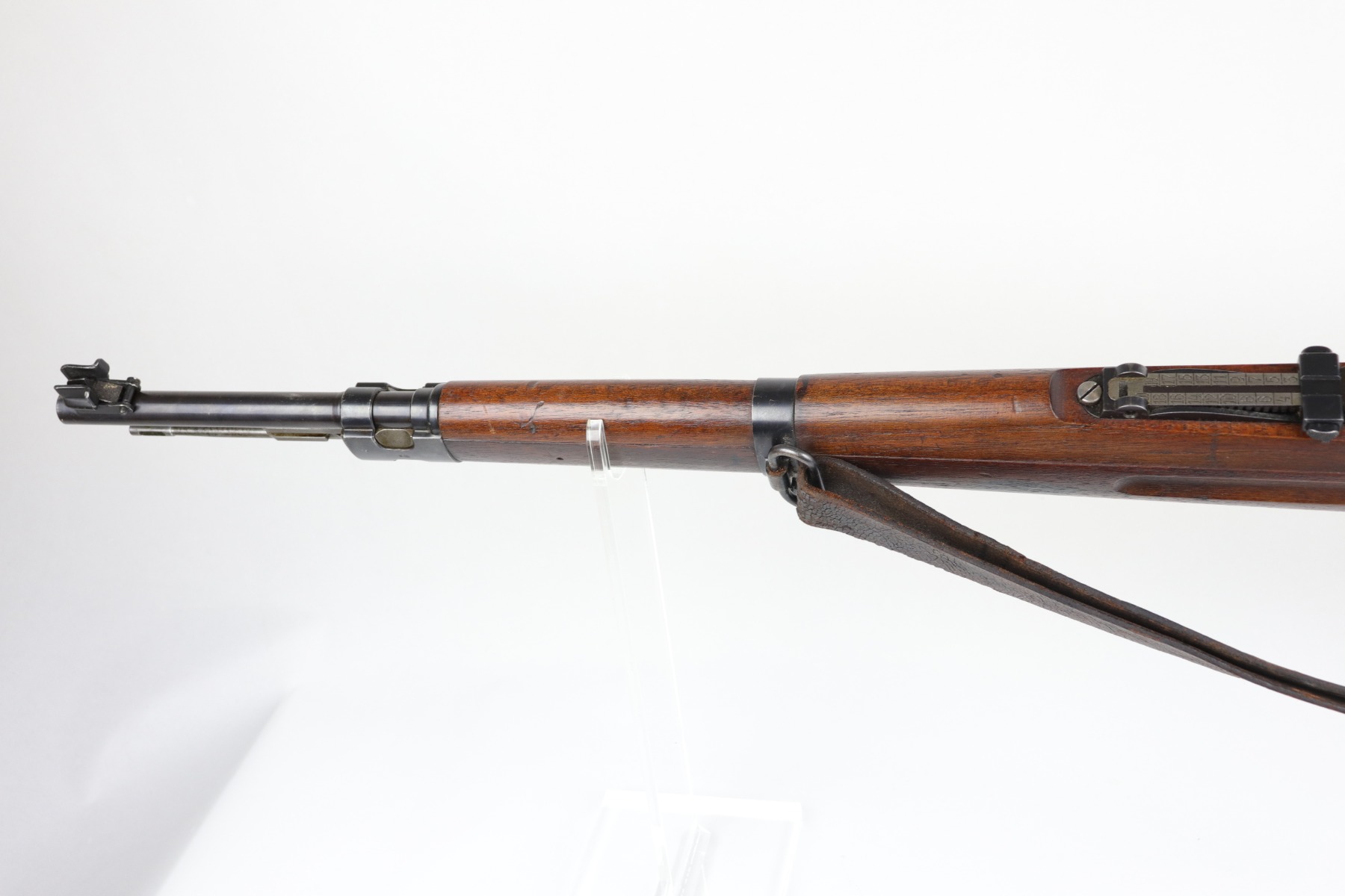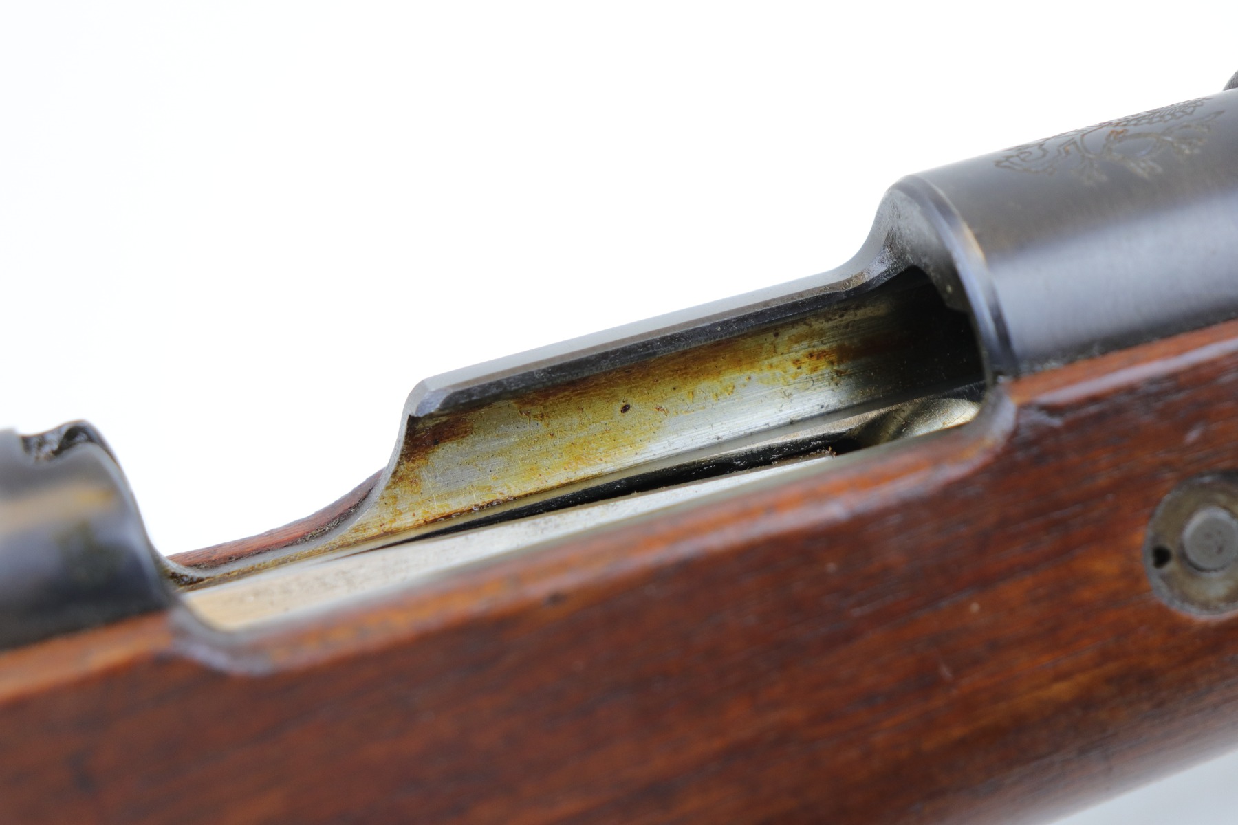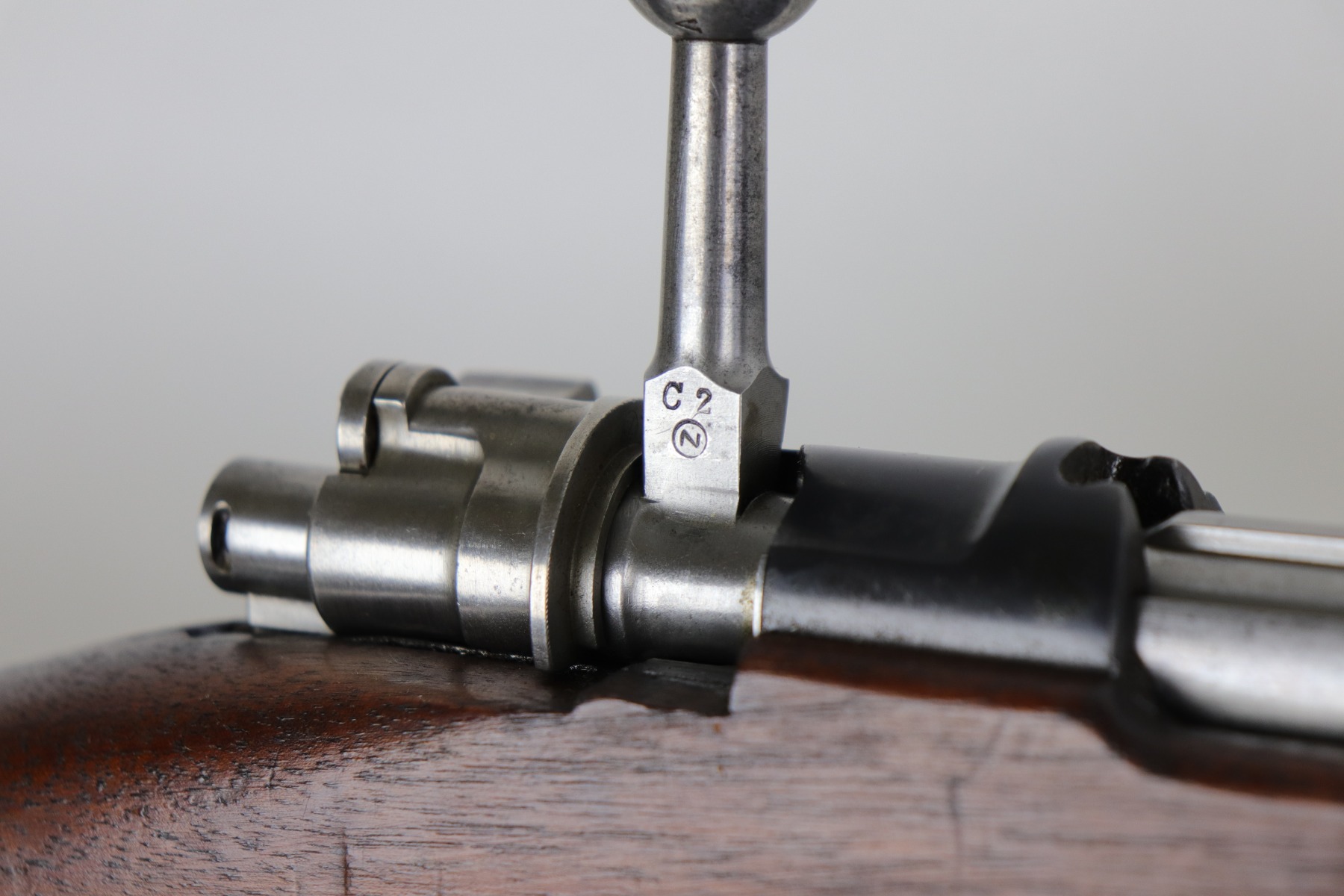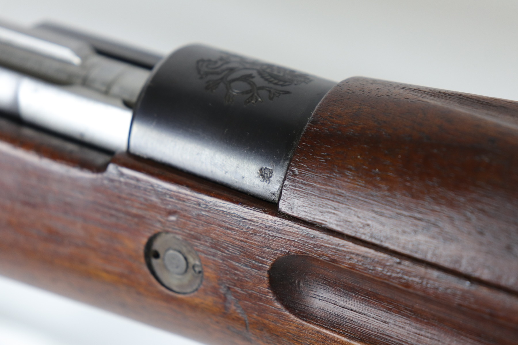 7/28/21 – Original 8mm Czechoslovak VZ24 rifle with Lion crest on the receiver and 1937 acceptance marks. This rifle is in its original configuration with all original finish. Most of the Czech rifles were reworked and reused by the Germans, but this remains unmodified as originally issued just prior to the German occupation of the Sudetenland. The original rust blue finish on the receiver is exceptional, with the internal bolt rails and chamber in the correct “white” finish. There is very little actual finish loss. There are a few handling marks, especially on the barrel and front barrel band and a noticeable scratch on the floor plate. The wood stock is excellent. There is one dark area of discoloration on the left side of the stock. The bore is minty. The late Mauser rifle collector/expert John Wall stated that this rifle was on the only unmodified VZ24 he had ever seen. It comes with an original leather sling that is lion-crested and 1937 dated. Original front sight guard.