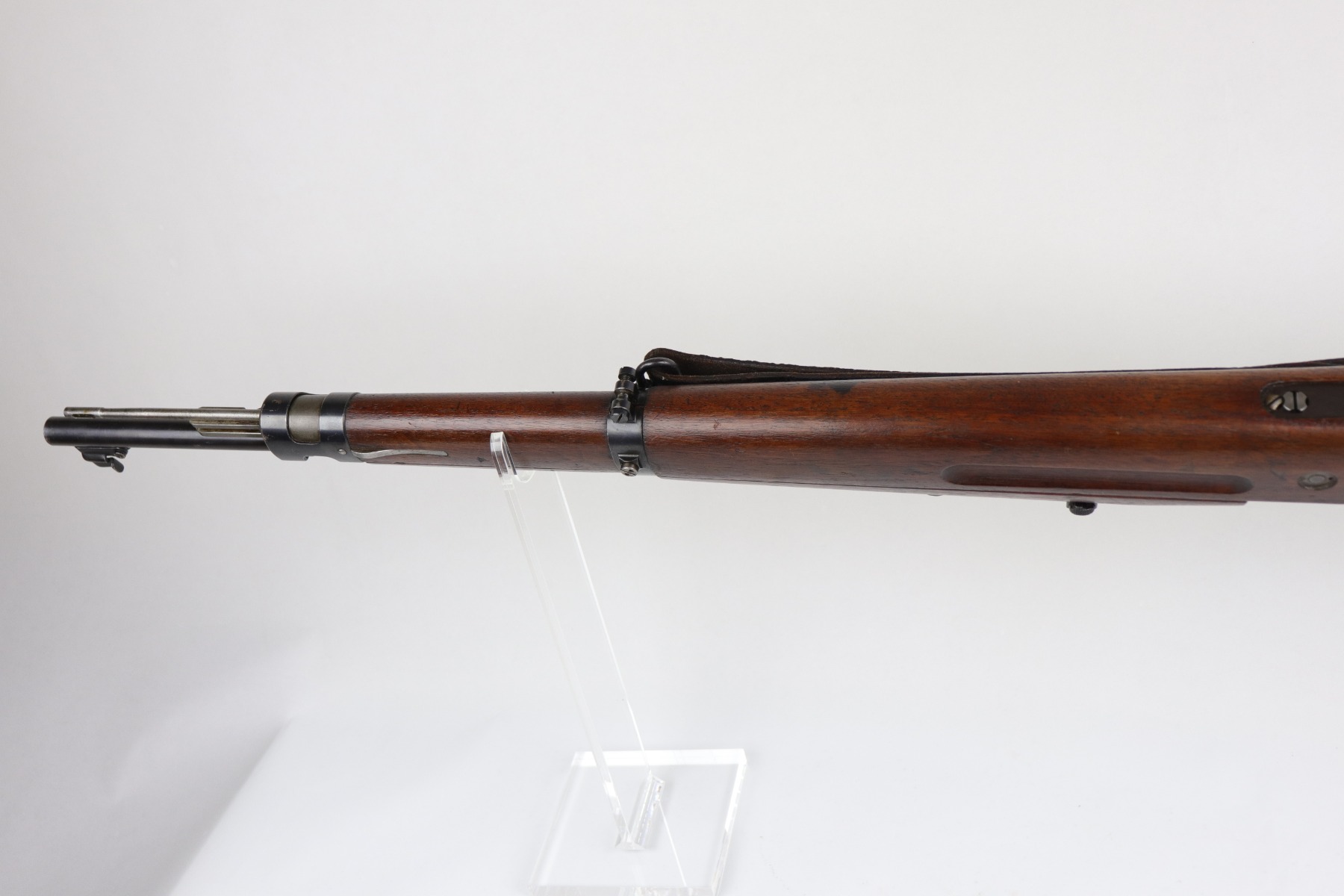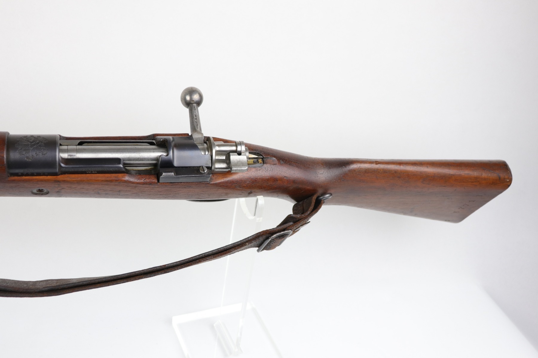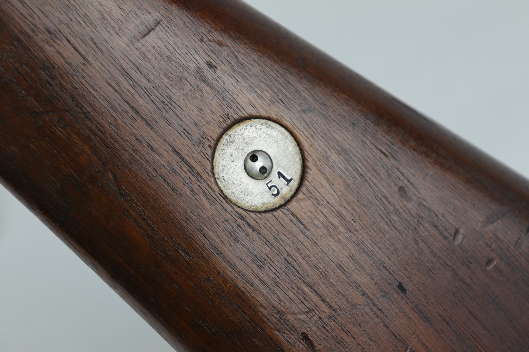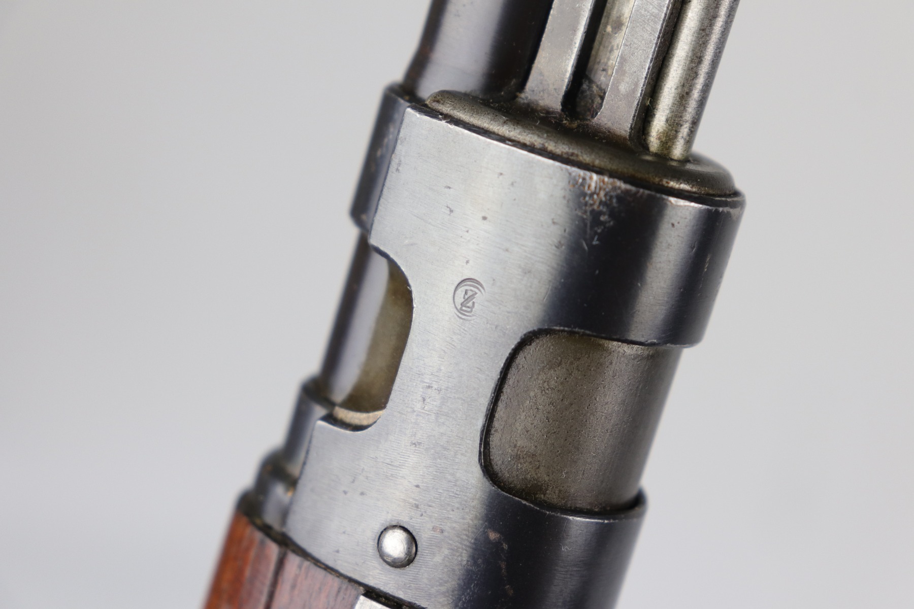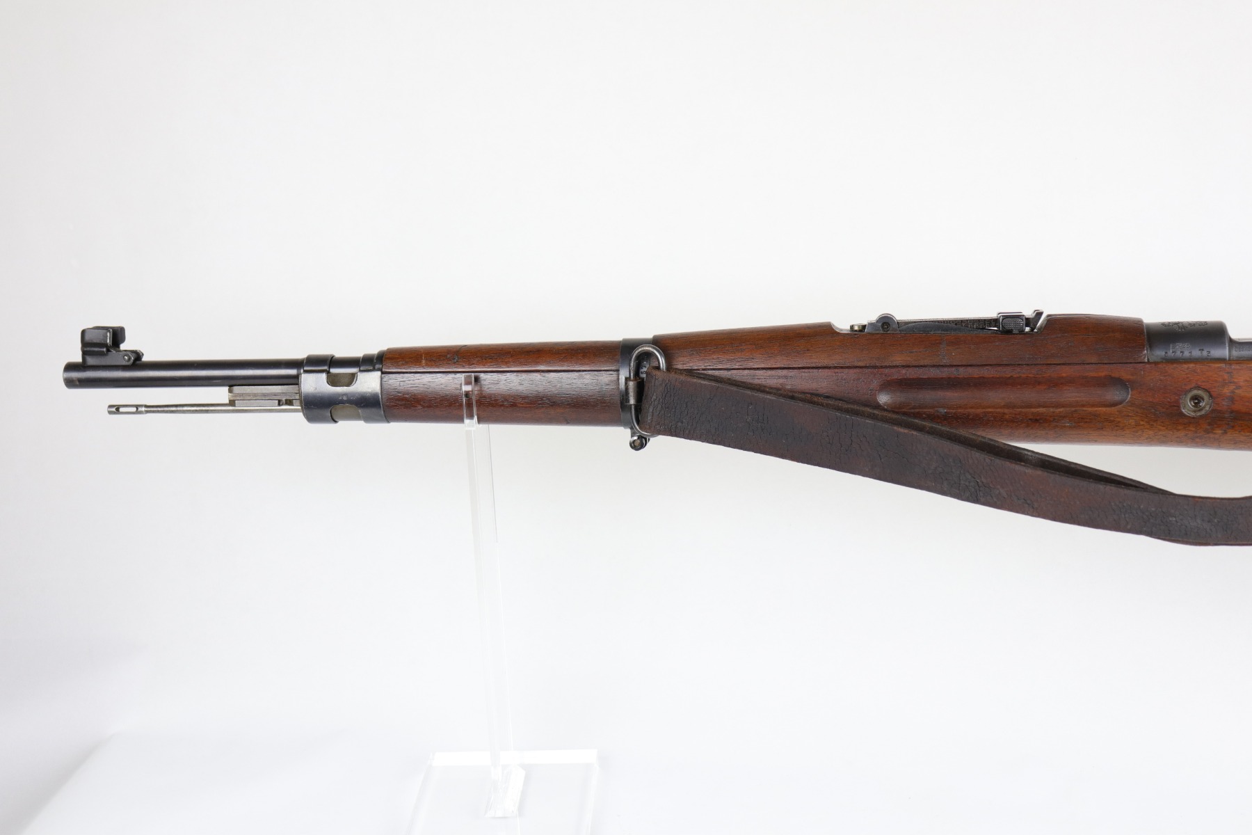 7/28/21 – Original 8mm Czechoslovak VZ24 rifle with Lion crest on the receiver and 1937 acceptance marks. This rifle is in its original configuration with all original finish. Most of the Czech rifles were reworked and reused by the Germans, but this remains unmodified as originally issued just prior to the German occupation of the Sudetenland. The original rust blue finish on the receiver is exceptional, with the internal bolt rails and chamber in the correct “white” finish. There is very little actual finish loss. There are a few handling marks, especially on the barrel and front barrel band and a noticeable scratch on the floor plate. The wood stock is excellent. There is one dark area of discoloration on the left side of the stock. The bore is minty. The late Mauser rifle collector/expert John Wall stated that this rifle was on the only unmodified VZ24 he had ever seen. It comes with an original leather sling that is lion-crested and 1937 dated. Original front sight guard.