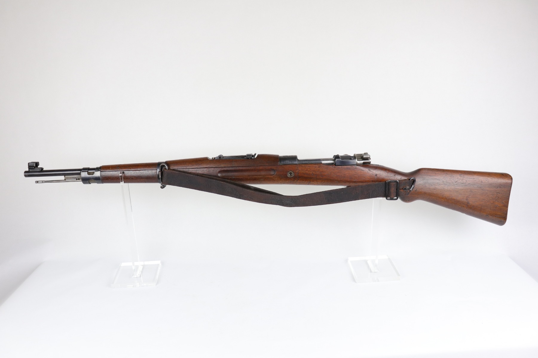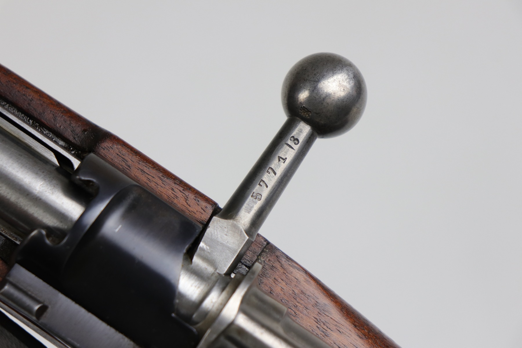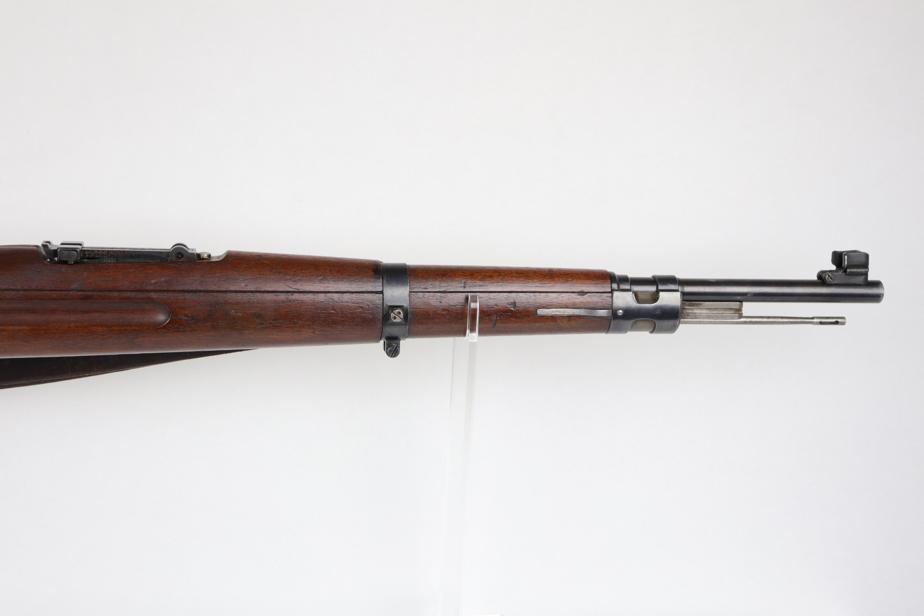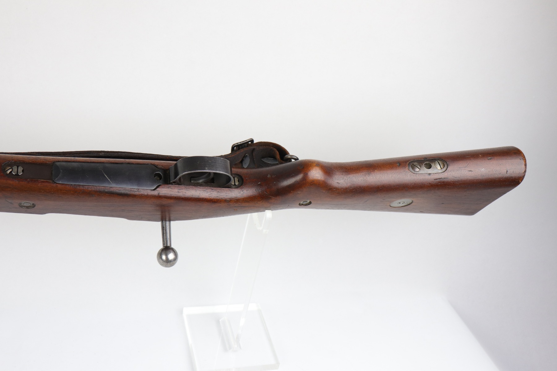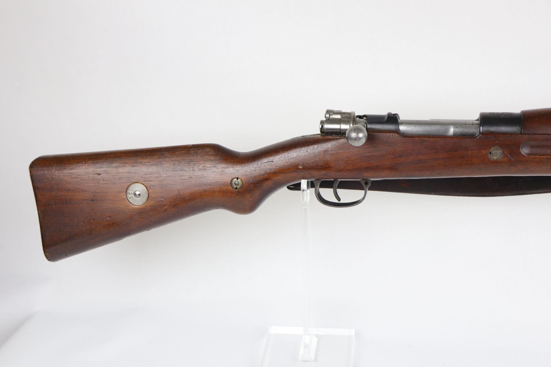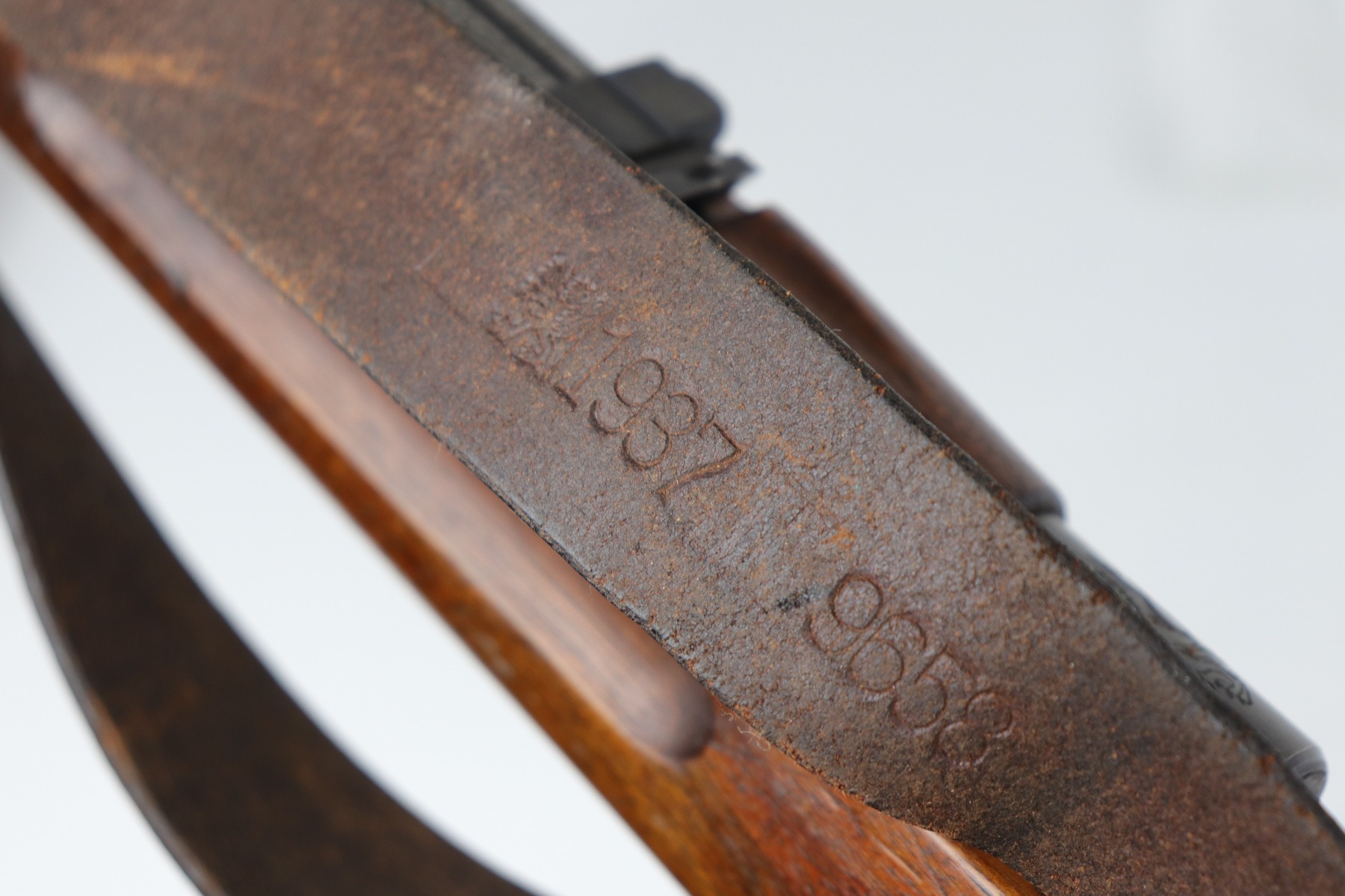 7/28/21 – Original 8mm Czechoslovak VZ24 rifle with Lion crest on the receiver and 1937 acceptance marks. This rifle is in its original configuration with all original finish. Most of the Czech rifles were reworked and reused by the Germans, but this remains unmodified as originally issued just prior to the German occupation of the Sudetenland. The original rust blue finish on the receiver is exceptional, with the internal bolt rails and chamber in the correct “white” finish. There is very little actual finish loss. There are a few handling marks, especially on the barrel and front barrel band and a noticeable scratch on the floor plate. The wood stock is excellent. There is one dark area of discoloration on the left side of the stock. The bore is minty. The late Mauser rifle collector/expert John Wall stated that this rifle was on the only unmodified VZ24 he had ever seen. It comes with an original leather sling that is lion-crested and 1937 dated. Original front sight guard.