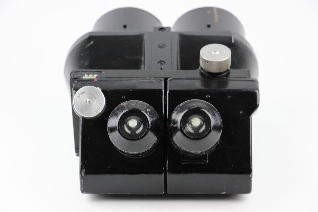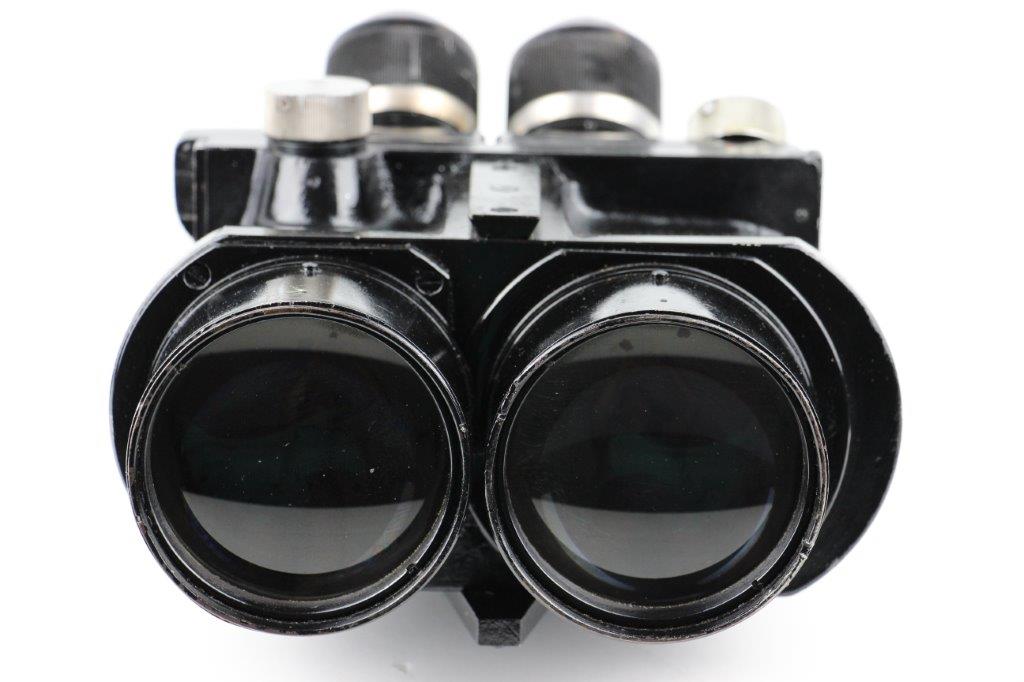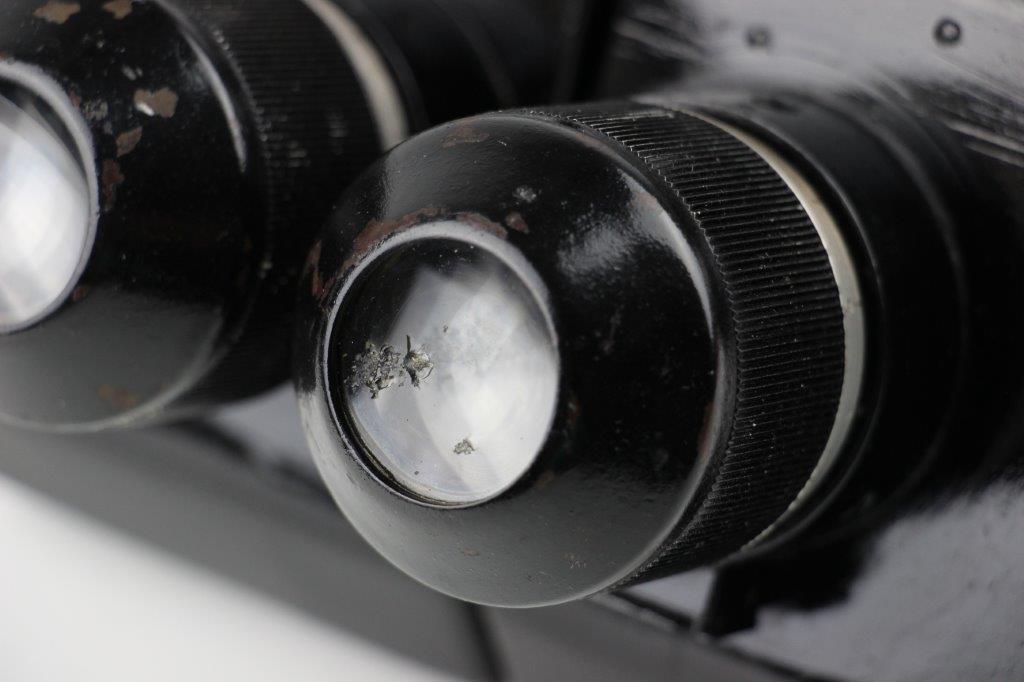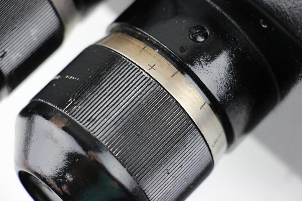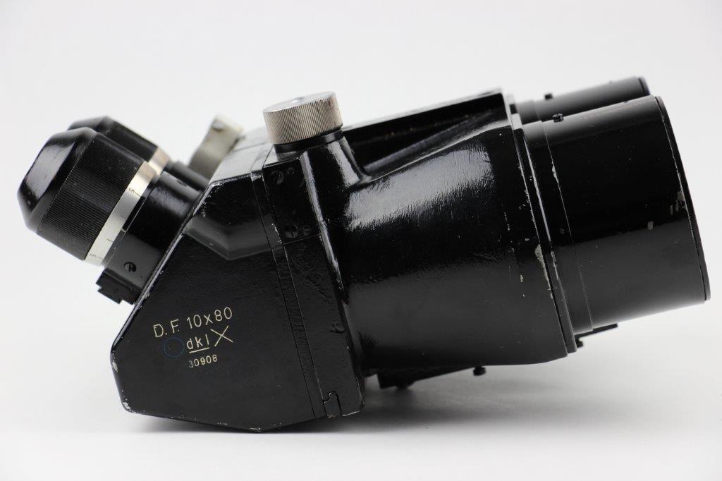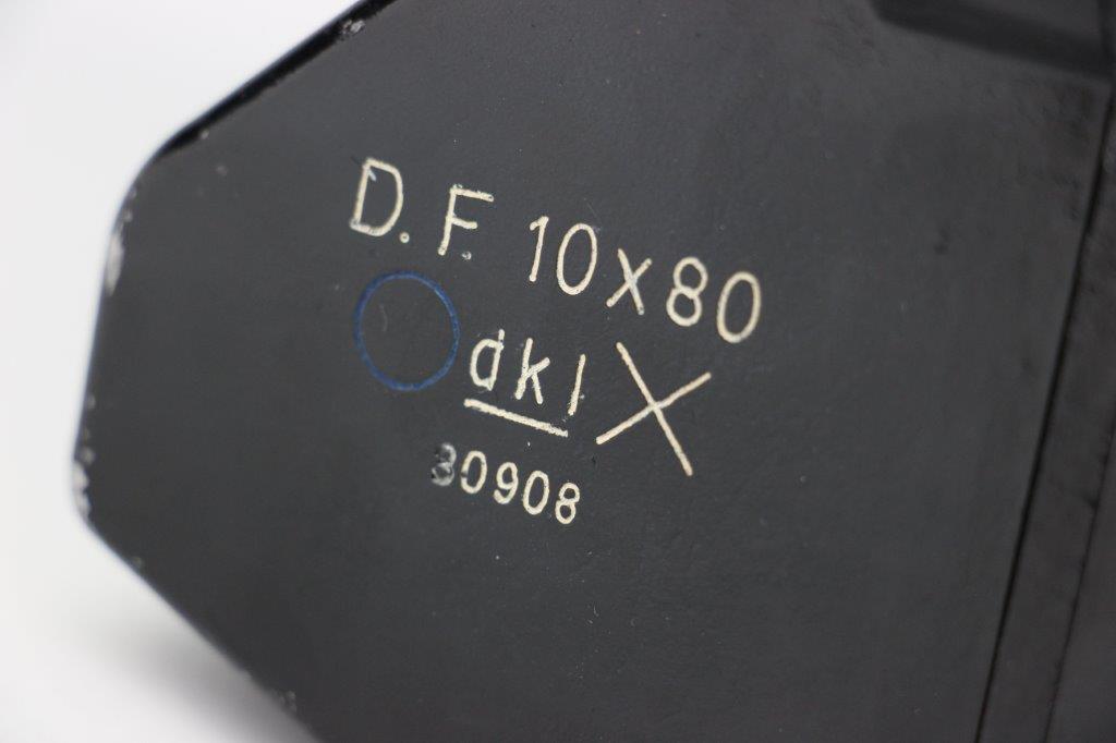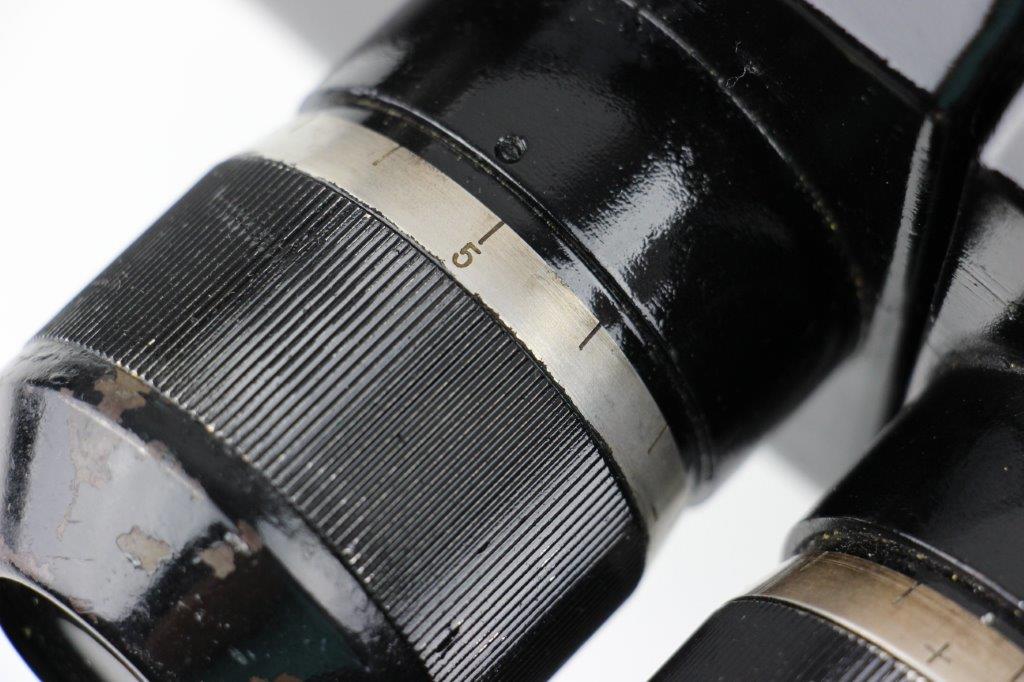 6/10/24 – This is a pair of WW2 German 10×80 Flak Binoculars. These were used by Heer Artillery and Luftwaffe Flak gunners for sighting the Flak 36 (88mm) gun. This example is maker stamped “dkl” by Josef Schneider & Co.. The exterior has a black lacquered paint finish with some high edge wear and signs of aging on the exterior, but without excessive wear or damage. The optics are in fair condition with general cloudiness and some damage to the right eye lens. Visibility remains around 75-80% with functional lens filters for clear, light, medium, and dark. The focusing adjustment on each eye works as intended, as does the eye width adjustment knob. The right side of the exterior is marked with a blue circle and white “X” next to either side of the maker code, which indicates the types of lubricants used during production (treated for cold weather use). The serial number ranges for this maker begin with 5437 up to 82036, which indicates this example as early wartime production.