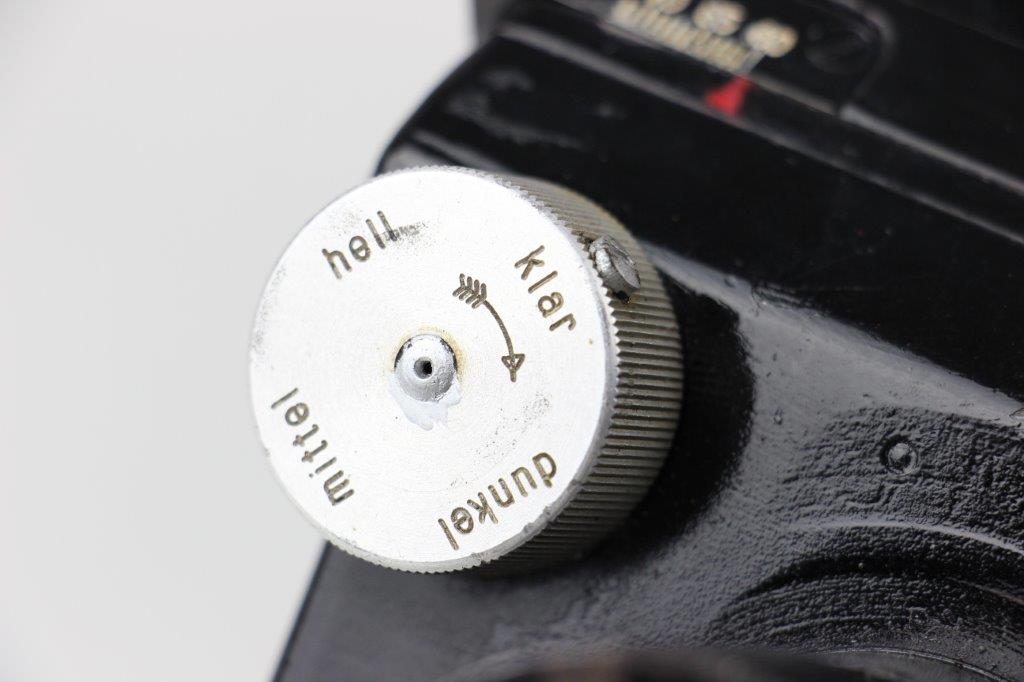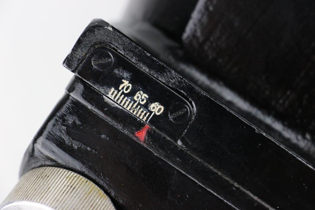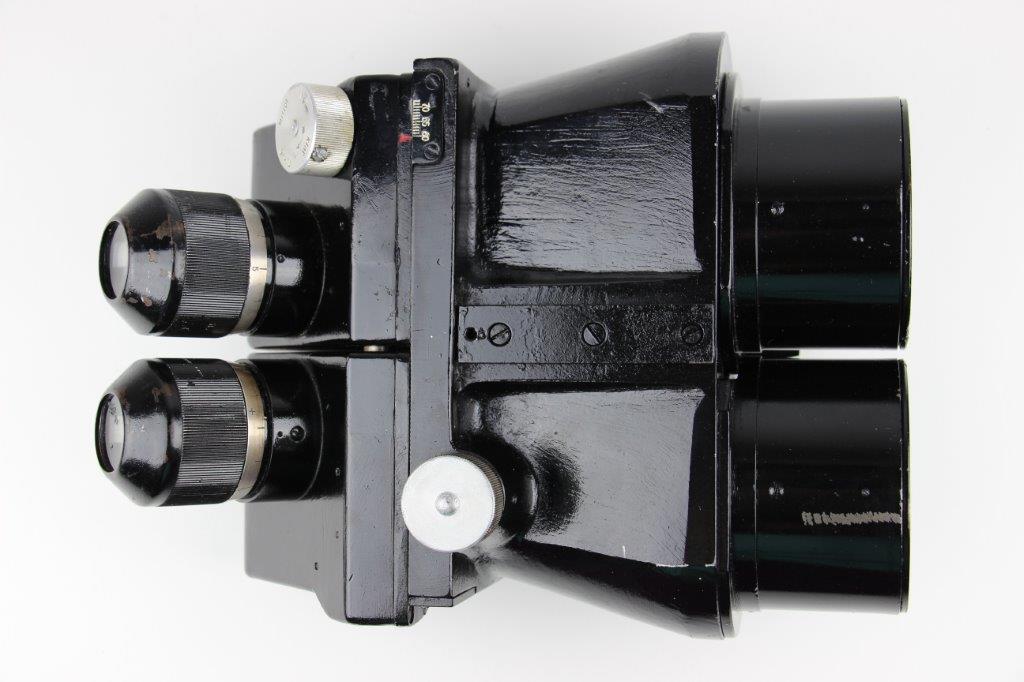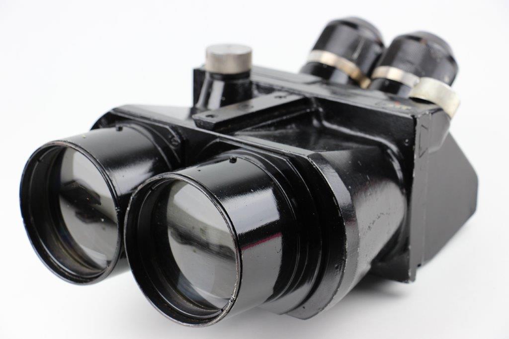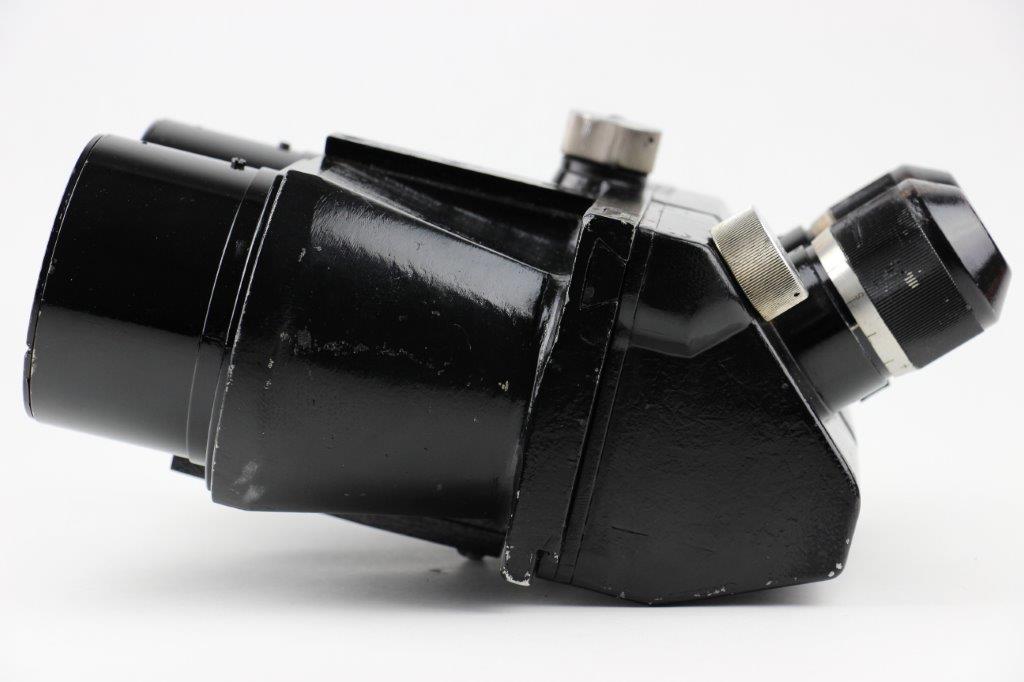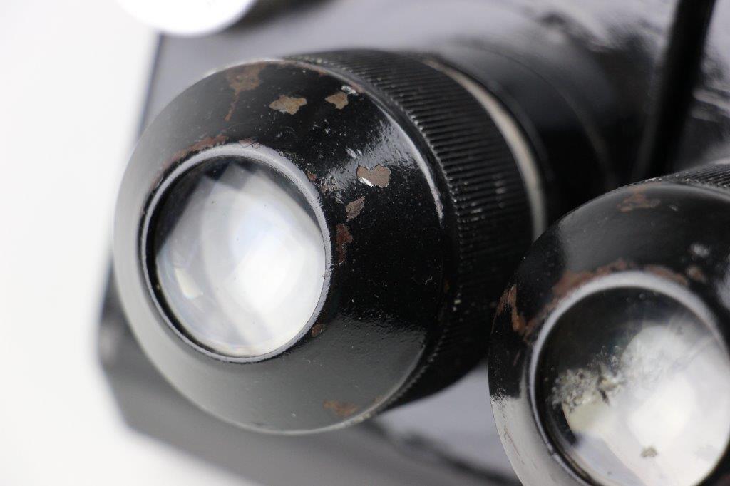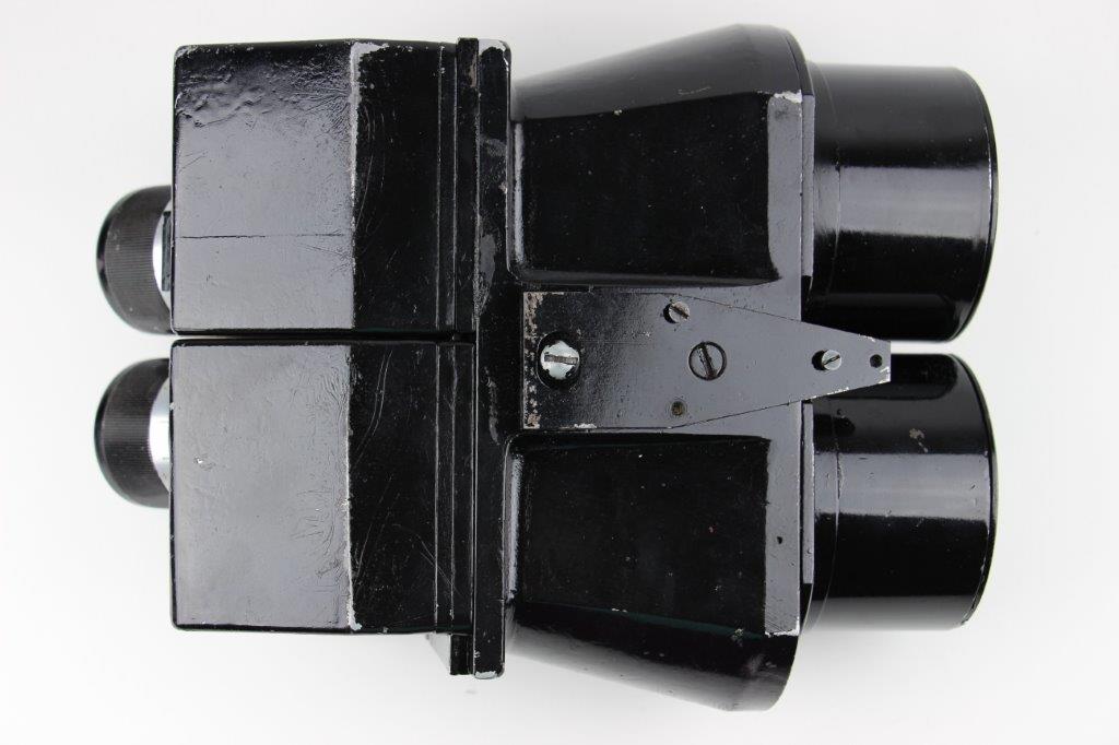 6/10/24 – This is a pair of WW2 German 10×80 Flak Binoculars. These were used by Heer Artillery and Luftwaffe Flak gunners for sighting the Flak 36 (88mm) gun. This example is maker stamped “dkl” by Josef Schneider & Co.. The exterior has a black lacquered paint finish with some high edge wear and signs of aging on the exterior, but without excessive wear or damage. The optics are in fair condition with general cloudiness and some damage to the right eye lens. Visibility remains around 75-80% with functional lens filters for clear, light, medium, and dark. The focusing adjustment on each eye works as intended, as does the eye width adjustment knob. The right side of the exterior is marked with a blue circle and white “X” next to either side of the maker code, which indicates the types of lubricants used during production (treated for cold weather use). The serial number ranges for this maker begin with 5437 up to 82036, which indicates this example as early wartime production.