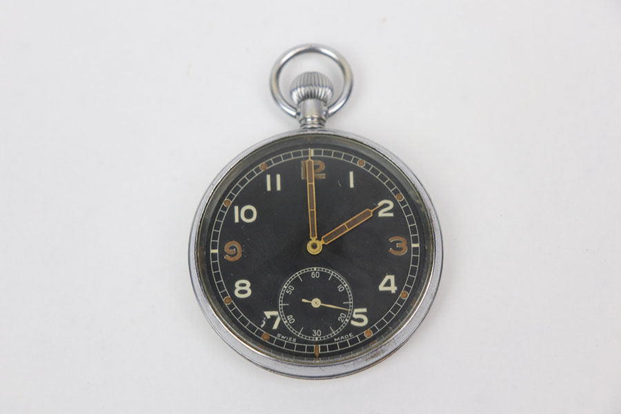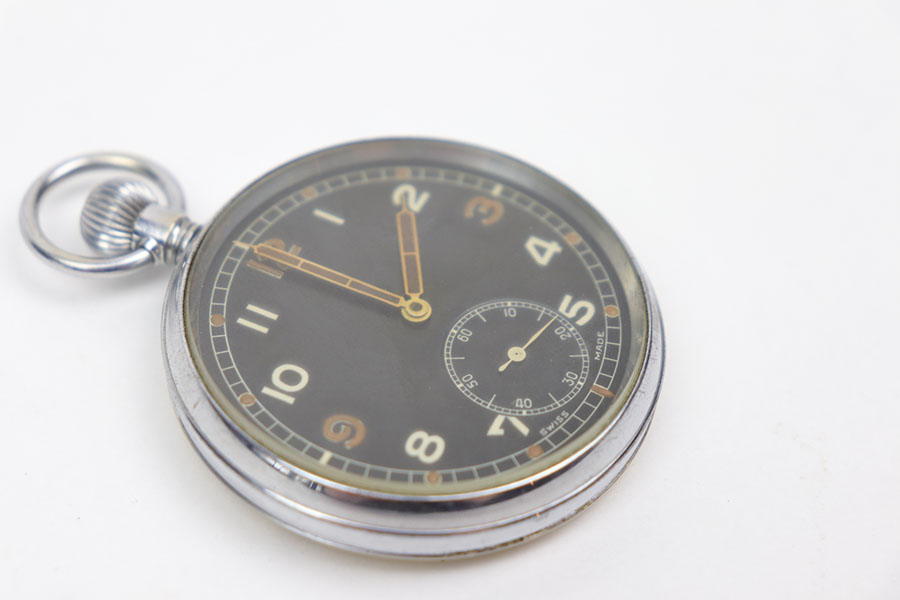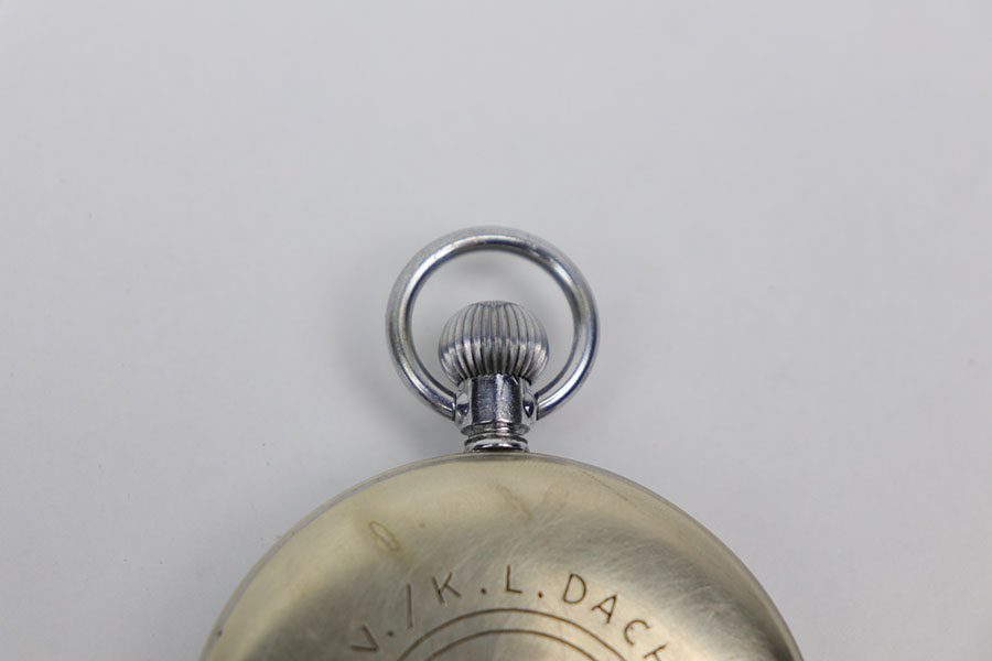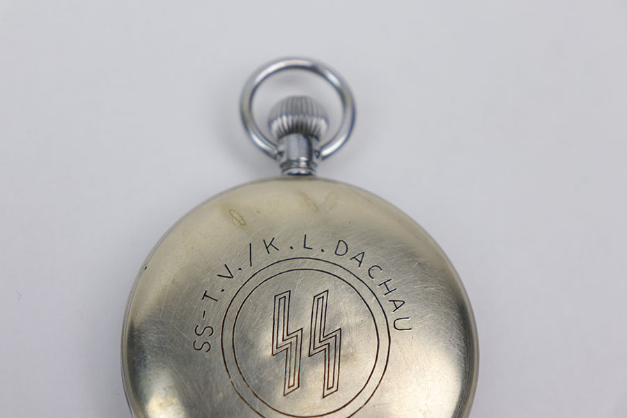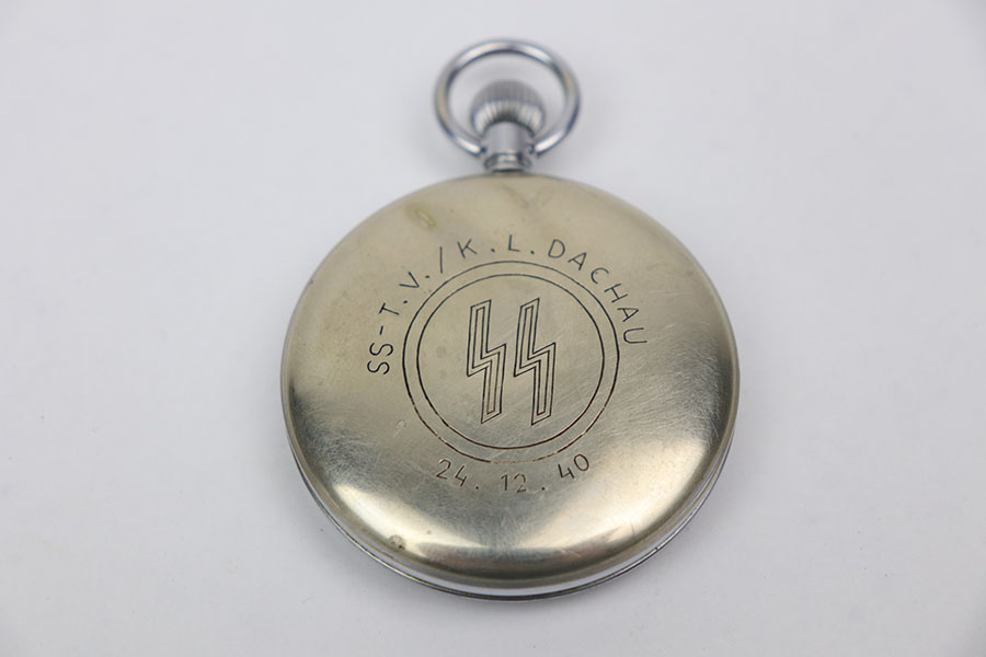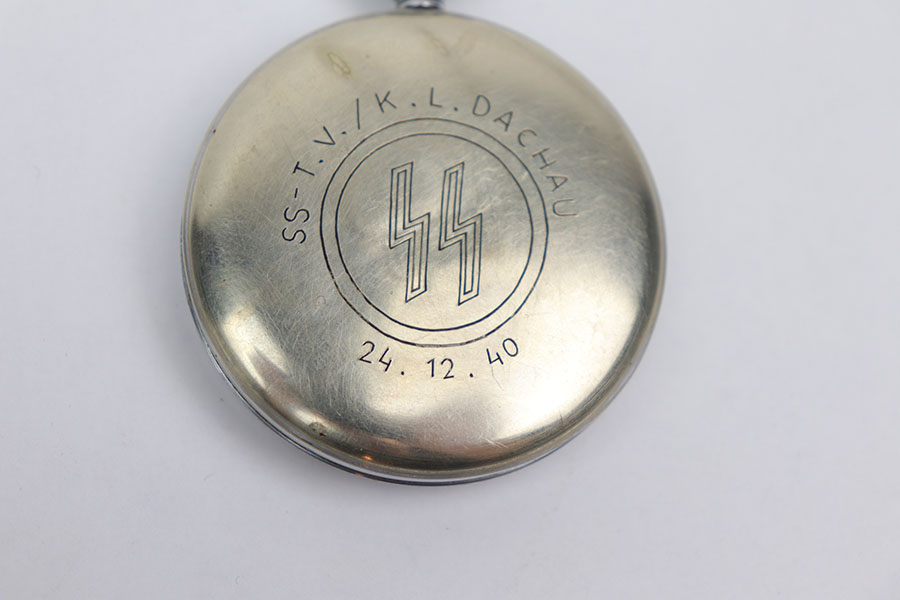 11/5/20 – This is a custom engraved pocket watch for a SS officer in Dachau. The watch has been inspected by an engraver who was able to verify this is an old engraving. The back of the watch is inscribed with SS runes along with “SS T.V. / K.L. Dachau” and a date underneath indicating Christmas Eve, 1940. This was likely given as a Christmas present. The watch is aesthetically in great condition, but unfortunately it does not wind or work. Could likely have a jeweler repair if desired.