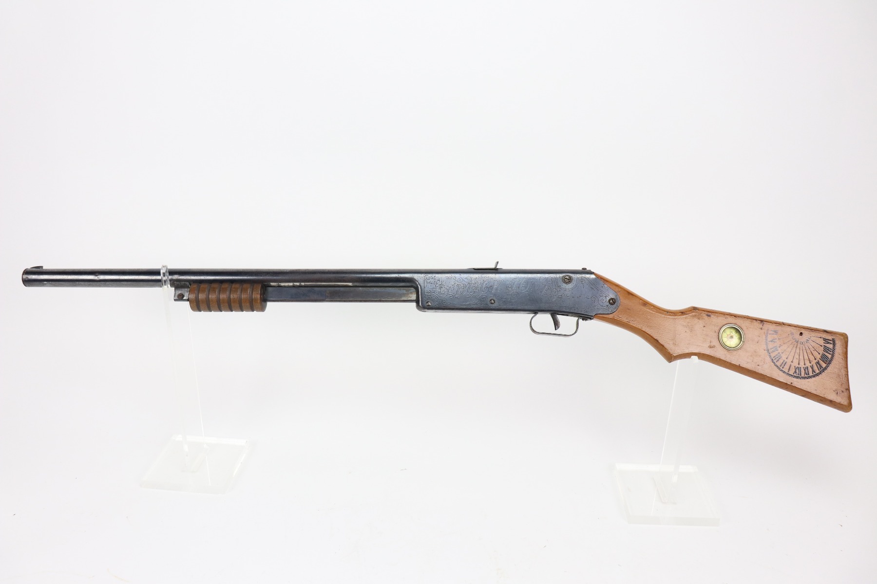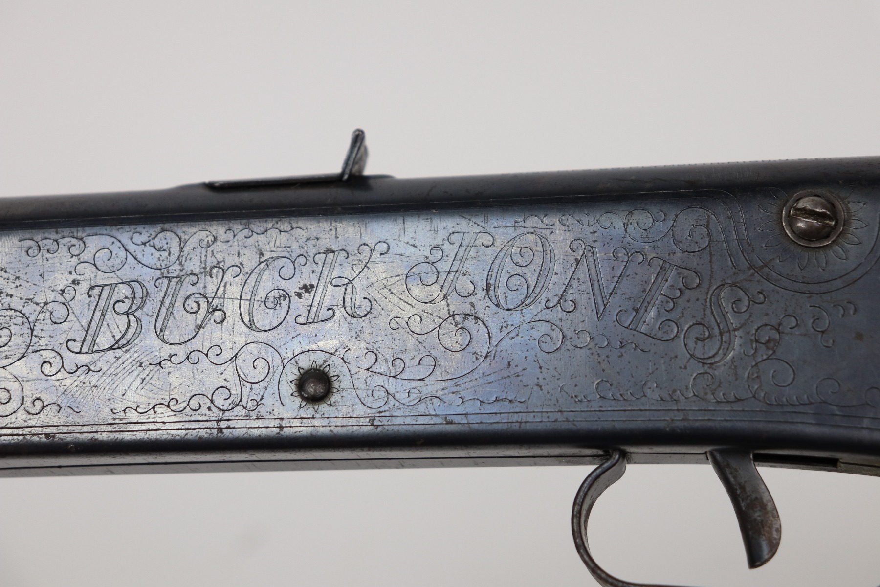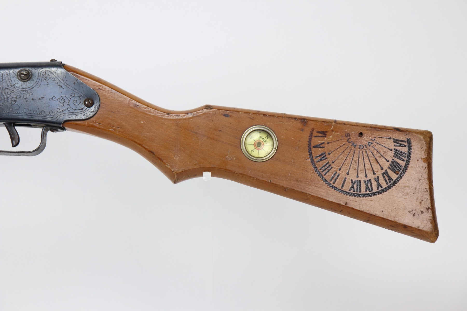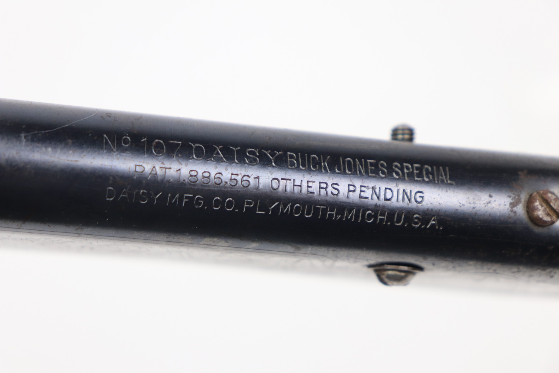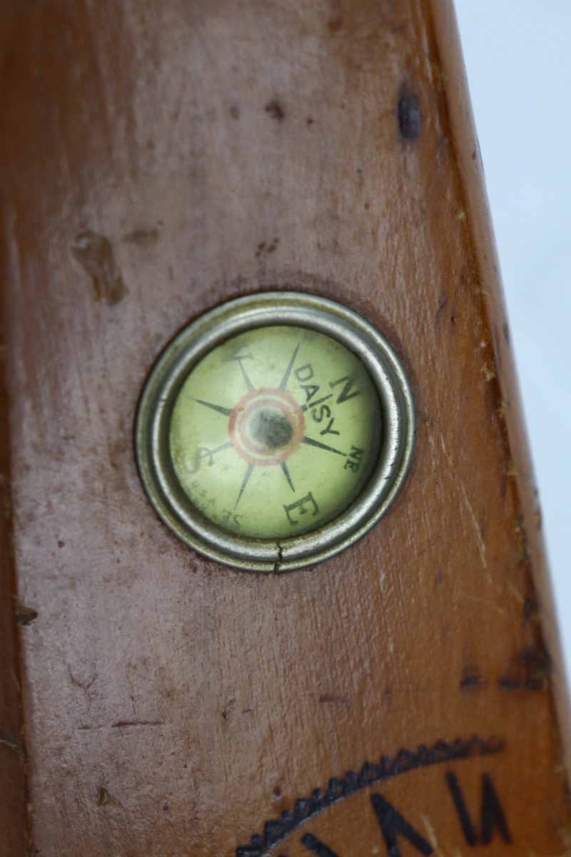 3/25/21 – This is a nice example of a vintage Daisy BB Gun. This one is a Buck Jones special, so it has Buck Jones engraving with a floral pattern on the sides of the receiver. We believe it was made in the 1934. It has retained most of its original finish, but there are light surface scratches and spotty freckling throughout. Fully functional. The stock has a working compass in it. The stock is nice with minor dings and scratches.