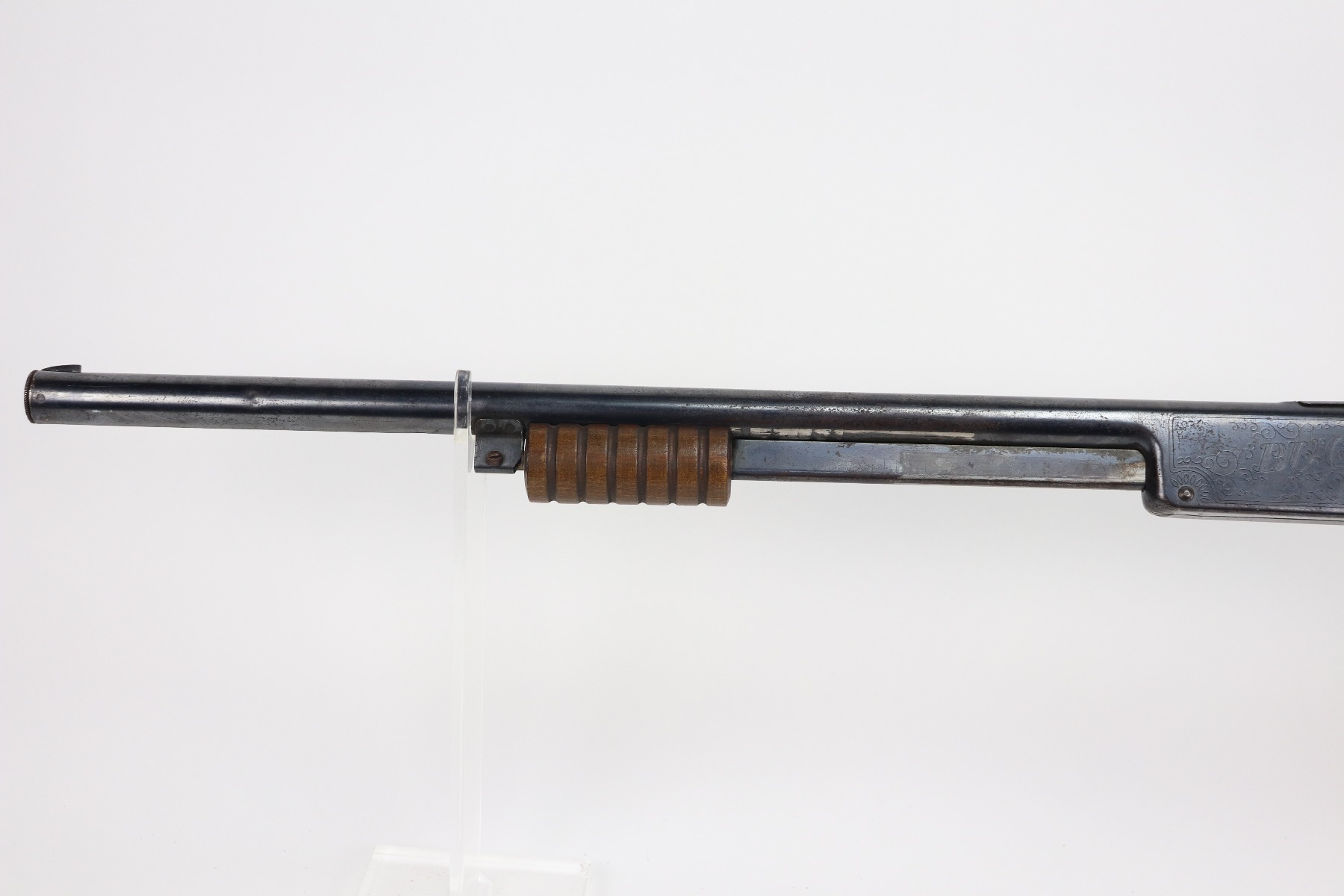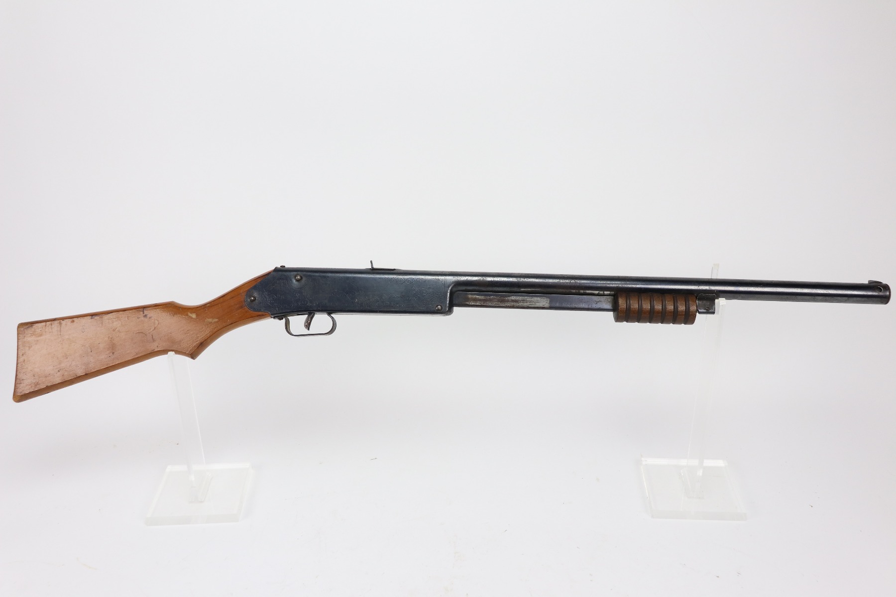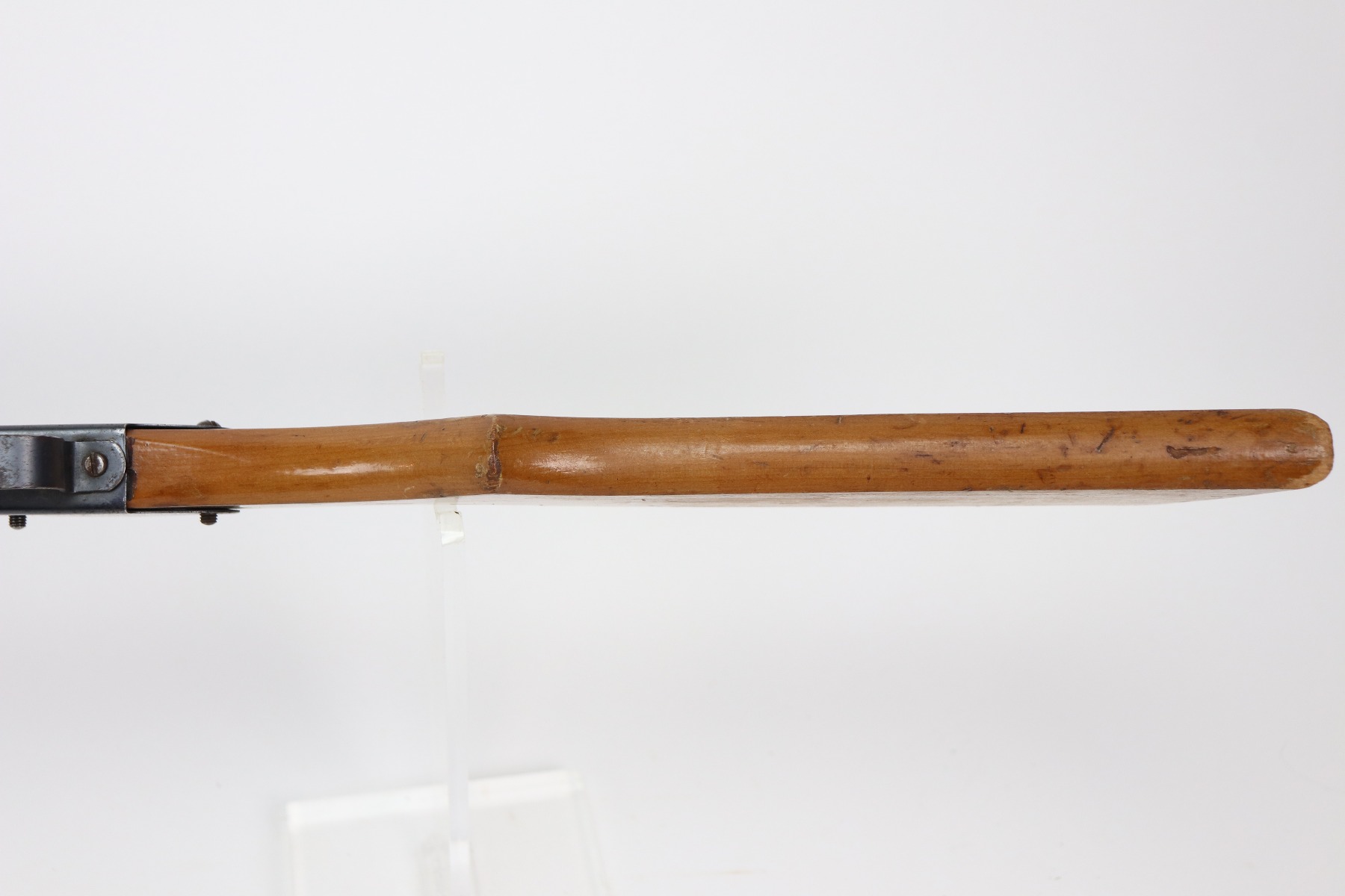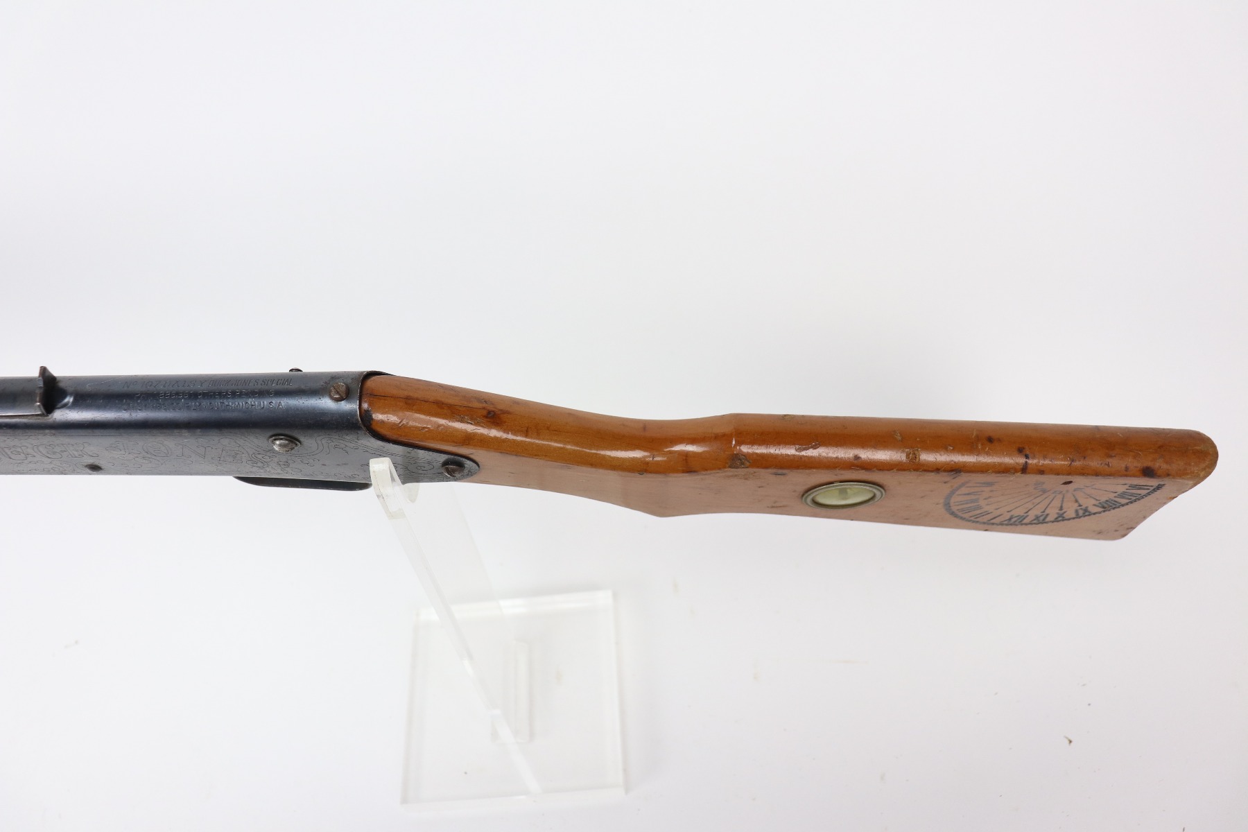 3/25/21 – This is a nice example of a vintage Daisy BB Gun. This one is a Buck Jones special, so it has Buck Jones engraving with a floral pattern on the sides of the receiver. We believe it was made in the 1934. It has retained most of its original finish, but there are light surface scratches and spotty freckling throughout. Fully functional. The stock has a working compass in it. The stock is nice with minor dings and scratches.