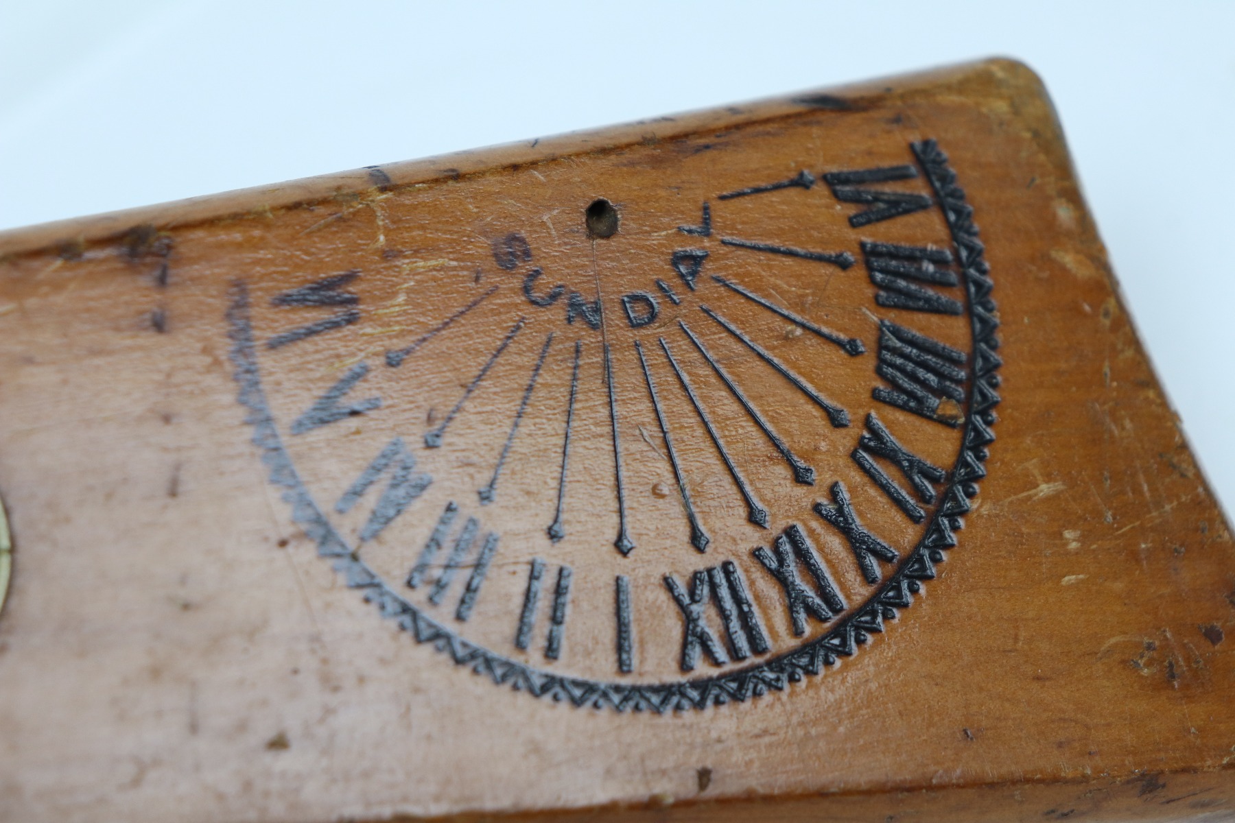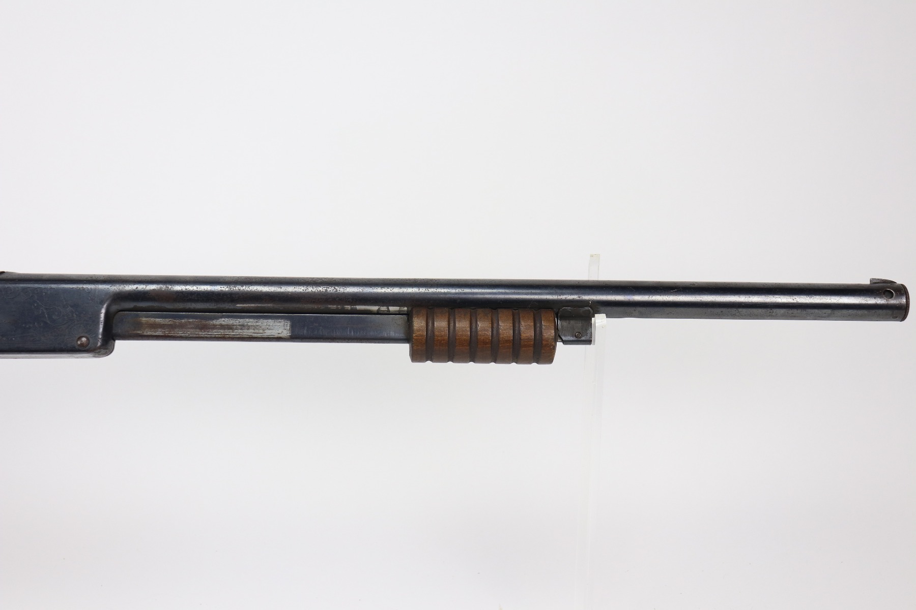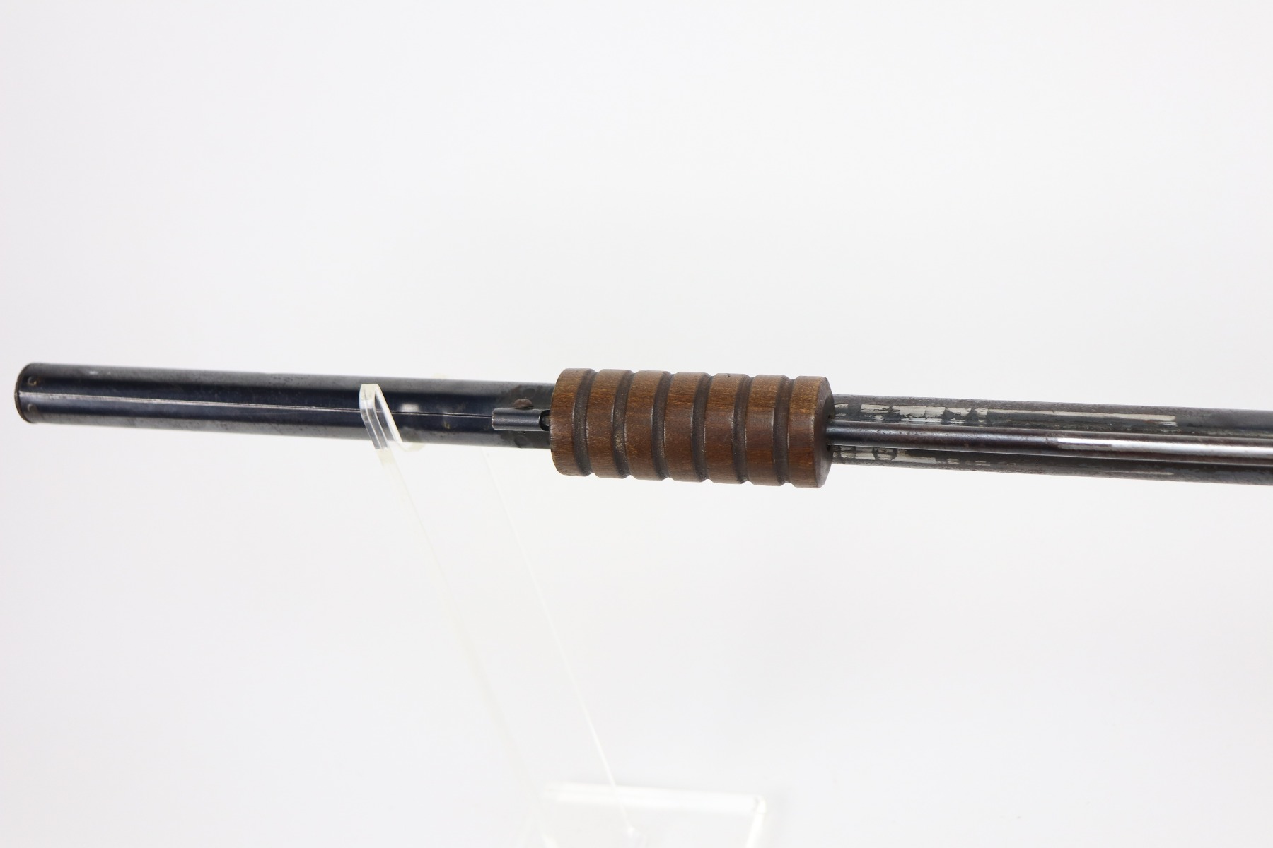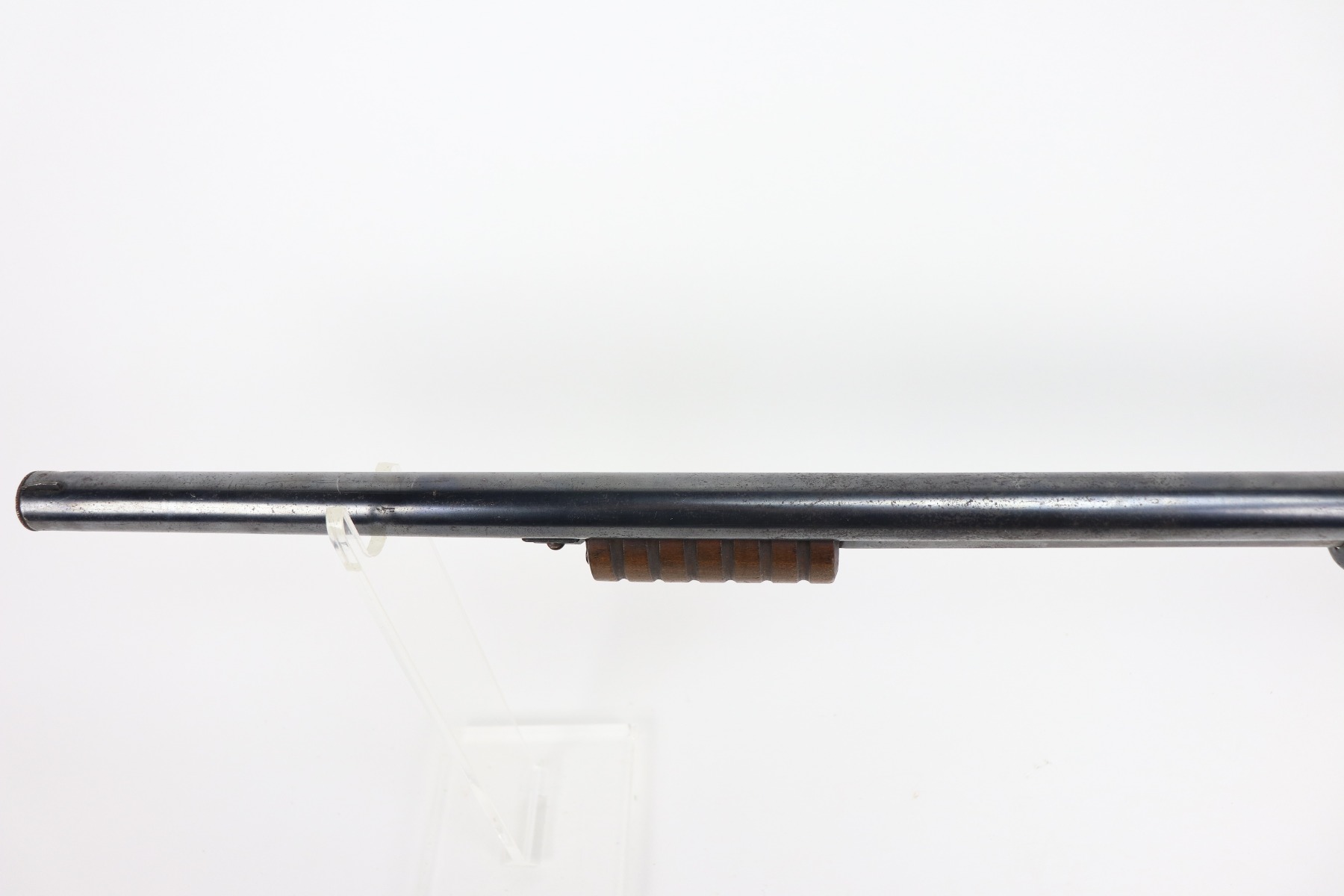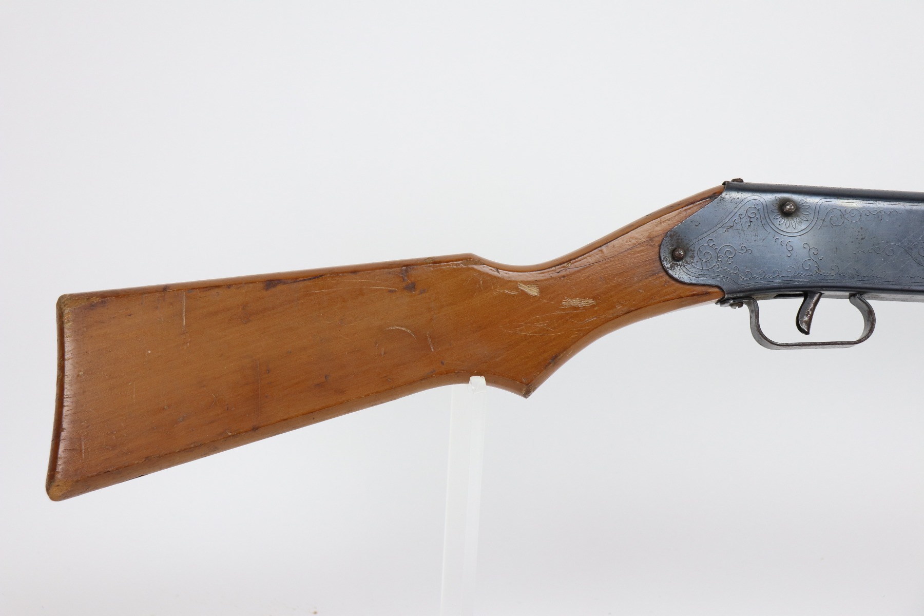 3/25/21 – This is a nice example of a vintage Daisy BB Gun. This one is a Buck Jones special, so it has Buck Jones engraving with a floral pattern on the sides of the receiver. We believe it was made in the 1934. It has retained most of its original finish, but there are light surface scratches and spotty freckling throughout. Fully functional. The stock has a working compass in it. The stock is nice with minor dings and scratches.