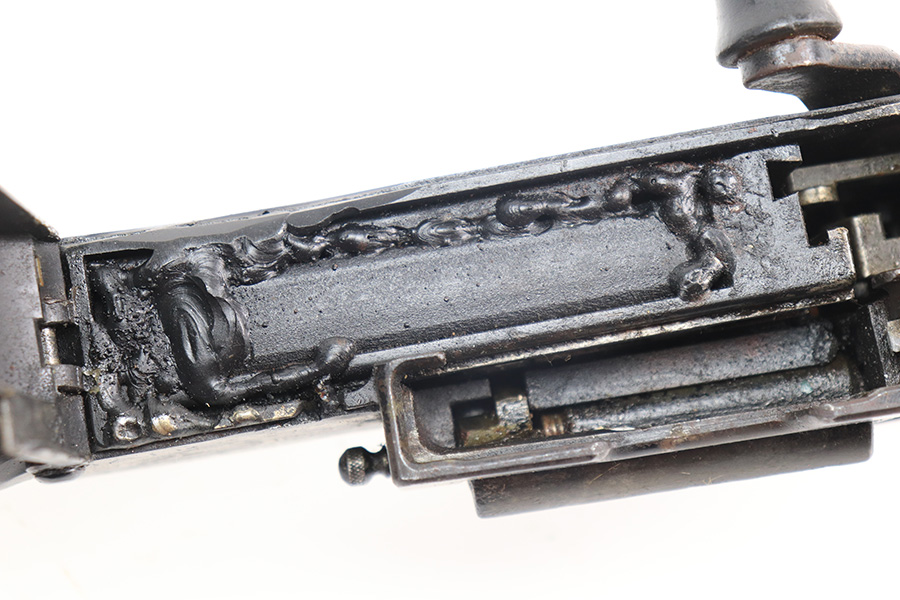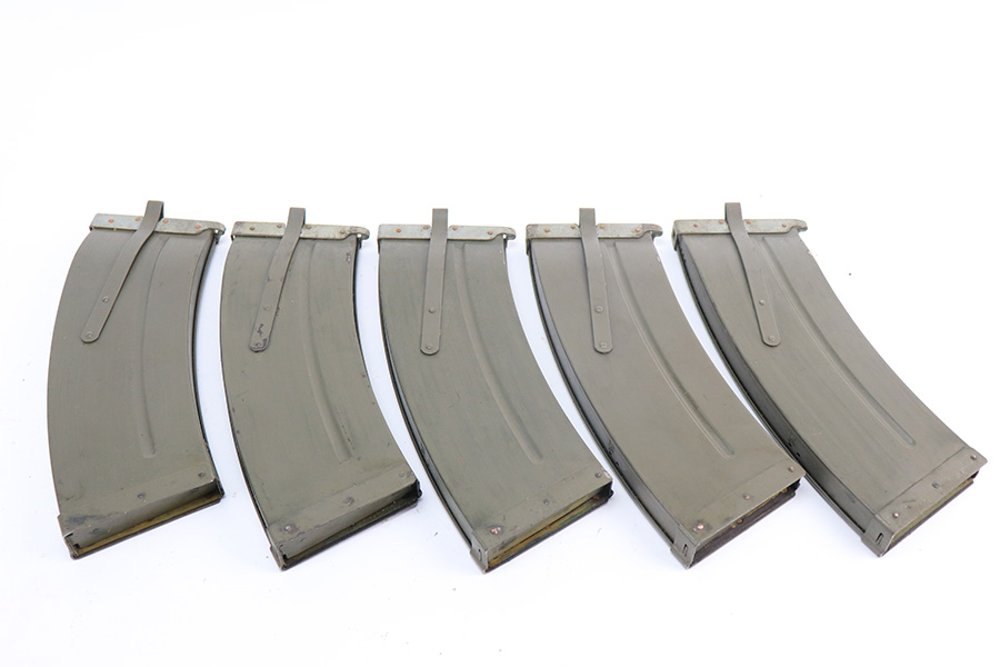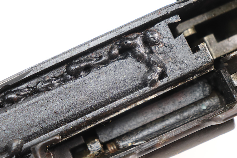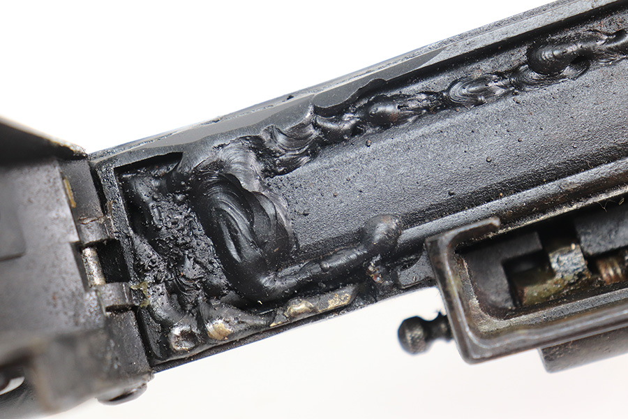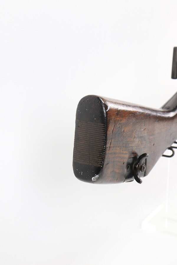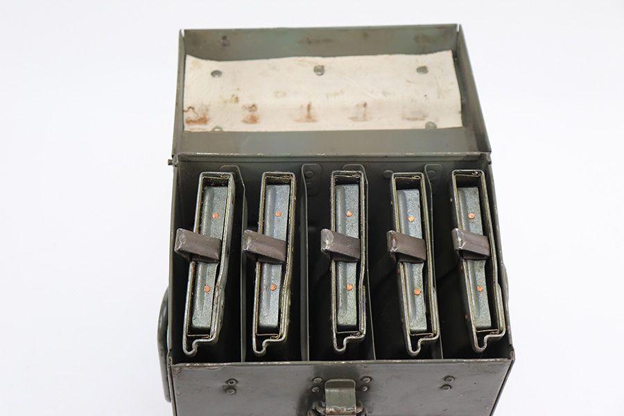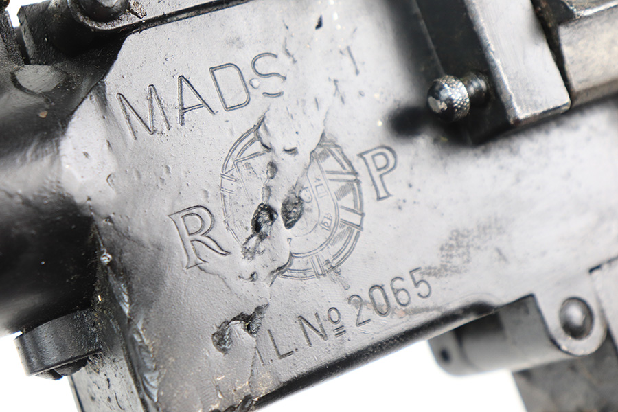 12/17/21 – This is a nice example of a very cool Madsen LMG. The receiver on this one has been blocked and permanently welded. Therefore, it is not a functioning firearm and cannot be converted to be a functioning firearm. However, the charging handle works, the magazine comes in and out, and the trigger works. There is an obvious weld mark on the left side of the outer receiver. The gun comes with an original magazine case and 5 original magazines. Very cool display piece! The Madsen is a light machine gun that Julius A. Rasmussen and Theodor Schouboe designed and proposed for adoption by Colonel Vilhelm Herman Oluf Madsen, the Danish Minister of War, and that the Royal Danish Army adopted in 1902. It was the world’s first true light machine gun produced in quantity and Madsen was able to sell it in 12 calibres to over 34 countries. The gun saw extensive combat usage for over 100 years, with continued use in limited quantities worldwide into the 2010s.[3][4] The Madsen was produced by Compagnie Madsen A/S. There is a piece of twine shown in the photos that was just being used to hold the bipod legs together.
