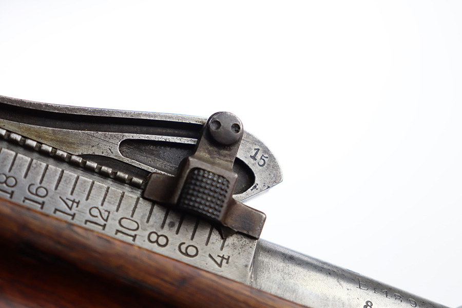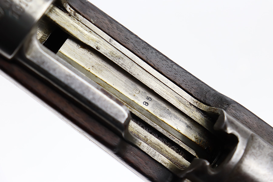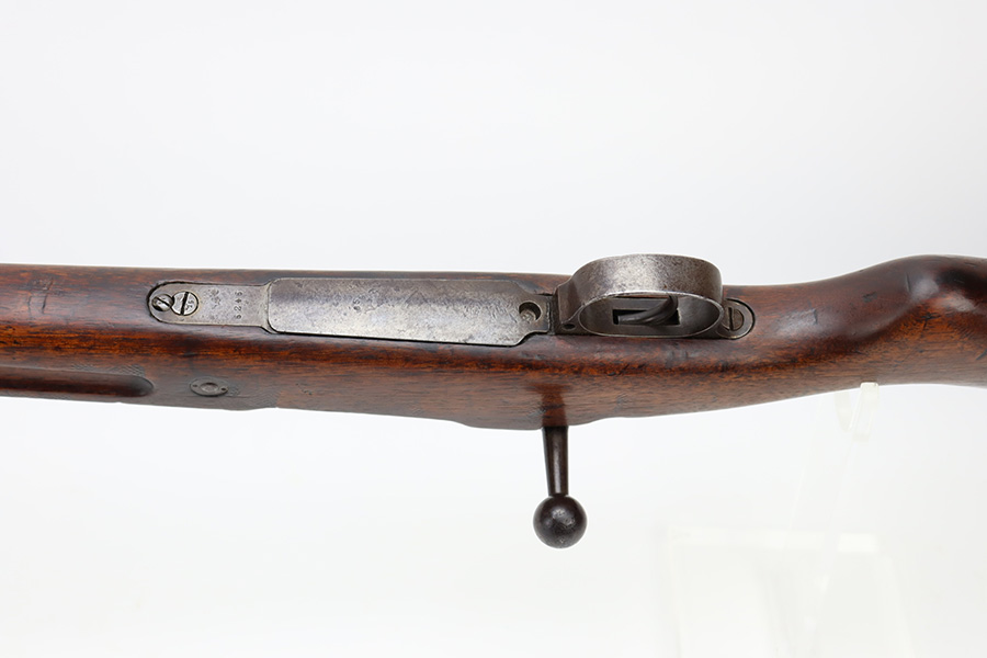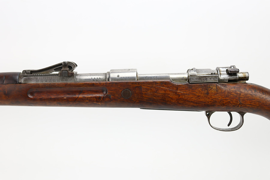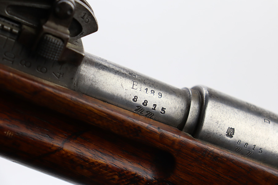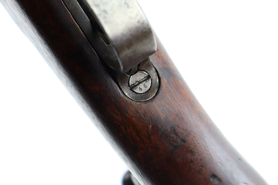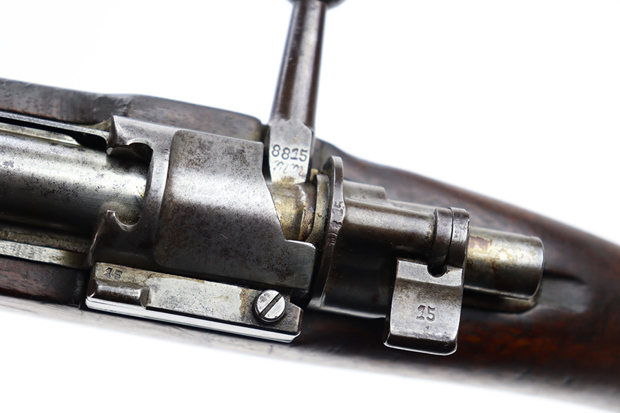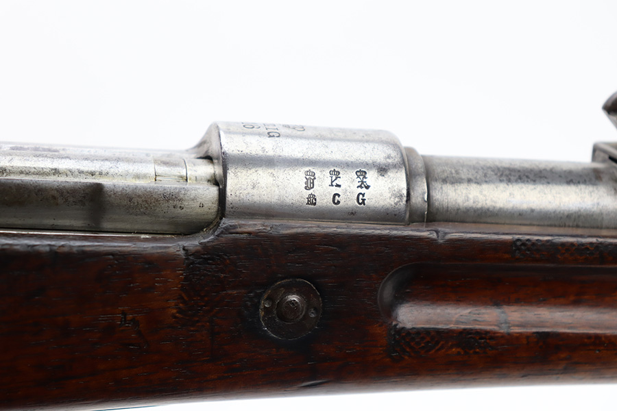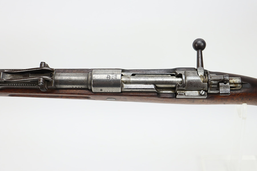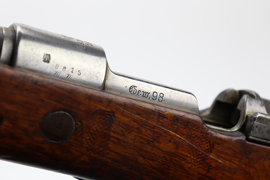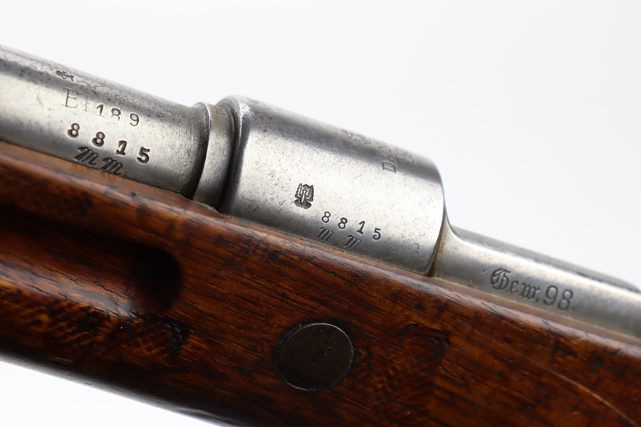 12/4/23 – This is a great example of a Gewehr 98 made by the Danzig Arsenal in 1917. The rifle retains the majority of its original finish. The receiver is in the white but has some prickling of corrosion throughout. Many of the parts still retain some of its original bluing but the majority of the rifle has patina on it. The stock is in good shape without any damage to note. There are some handling marks throughout the stock which can be seen in the photos. The stock has been lightly sanded but the cartouches are still sharp. The rifle has matching serials throughout except for the magazine follower and the rear trigger guard screw. The bore is fairly dark with a hint of brightness when shining a line and the rifling is sharp.