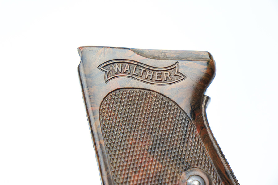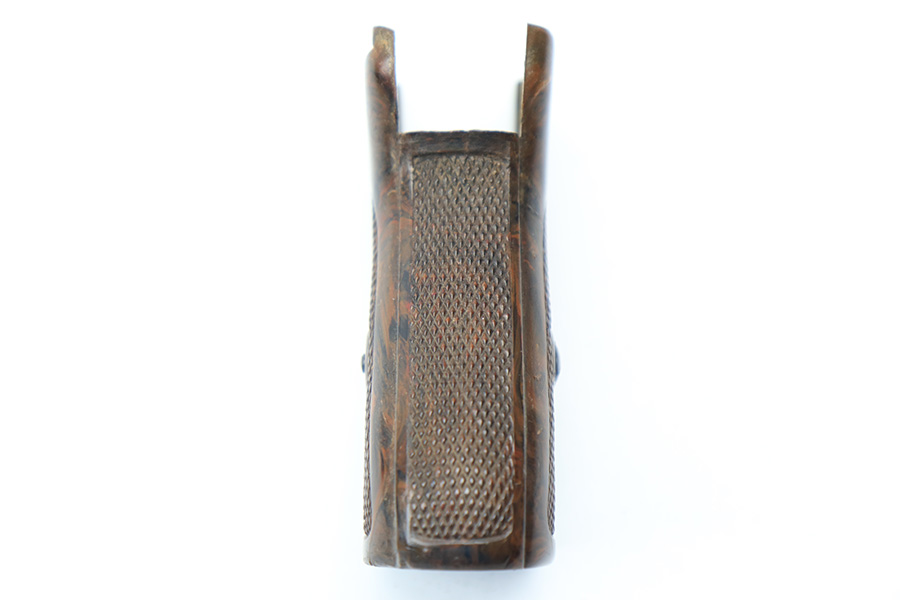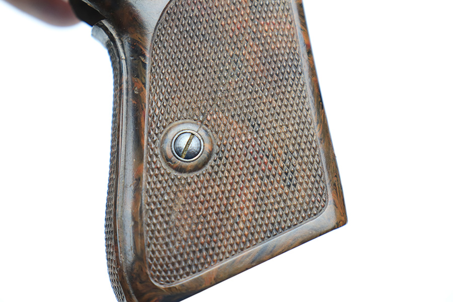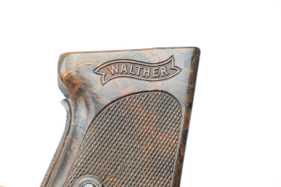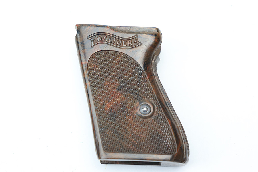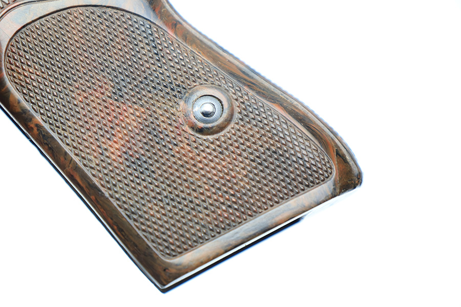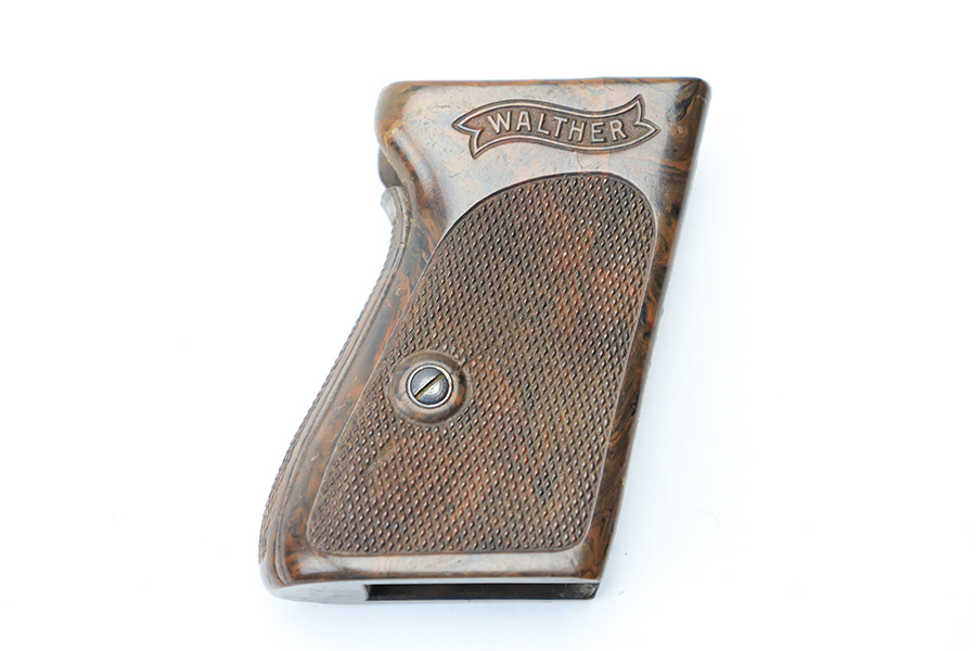3/25/22 – This is an original WW2 production Walther PPK grip. The dark brown bakelite signifies a wartime production example. The grip is excellent, except for a small hairline crack on the spine of the grip. This is very minor and almost not-noticeable. Comes with an original screw. Minimal warping.