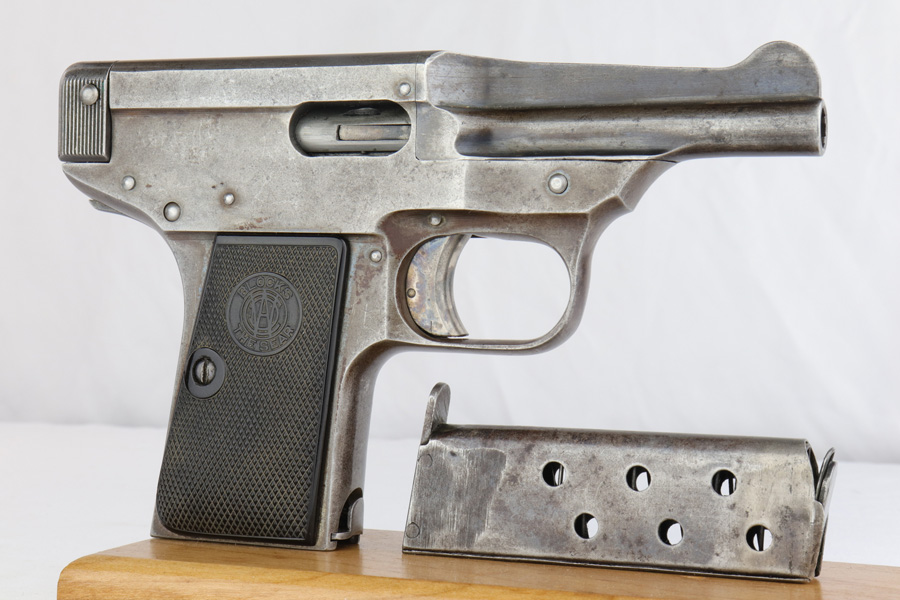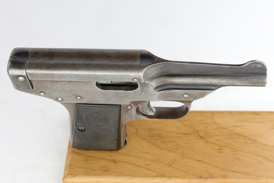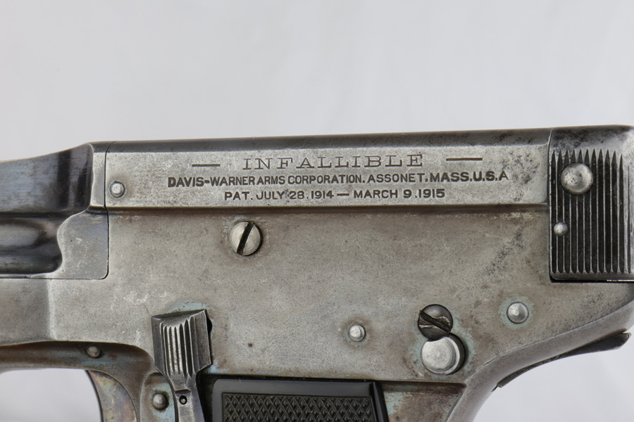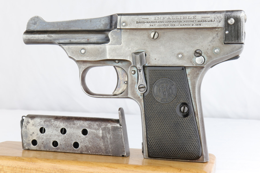 3/29/19 – This is an original Davis-Warner Infallible pistol. These were made between 1917 and 1919, and only 7000 were produced. The pistol has most of the original finish missing, but is fully functional with a smooth action. The grips are in great condition as well. The bore is about 5/10 with patina and light pitting throughout. A very interesting pistol made for only a short period.
