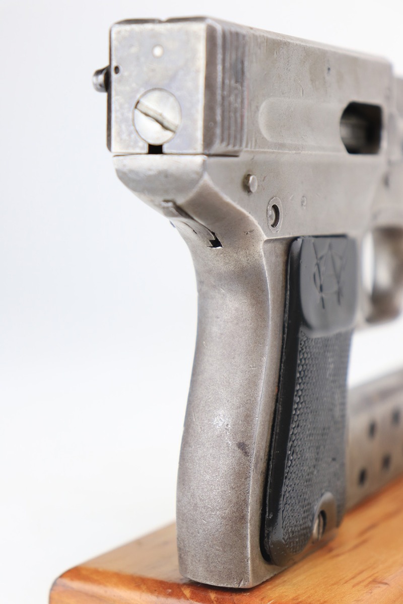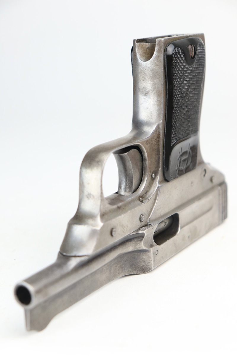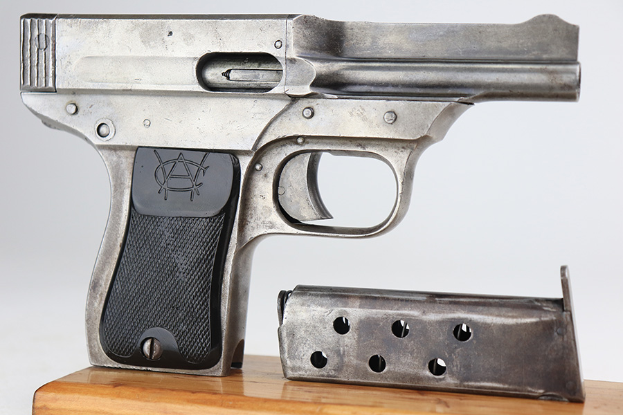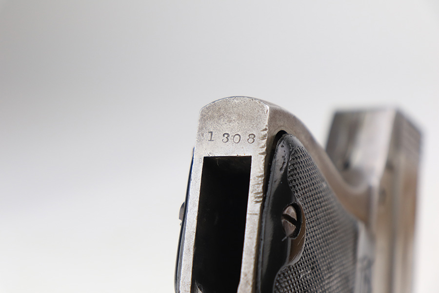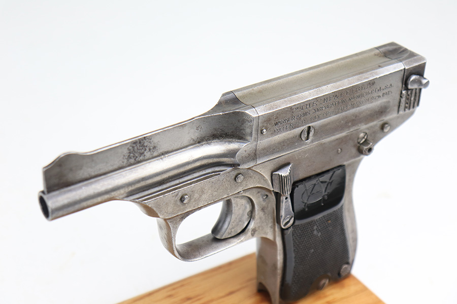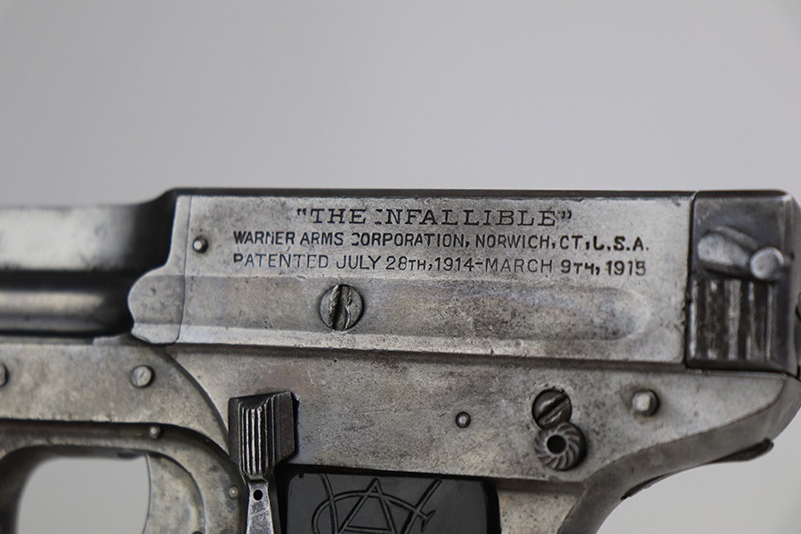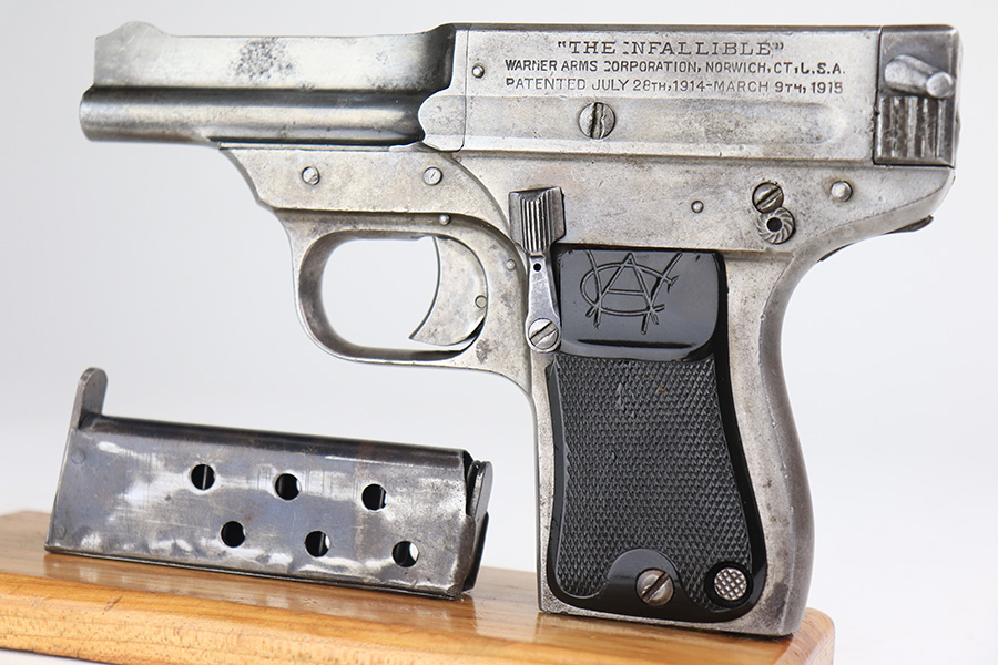 3/24/22 – This is an original Davis-Warner Infallible pistol. These were made between 1917 and 1919, and only 7,000 were produced. The pistol has lost virtually all of its original finish, but is fully functional with a smooth action. There are tiny dings here and there and an area of oxidation and minor pitting on the left side of the barrel. Comes with a set of period-correct grips and one proper magazine. The bore has strong rifling, but there is a very slight bulge about halfway down.