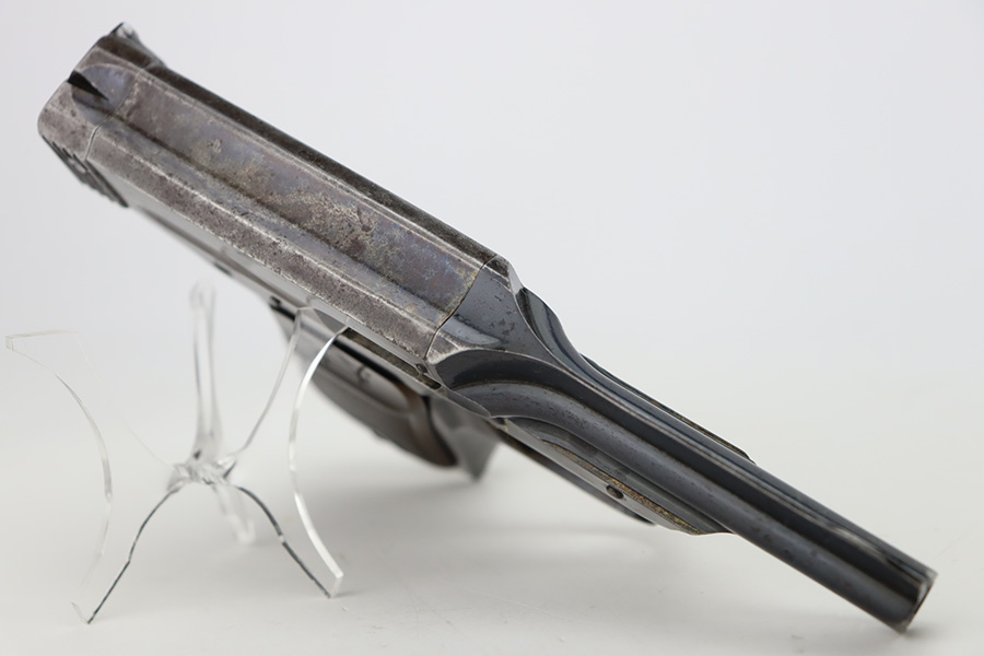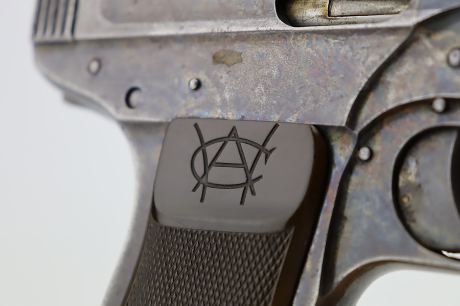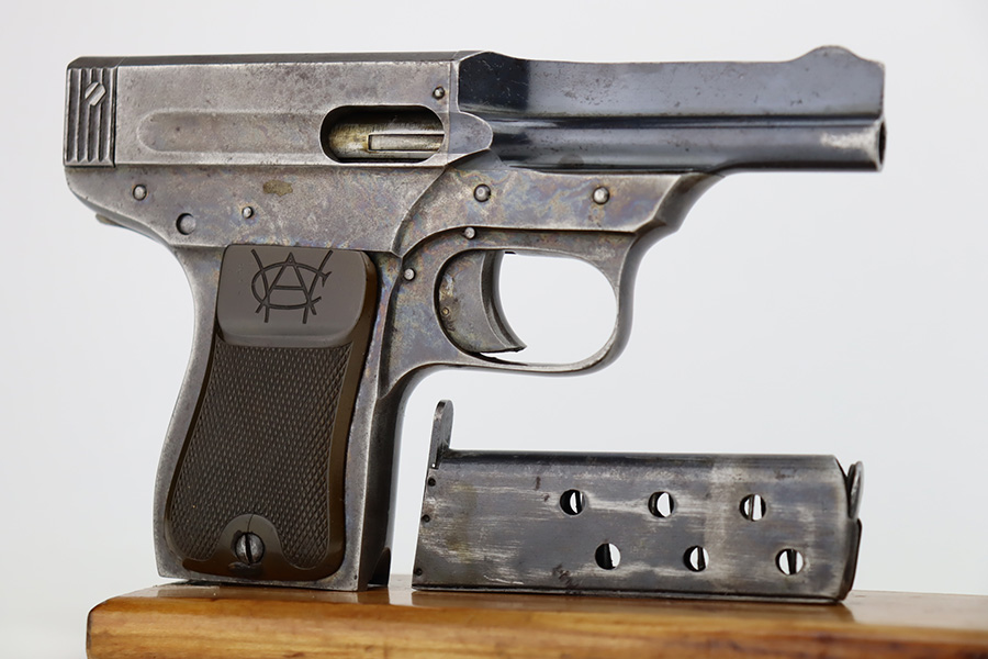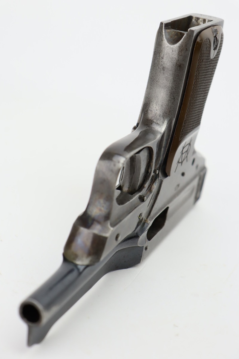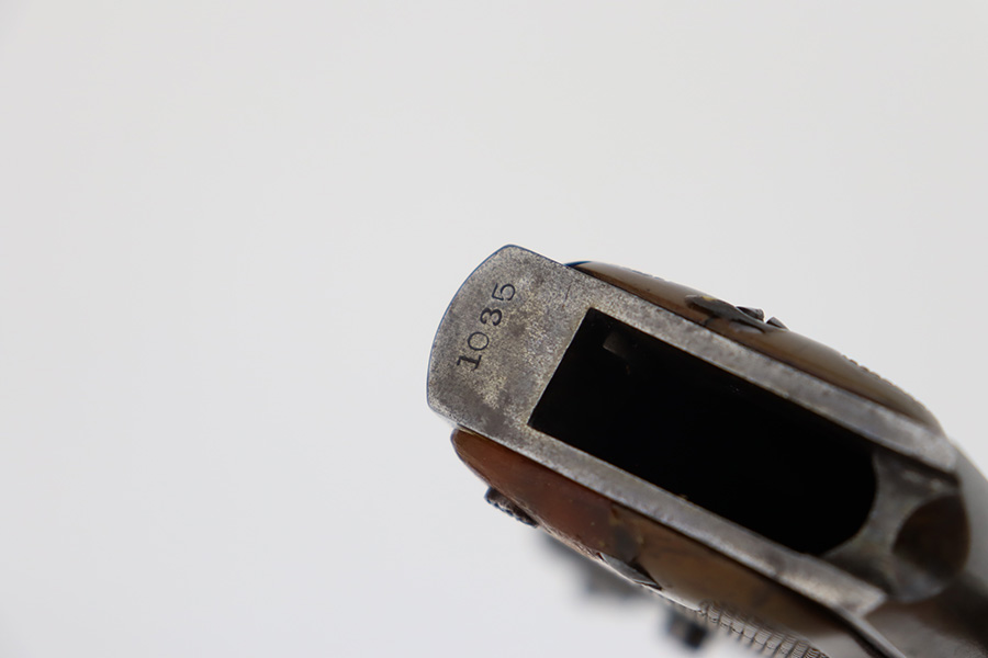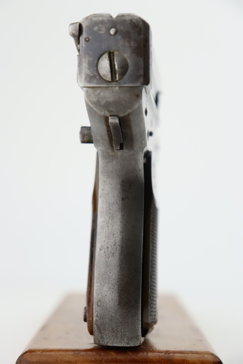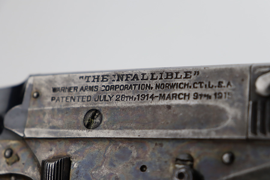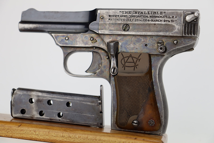 12/12/23 – This is a nice example of a Davis-Warner Infallible pistol. These were made between 1917 and 1919, and only 7,000 were produced. This one has a case-hardened frame and has retained roughly 75-80% of its finish. The majority of the finish loss is on the grip straps and at the back right of the frame. Some muzzle wear with spotty oxidation here and there. The left grip panel has a repaired chip. Comes with one proper magazine. The bore has good rifling with very light pin-pricking throughout.