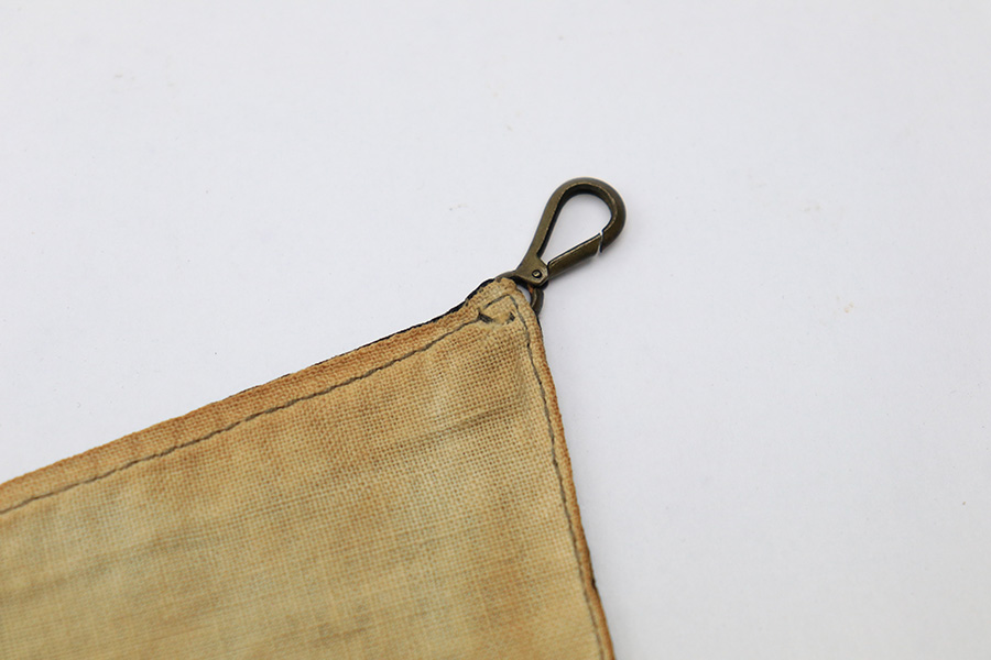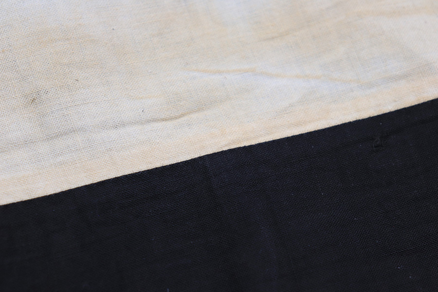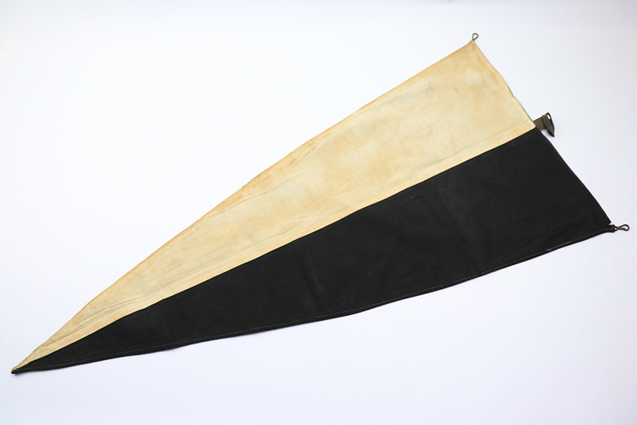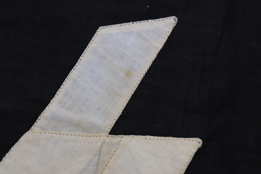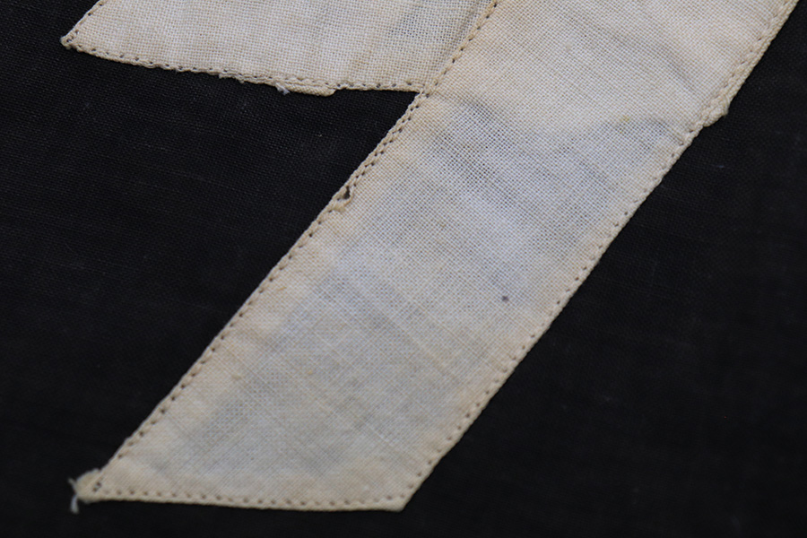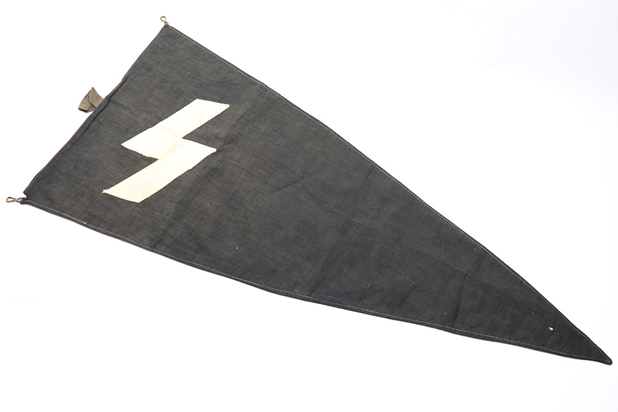 5/10/22 – This is an original Deutsches Jungvolk Troop Pennant Flag. The Deutsches Jungvolk was “junior Hitler Youth” for ages 10-14. The pennant is about 27.5 inches in length and has a sewn-on three piece runic “S” insignia on one side. The reverse is white and black as shown. The flag is in great condition with some mild yellowing on the white areas, but this is a normal sign of aging. No stitching issues. The corners still have the original attachment clips, as shown.