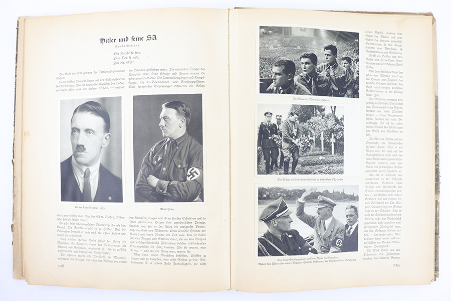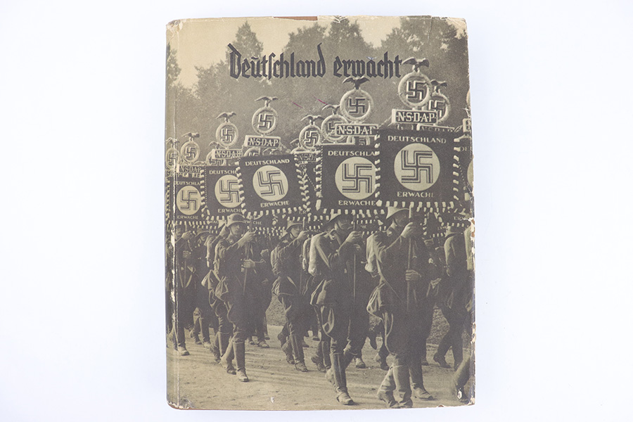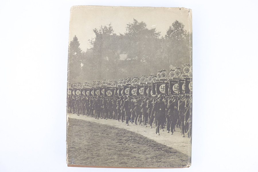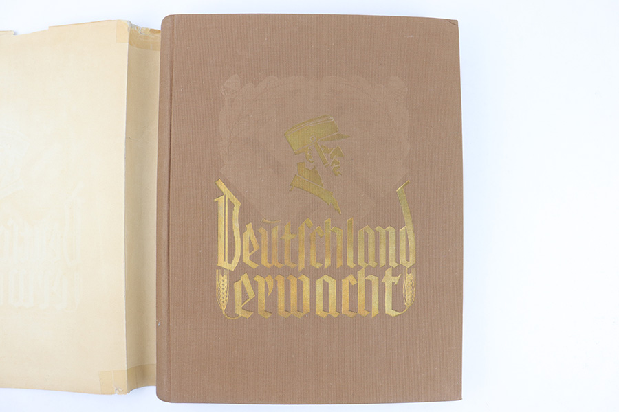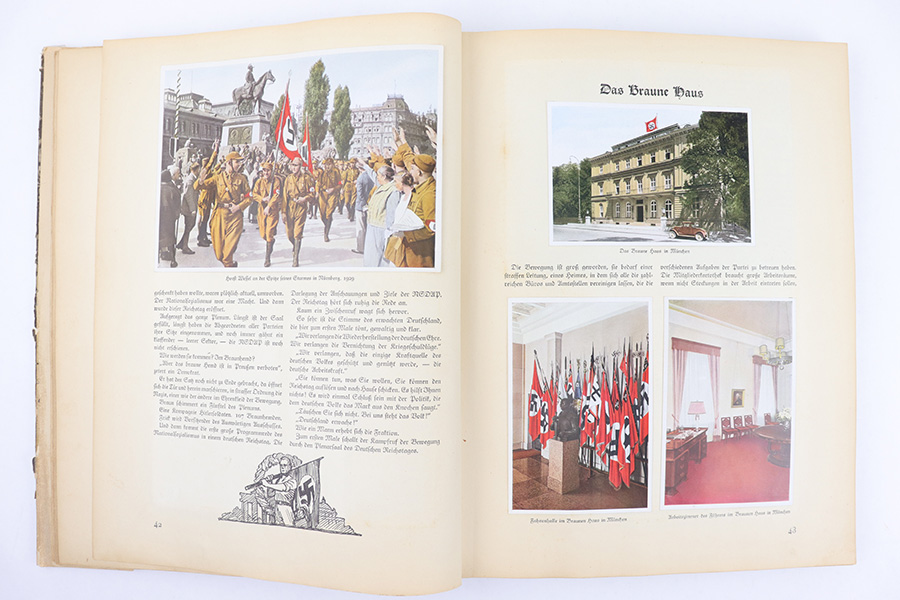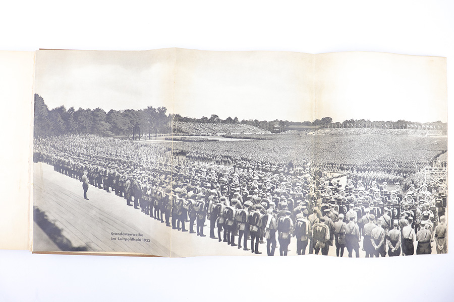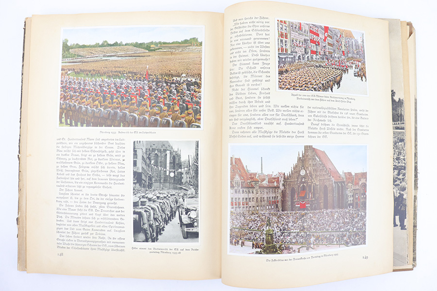 3/22/23 – This is a rare example of “Deutschland erwacht” (Germany awakes) hardcover scrapbook from 1933. The book is complete, meaning all the potential added images are attached and glued to their respective pages. Our understanding is this book was sold with the images separately, so readers could add the images as they went along as a sort of interactive learning. This example also features a nice hardcover with paper sleeve, and a large fold-out image of gathered troops in Luitpoldhain, 1933. The fold-out is 6 pages long, and completely intact! There are 150+ pages total, and all pages are intact with some yellowing from age. No rips or tears, but a few pages are delicate and have some mild yellow stains. The added images are all excellent, with some in color but most are black-and-white. A very cool piece of early WW2 German history.