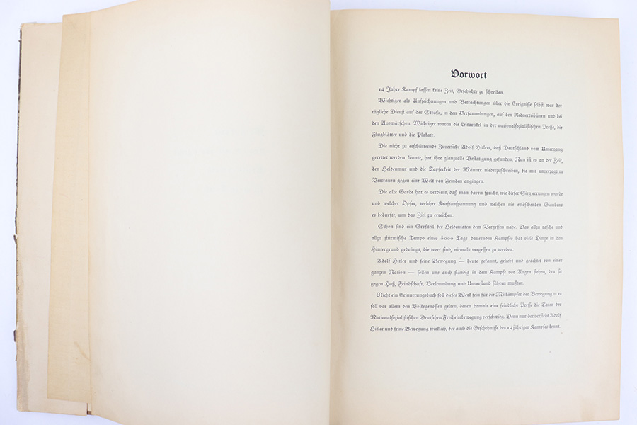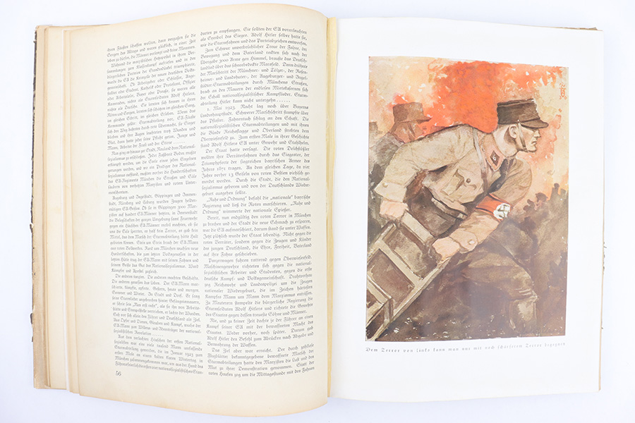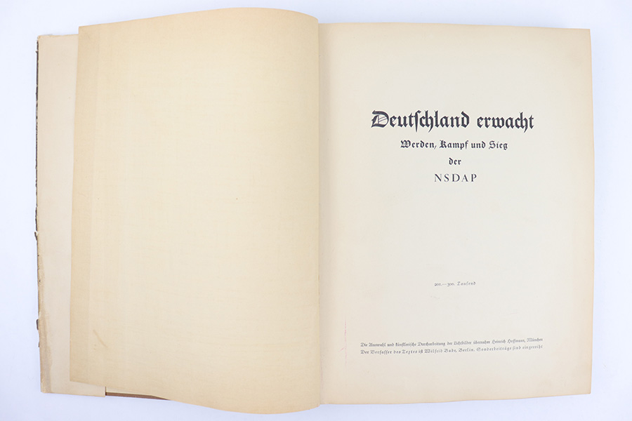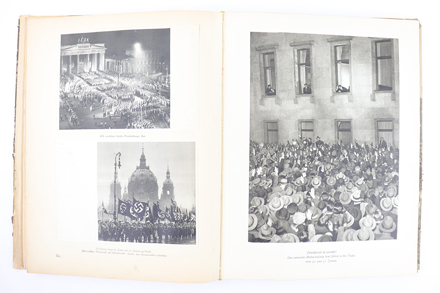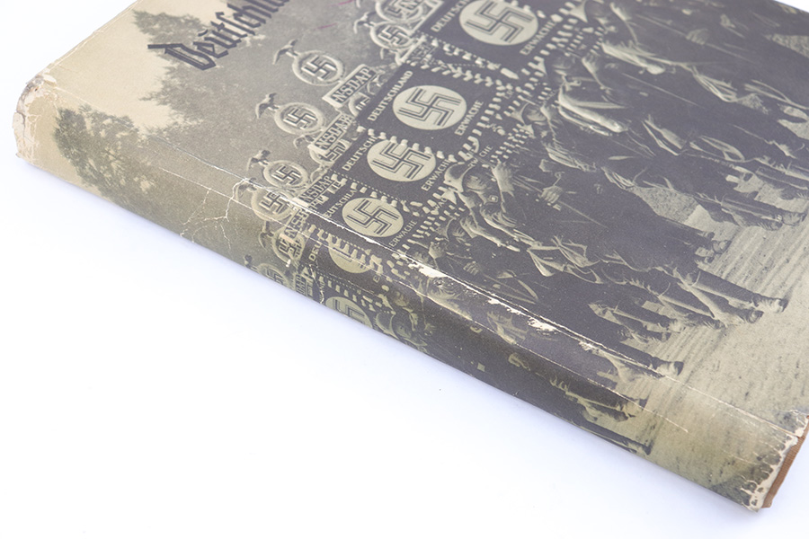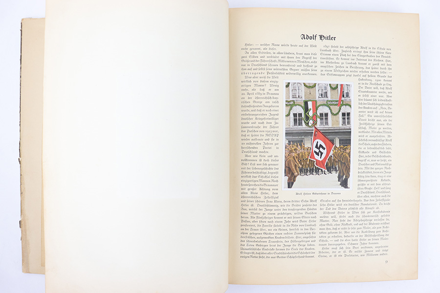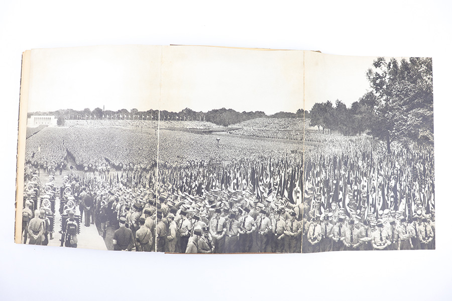 3/22/23 – This is a rare example of “Deutschland erwacht” (Germany awakes) hardcover scrapbook from 1933. The book is complete, meaning all the potential added images are attached and glued to their respective pages. Our understanding is this book was sold with the images separately, so readers could add the images as they went along as a sort of interactive learning. This example also features a nice hardcover with paper sleeve, and a large fold-out image of gathered troops in Luitpoldhain, 1933. The fold-out is 6 pages long, and completely intact! There are 150+ pages total, and all pages are intact with some yellowing from age. No rips or tears, but a few pages are delicate and have some mild yellow stains. The added images are all excellent, with some in color but most are black-and-white. A very cool piece of early WW2 German history.