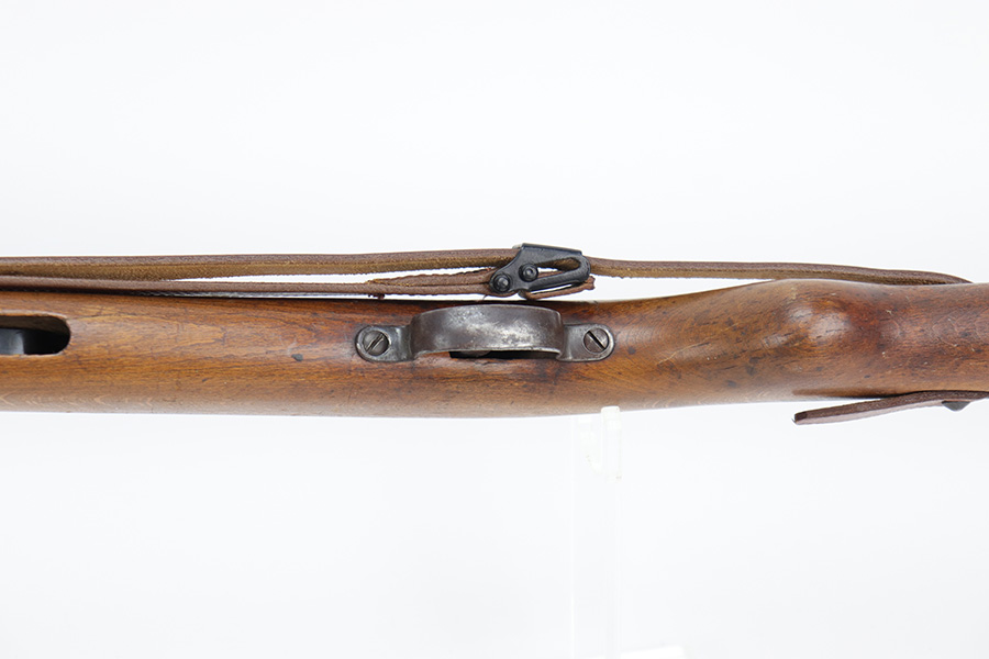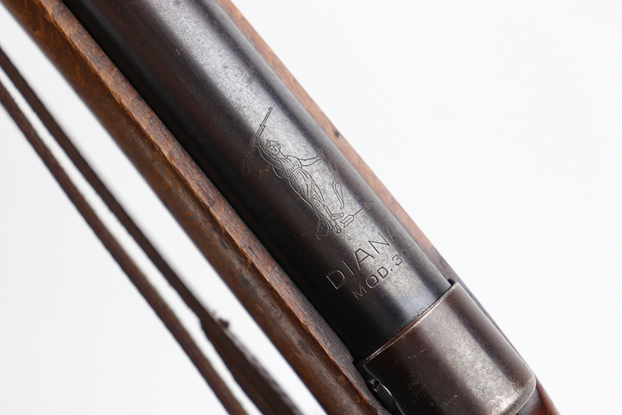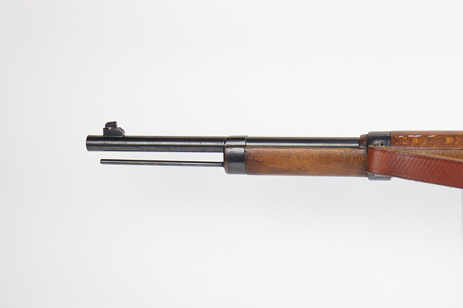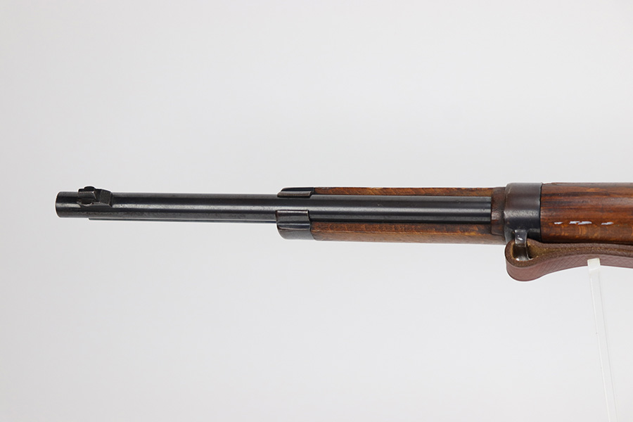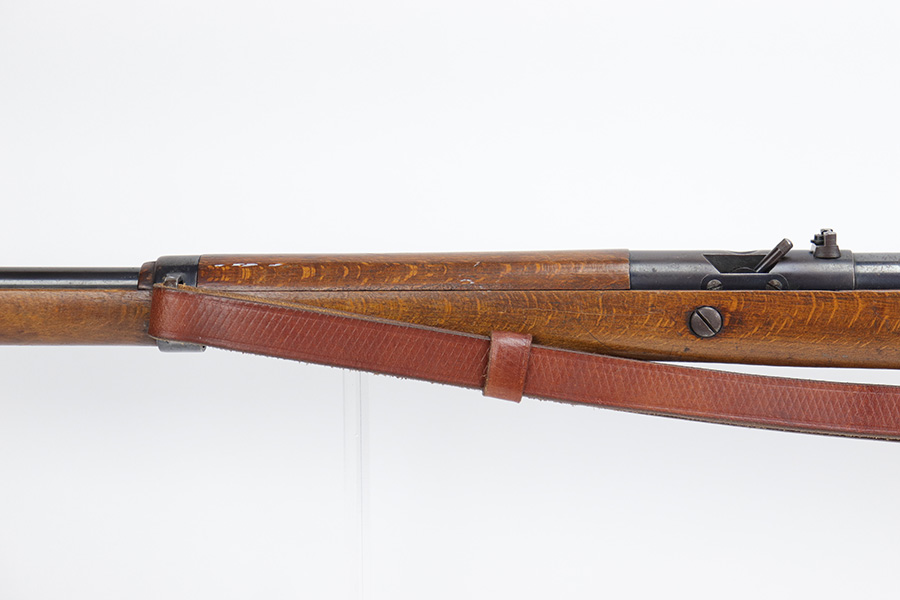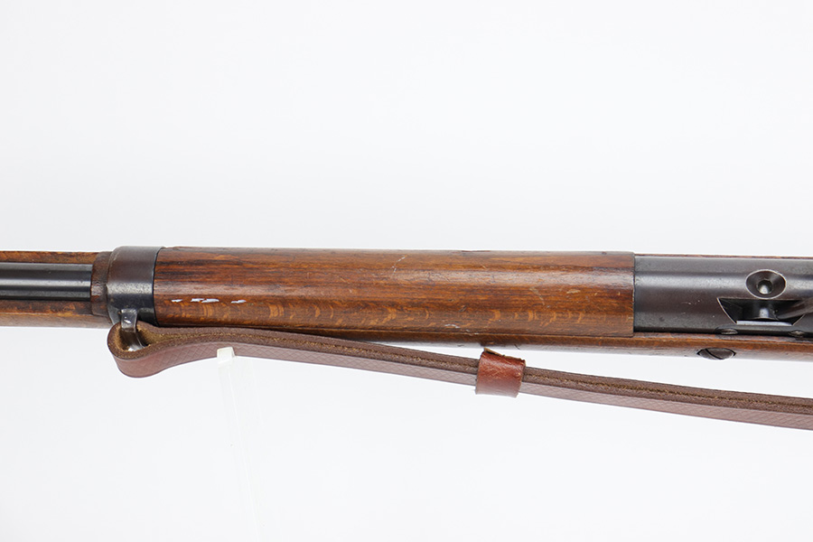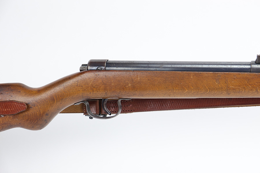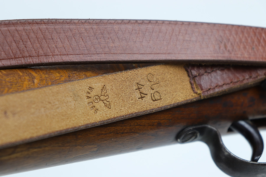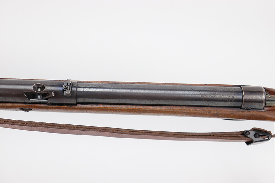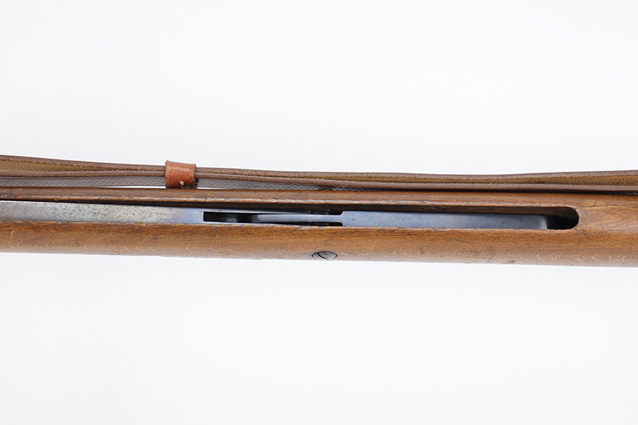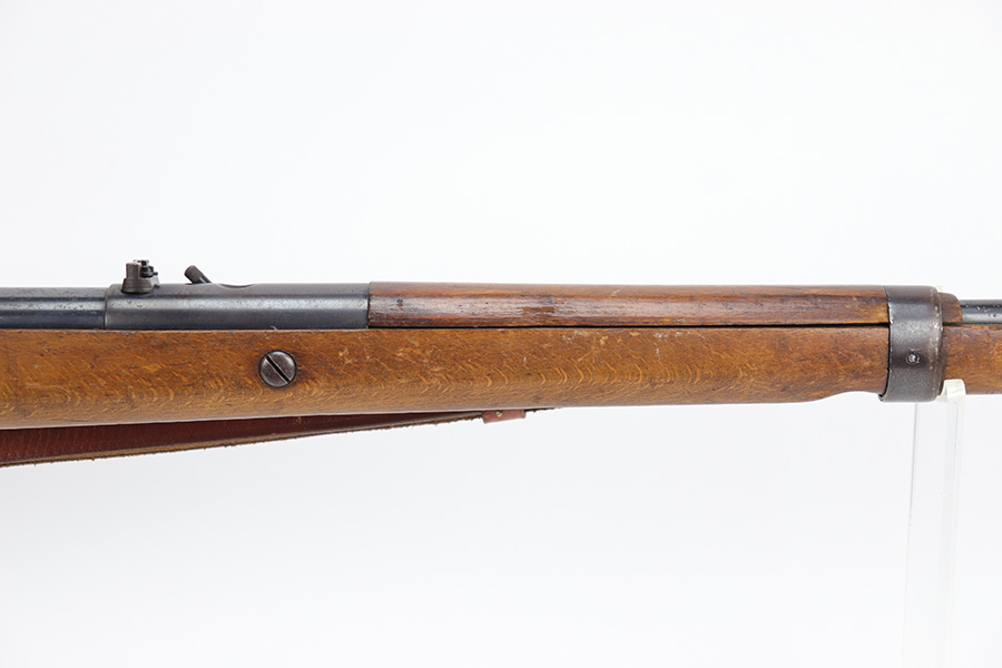 7/20/23 – This is a nice example of a Diana Model 30 Military Training Air Rifle, manufactured in about 1940. The metal parts have retained most of their original bluing with general high edge wear, some spotty oxidation around the muzzle, and some light spotty brown patina on and around the receiver and trigger guard. Heavy spotty oxidation on the butt plate. Very nice wood furniture. Mint bore. Comes with a waffen-proofed reproduction leather sling.