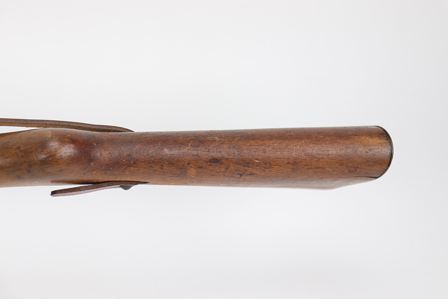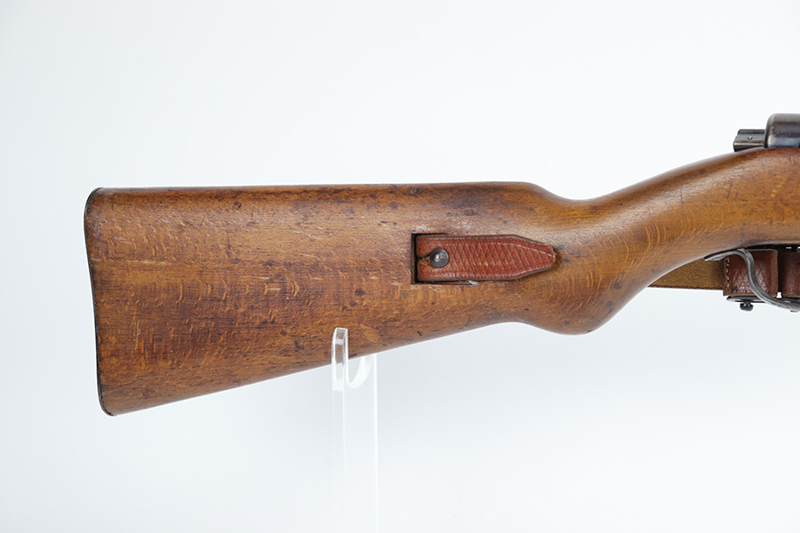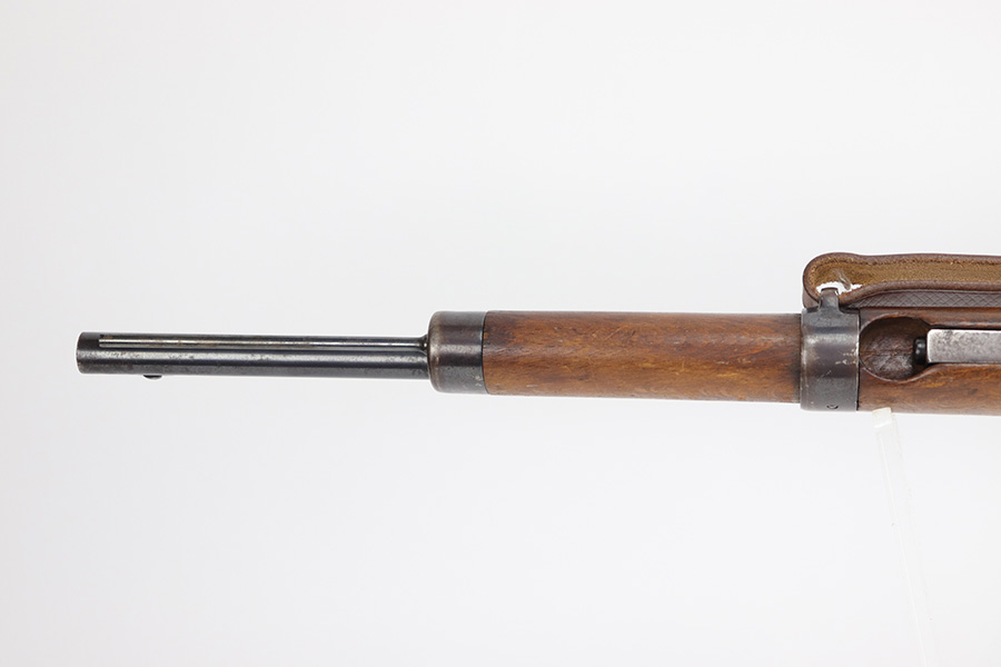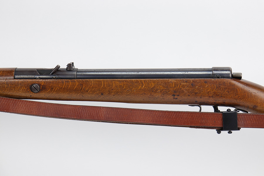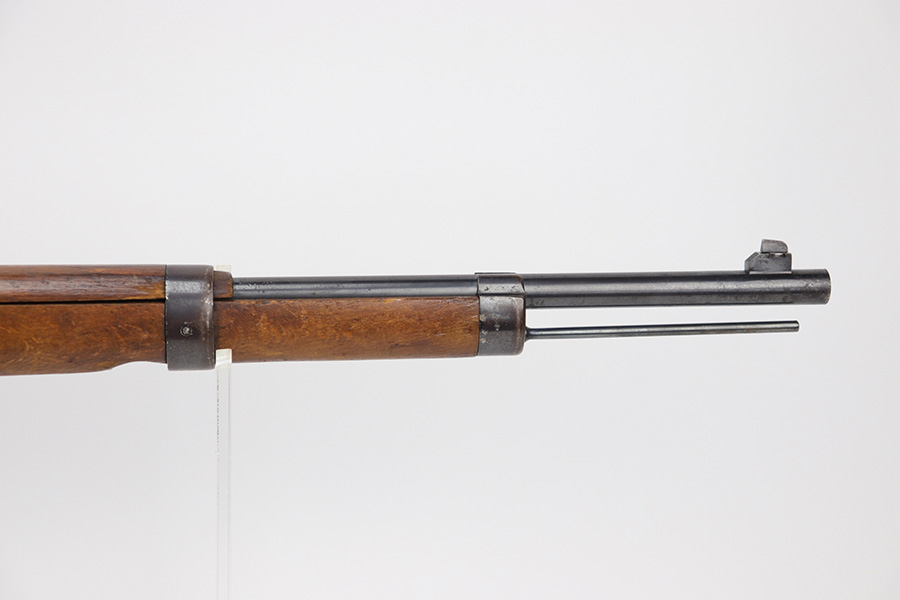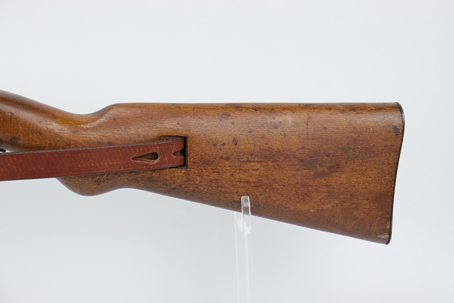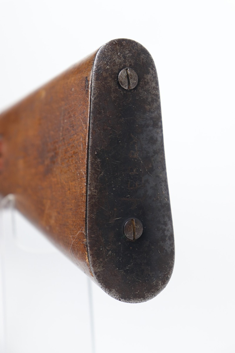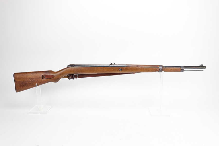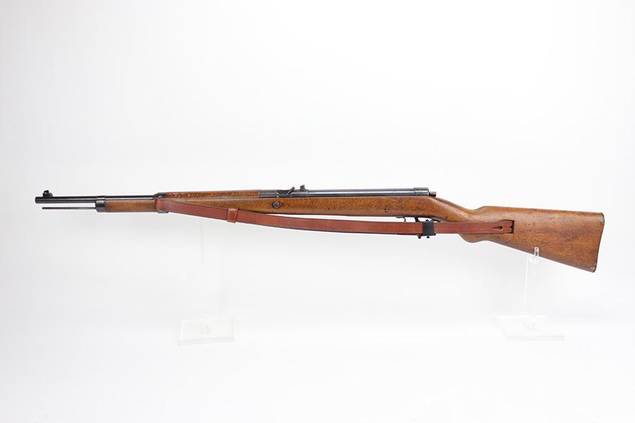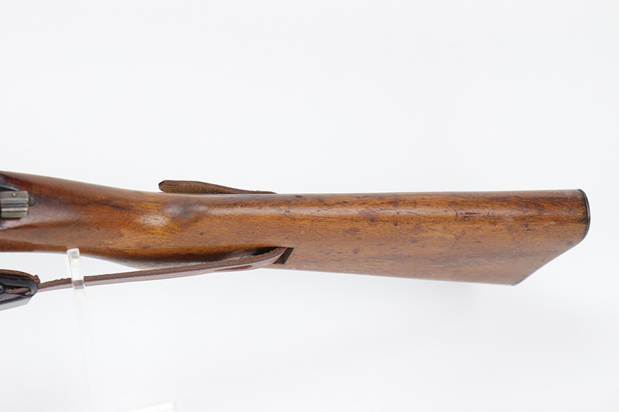 7/20/23 – This is a nice example of a Diana Model 30 Military Training Air Rifle, manufactured in about 1940. The metal parts have retained most of their original bluing with general high edge wear, some spotty oxidation around the muzzle, and some light spotty brown patina on and around the receiver and trigger guard. Heavy spotty oxidation on the butt plate. Very nice wood furniture. Mint bore. Comes with a waffen-proofed reproduction leather sling.