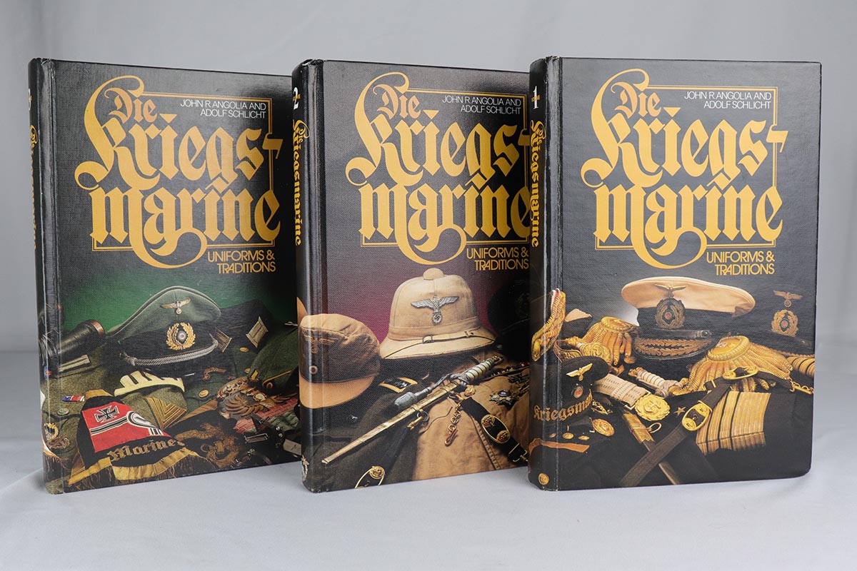 2/22/18 – This is a rare, 1st edition set of reference books entitled “Uniforms & Traditions of the Kriegsmarine”, by John R. Angolia & Adolf Schlicht. These books are in near-mint condition, and very difficult to find in such configuration.