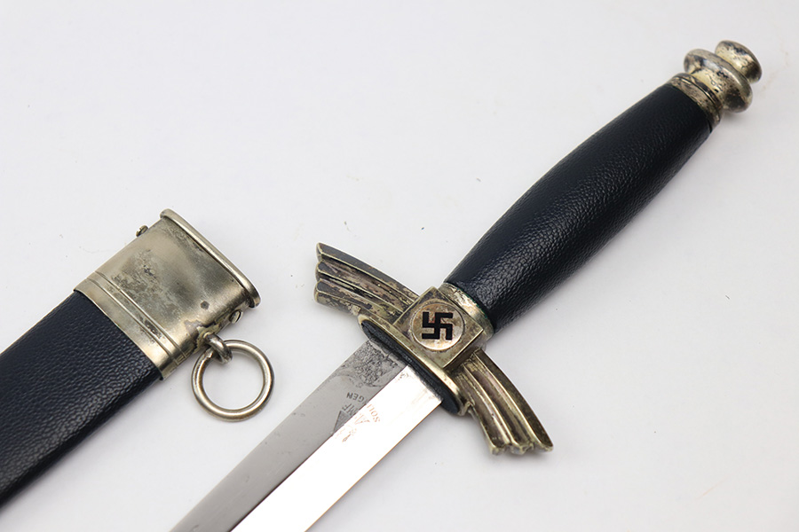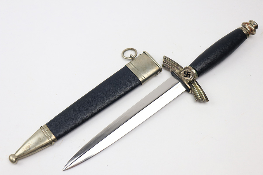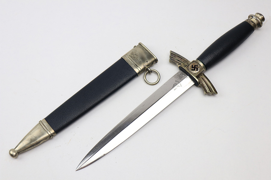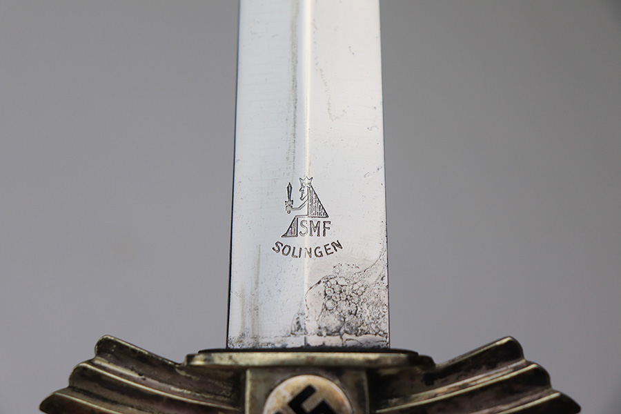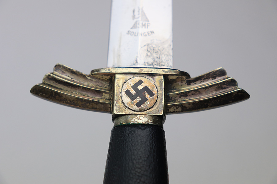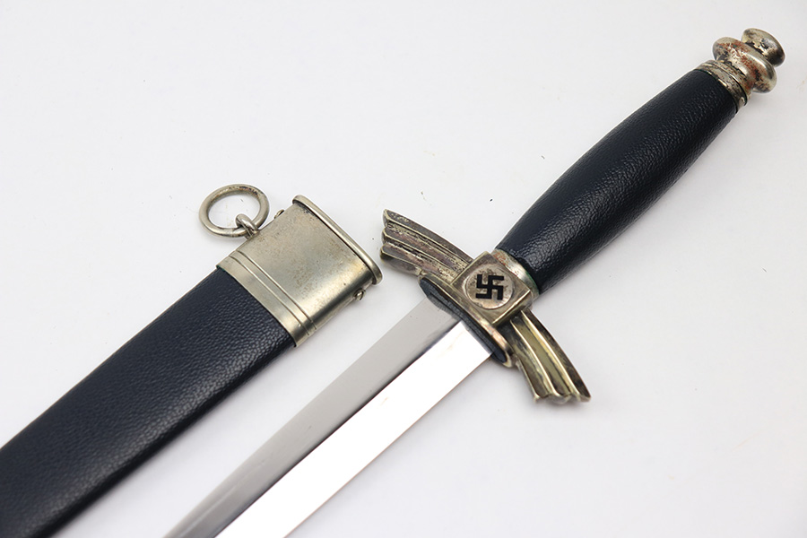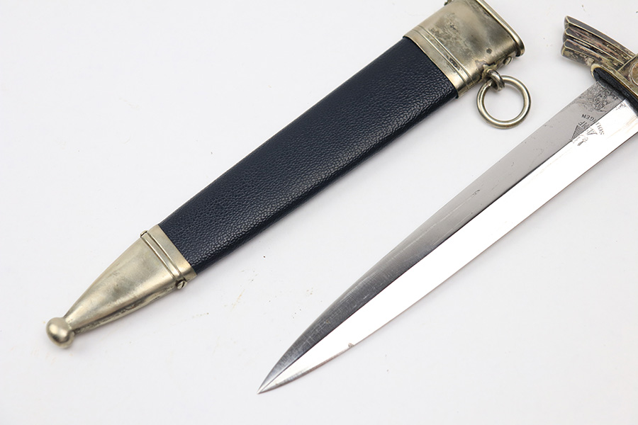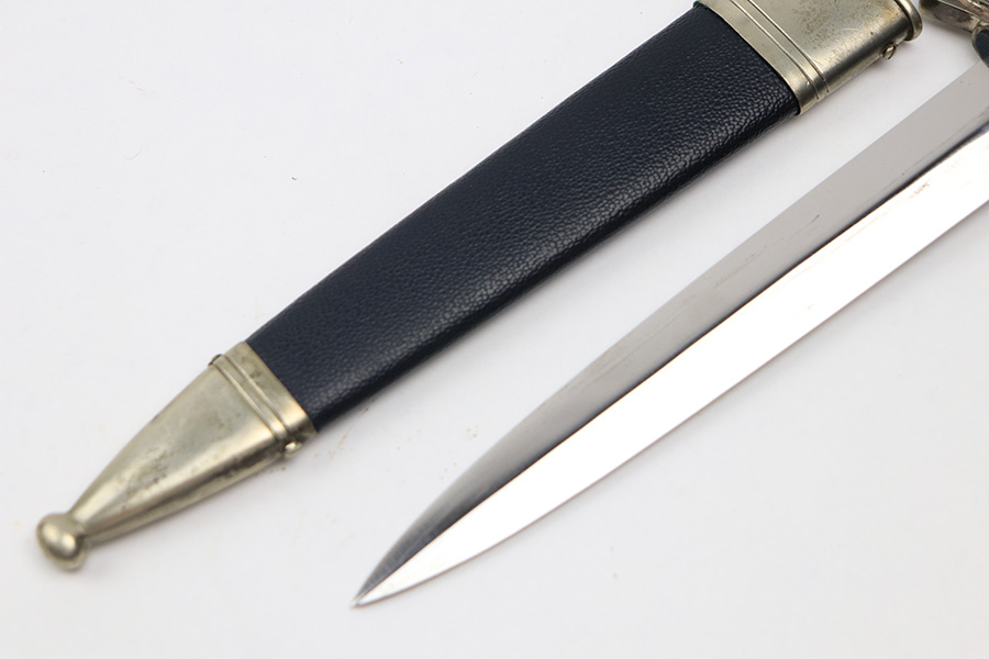 1/17/22 – This is an original, early / pre WW2 production DLV Flyer’s knife. The knife is in great overall condition with a very clean blade and original scabbard. The blade is SMF maker stamped and has great cross-graining. The only downside is some wear and discoloration near the maker stamp on one side of the blade. No signs of sharpening. The blue leather handle is excellent, while the metal hand guard and pommel have discoloration and surface wear throughout. The scabbard has a few mild dents near the toe, but is in great overall condition as shown.