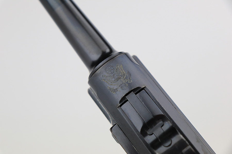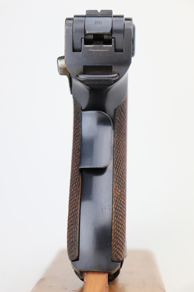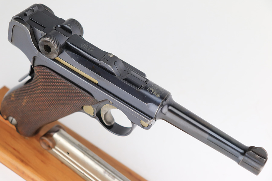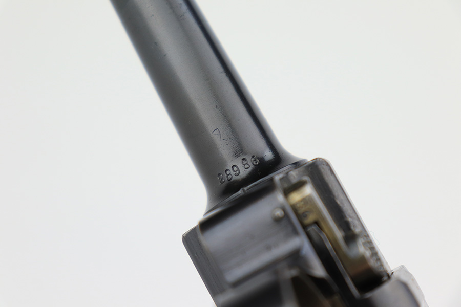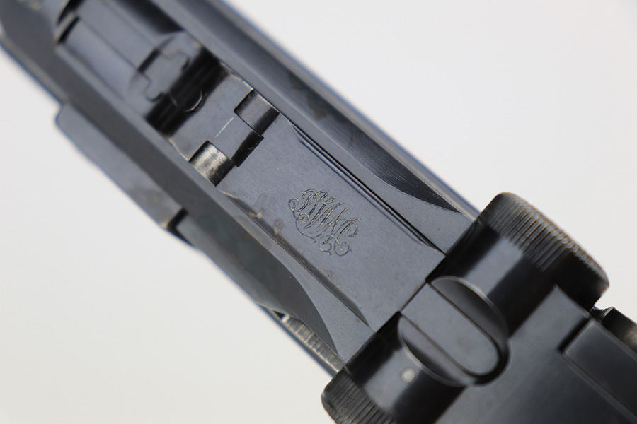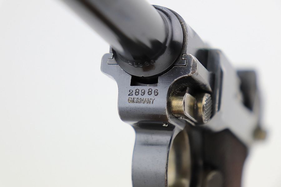 5/17/23 – This is a model 1906, exported to the US before WW1. It has original finish that we would rate at about 96-98%. It is GERMANY marked for export which was required by law at that time. It has the American Eagle crest on the receiver, and DWM on the top of the toggle. This one is fairly rare as it comes in 9mm and the vast majority were made in .30 caliber luger during the pre-war period. It also comes with the correct 9mm marked magazine. The model 1906 has the additional grip safety present. The action is strong and seems fully functional. The bore rates a 7 out of 10 as it has a bit of cloudiness present.