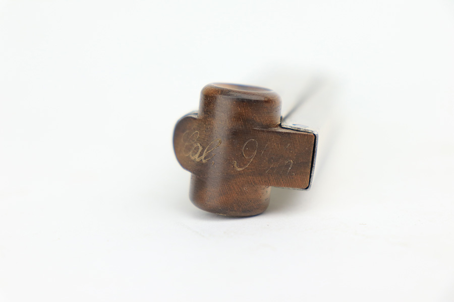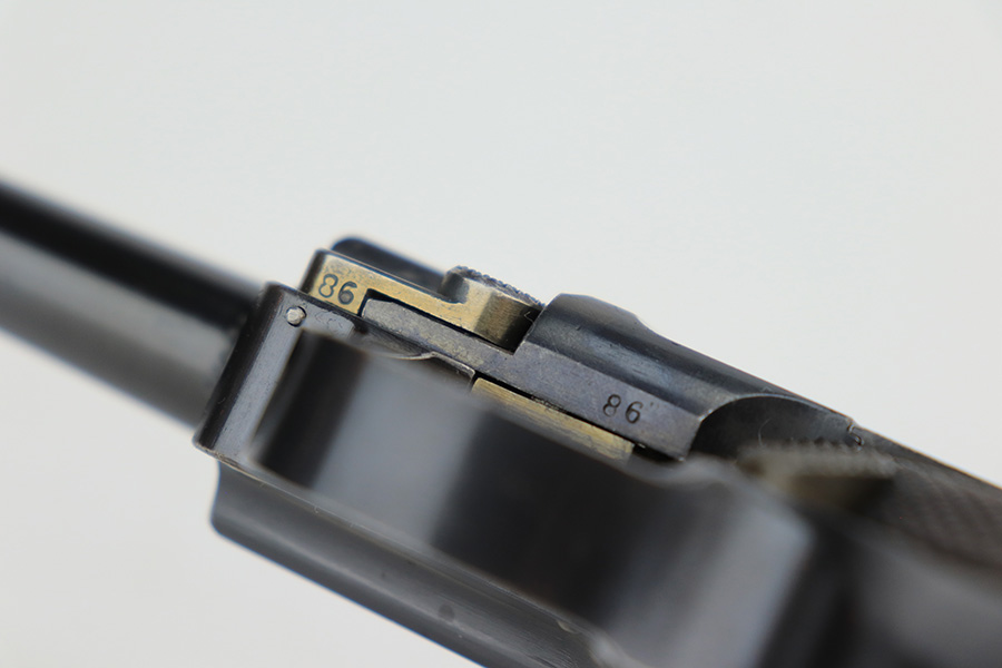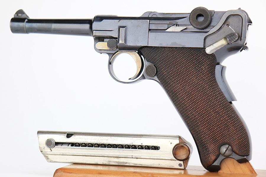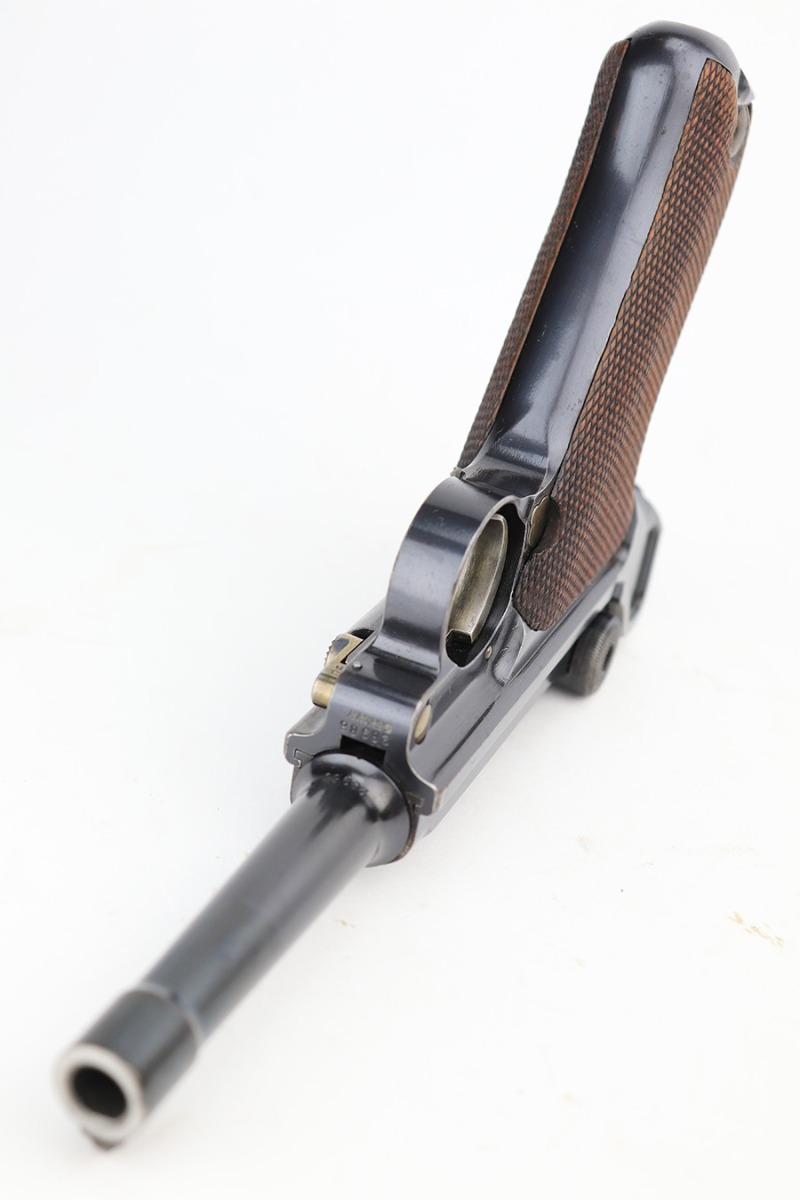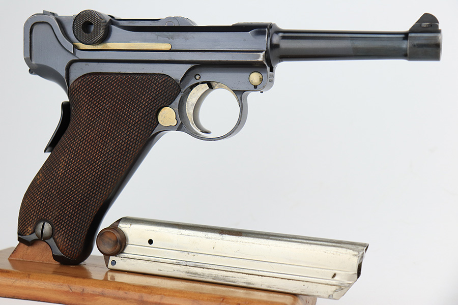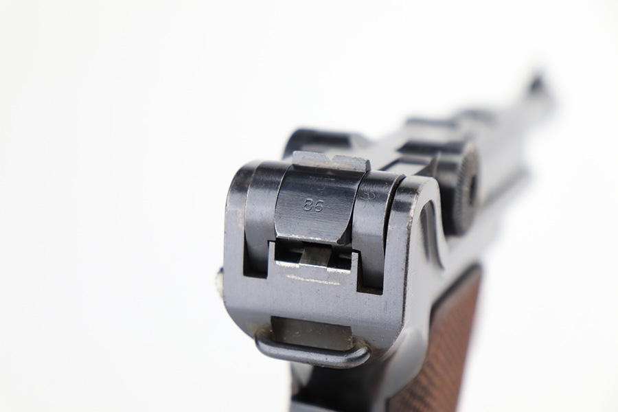 5/17/23 – This is a model 1906, exported to the US before WW1. It has original finish that we would rate at about 96-98%. It is GERMANY marked for export which was required by law at that time. It has the American Eagle crest on the receiver, and DWM on the top of the toggle. This one is fairly rare as it comes in 9mm and the vast majority were made in .30 caliber luger during the pre-war period. It also comes with the correct 9mm marked magazine. The model 1906 has the additional grip safety present. The action is strong and seems fully functional. The bore rates a 7 out of 10 as it has a bit of cloudiness present.