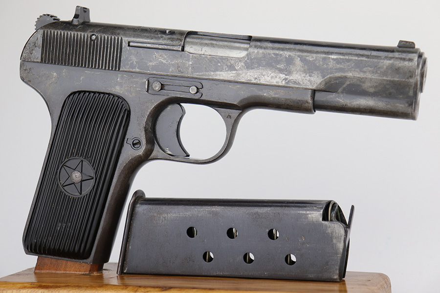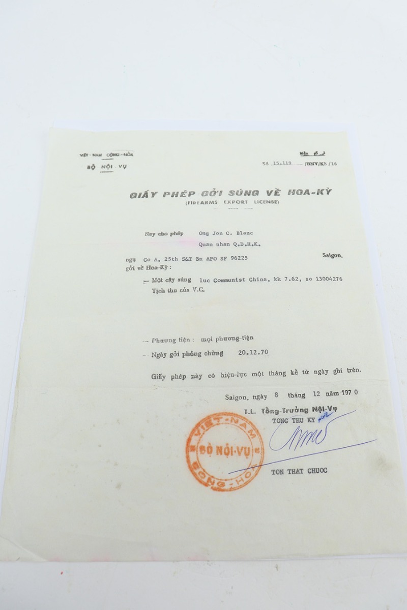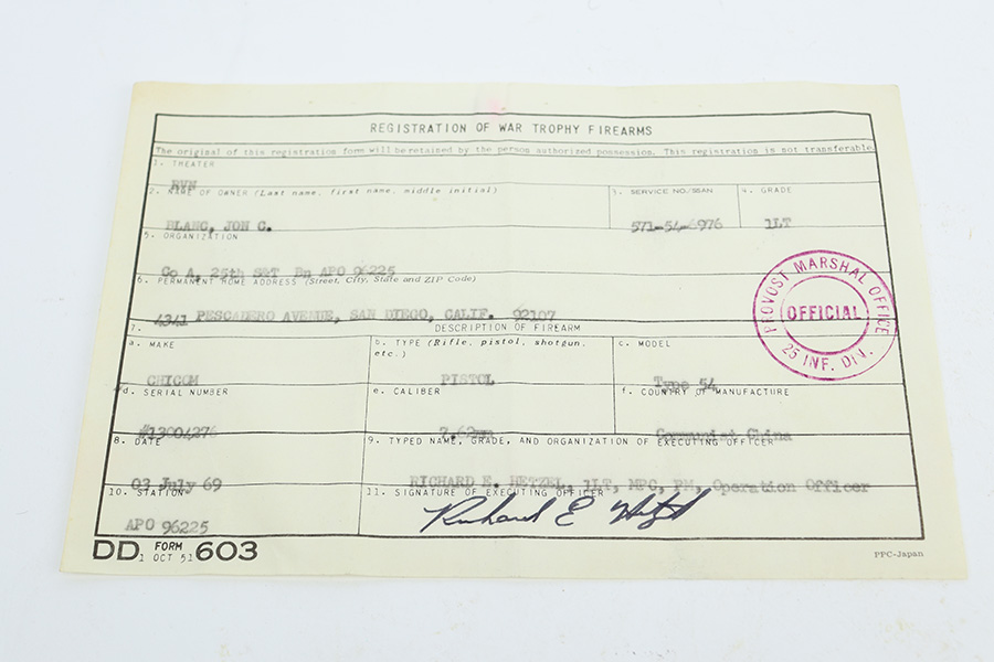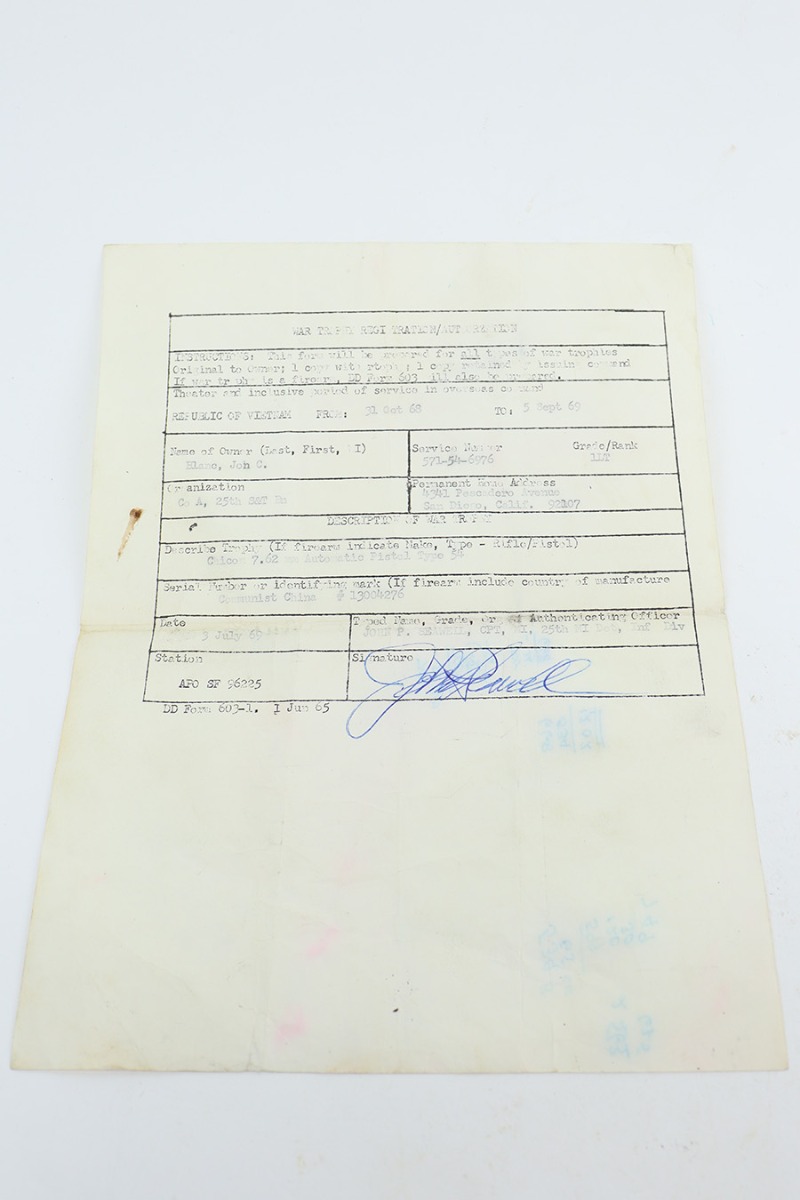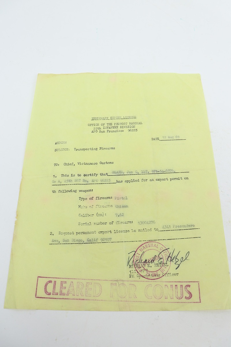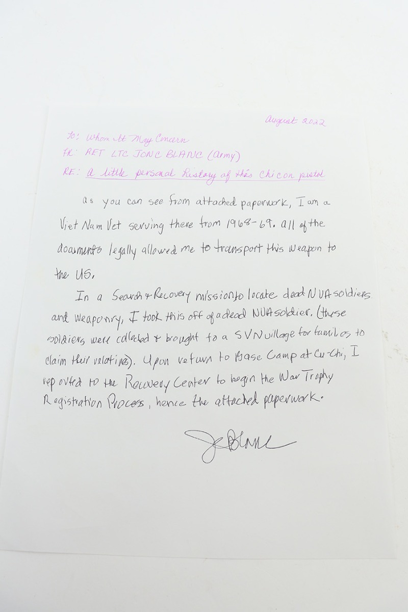 6/14/23 – This is rare and well-documented Chicom Type 54 from the Vietnam War. Matching numbers with original bluing that shows considerable finish loss on both sides of the slide. Minty bore and excellent grips. Made in 1966 with mismatched mag. The documentation includes War Trophy declarations and a signed letter by the vet that brought it back. The letter states that it was recovered off a dead North Vietnamese soldier by LTC Jonc Blanc.