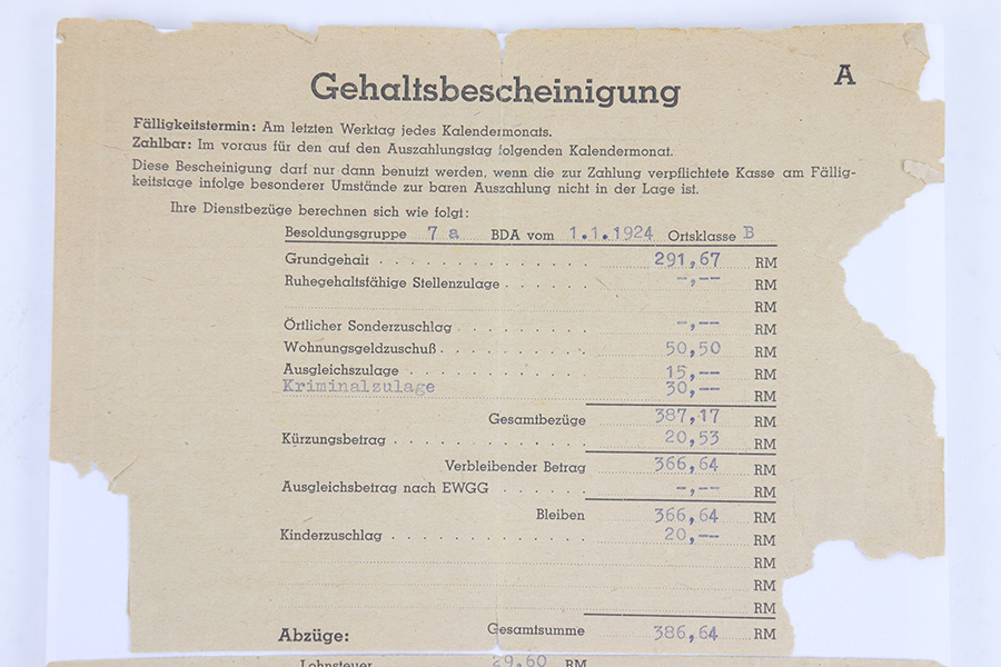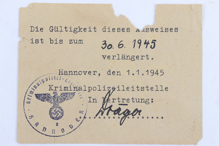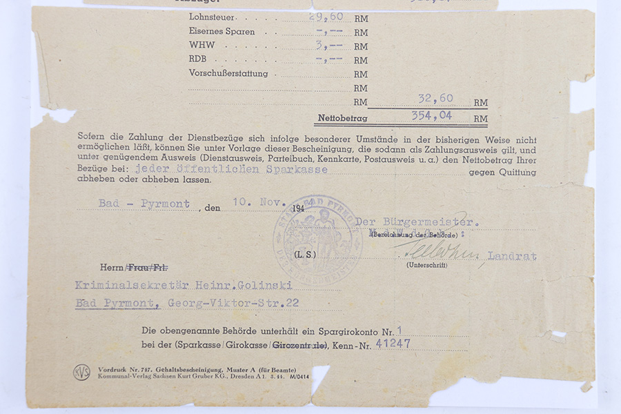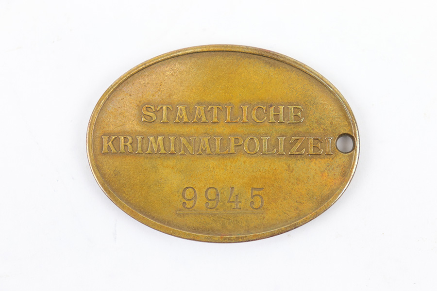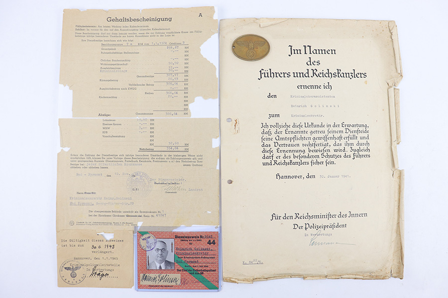 4/3/23 – This is an original WW2 German Criminal Police Warrant Disc with Documentation. The documents are attributed to a German inspector stationed in Bad, Pyrmont Germany. The warrant disc badge number “9945” corresponds to the “service card number” on Heinrich Golinski’s original I.D. card. We also have this person’s original Police “Kriminalskretar” (Criminal Police Secretary) certification document from 1941, and a copy of an original pay statement dated November 10, 1944. The pay statement shows that this Police inspector had children, and the document is signed by the mayor of Bad, Pyrmont. The pay statement is torn at the center-fold, but the other documents are intact and in great condition. Only a handful of warrant discs have been attributed to an actual Police investigator, making this example an extremely rare find. The disc is in great condition as shown. More information can be found on our YouTube channel, where we’ve published a video on this particular offering.